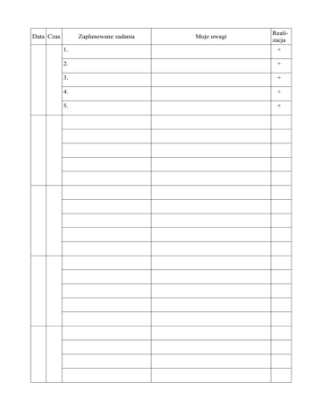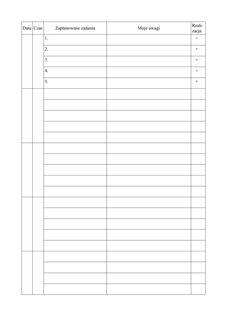Data Czas Zaplanowane zadania Moje uwagi Realizacja 1. + 2. + 3. + 4. + 5. +