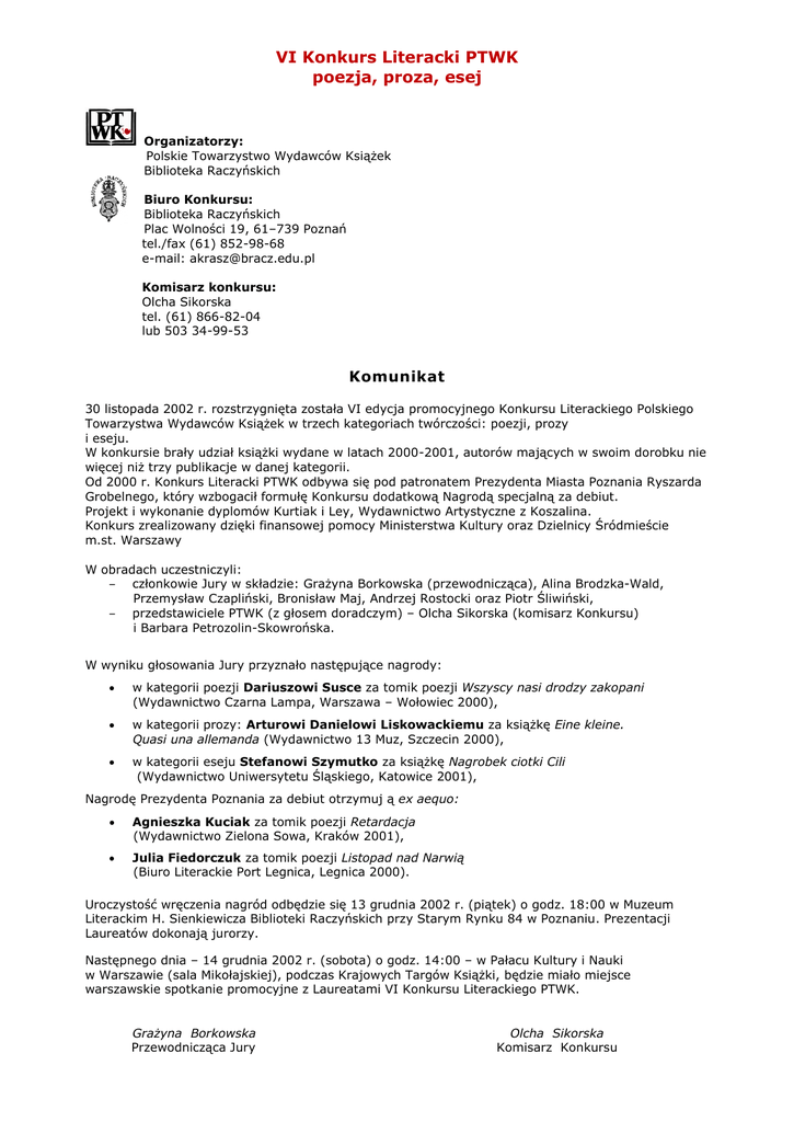VI Konkurs Literacki PTWK poezja, proza, esej Organizatorzy: Polskie Towarzystwo Wydawców Książek Biblioteka Raczyńskich Biuro Konkursu: Biblioteka Raczyńskich Plac Wolności 19, 61–739 Poznań tel./fax (61) 852-98-68 e-mail: [email protected] Komisarz konkursu: Olcha Sikorska tel. (61) 866-82-04 lub 503 34-99-53 Komunikat 30 listopada 2002 r. rozstrzygnięta została VI edycja promocyjnego Konkursu Literackiego Polskiego Towarzystwa Wydawców Książek w trzech kategoriach twórczości: poezji, prozy i eseju. W konkursie brały udział książki wydane w latach 2000-2001, autorów mających w swoim dorobku nie więcej niż trzy publikacje w danej kategorii. Od 2000 r. Konkurs Literacki PTWK odbywa się pod patronatem Prezydenta Miasta Poznania Ryszarda Grobelnego, który wzbogacił formułę Konkursu dodatkową Nagrodą specjalną za debiut. Projekt i wykonanie dyplomów Kurtiak i Ley, Wydawnictwo Artystyczne z Koszalina. Konkurs zrealizowany dzięki finansowej pomocy Ministerstwa Kultury oraz Dzielnicy Śródmieście m.st. Warszawy W obradach uczestniczyli: ‒ członkowie Jury w składzie: Grażyna Borkowska (przewodnicząca), Alina Brodzka-Wald, Przemysław Czapliński, Bronisław Maj, Andrzej Rostocki oraz Piotr Śliwiński, ‒ przedstawiciele PTWK (z głosem doradczym) – Olcha Sikorska (komisarz Konkursu) i Barbara Petrozolin-Skowrońska. W wyniku głosowania Jury przyznało następujące nagrody: w kategorii poezji Dariuszowi Susce za tomik poezji Wszyscy nasi drodzy zakopani (Wydawnictwo Czarna Lampa, Warszawa – Wołowiec 2000), w kategorii prozy: Arturowi Danielowi Liskowackiemu za książkę Eine kleine. Quasi una allemanda (Wydawnictwo 13 Muz, Szczecin 2000), w kategorii eseju Stefanowi Szymutko za książkę Nagrobek ciotki Cili (Wydawnictwo Uniwersytetu Śląskiego, Katowice 2001), Nagrodę Prezydenta Poznania za debiut otrzymuj ą ex aequo: Agnieszka Kuciak za tomik poezji Retardacja (Wydawnictwo Zielona Sowa, Kraków 2001), Julia Fiedorczuk za tomik poezji Listopad nad Narwią (Biuro Literackie Port Legnica, Legnica 2000). Uroczystość wręczenia nagród odbędzie się 13 grudnia 2002 r. (piątek) o godz. 18:00 w Muzeum Literackim H. Sienkiewicza Biblioteki Raczyńskich przy Starym Rynku 84 w Poznaniu. Prezentacji Laureatów dokonają jurorzy. Następnego dnia – 14 grudnia 2002 r. (sobota) o godz. 14:00 – w Pałacu Kultury i Nauki w Warszawie (sala Mikołajskiej), podczas Krajowych Targów Książki, będzie miało miejsce warszawskie spotkanie promocyjne z Laureatami VI Konkursu Literackiego PTWK. Grażyna Borkowska Przewodnicząca Jury Olcha Sikorska Komisarz Konkursu Laudacja W szóstej edycji Konkursu Literackiego Polskiego Towarzystwa Wydawców Książek, na posiedzeniu w dniu 30 listopada 2002 r., Jury przyznało następujące nagrody: W KATEGORII POEZJI Dariuszowi Susce, autorowi tomiku poetyckiego Wszyscy nasi drodzy zakopani za wiersze głęboko zanurzone w literackiej tradycji, będące frapującą odpowiedzią na doświadczenia lekturowe, śmiałym głosem w dialogu z Mistrzami, popisem formalnej wirtuozerii, a jednocześnie przeszywającym, bolesnym dokumentem własnego życia, wyrazem tragicznej świadomości, duchowym pojedynkiem ze śmiercią i złem; za wiersze wyrwane rzeczywistości, ciemne, lecz nie natrętnie pesymistyczne, naznaczone moralną wrażliwością, wypatrujące nadziei, lecz nieskore do łatwych pocieszeń; za wiersze pełne gorzkiej prawdy i pięknej grozy. W KATEGORII PROZY Arturowi Danielowi Liskowackiemu, autorowi Eine kleine. Quasi una allemanda za podjęcie zapomnianego tematu szczecińskich Niemców w powieści, która dzięki ożywczemu duchowi groteski rozbija patos Wielkiej Historii, lecz nie pozbawia sensu biografii pojedynczych ludzi; nastraja nieufnie wobec mitologii małych ojczyzn, lecz zachowuje lojalność wobec dziejów szczecińskiej zbiorowości; przywodzi na myśl kompozycyjną złożonością partię szachów, a zarazem pozostaje historią wciągającą, gęstą i ważną. W KATEGORII ESEJU Stefanowi Szymutce, autorowi książki Nagrobek ciotki Ciii za dygresyjną opowieść o złudności odzyskiwania czasu utraconego, za filozoficzny esej o odklejaniu się języka od rzeczy i za pełną czułości gawędę wspomnieniową o przodkach, dzieciństwie i Śląsku, dzięki której autor dochodzi do zgody z własnym wątpieniem. NAGRODĘ SPECJALNĄ PREZYDENTA MIASTA POZNANIA ZA DEBIUT przyznano ex aequo: Agnieszce Kuciak, autorce tomiku Retardacja za poezję, w której spotykają się, z imponującym artystycznym skutkiem - literacka erudycja, uczoność i respekt dla tradycji, precyzja wypowiedzi oraz wersyfikacyjna maestria z głębokim i na wskroś osobistym, a zarazem dyskretnie osłoniętym indywidualnym przeżyciem; za poezję, w której radosnemu dojrzewaniu form towarzyszy przesycona smutkiem i refleksją dojrzałość emocji. Julii Fiedorczuk, autorce tomiku Listopad nad Narwią (Wydaw. Port Legnica, Legnica 2000) za wiersze, w których toczy się subtelny dialog między światem zewnętrznym i wewnętrznym autorki, gdzie niepospolita wrażliwość na szczegół i egzystencjalny konkret znajduje wyraz w języku pełnym znaczeniowych odcieni i łagodnych niuansów, w obrazach nakreślonych linią delikatną i precyzyjną, w trafnych, ściszonych metaforach; za poezję kobiecą, w której kobiecość oznacza talent jasnego widzenia i harmonizowania sprzeczności. O Laureatach VI Konkursu Literackiego PTWK Dariusz Suska z wykształcenia fizyk po uniwersytetach Wrocławskim i Warszawskim, z zawodu redaktor w dziale kultury „Gazety Wyborczej”. Poeta, autor m.in. tomów wierszy Rzeczy, które były światem (1992) oraz DB 6160221 (1997). Tom Wszyscy nasi drodzy zakopani (Czarna Lampa, 2000) był nominowany do nagrody NIKE. Jego wiersze były także publikowane w kilku antologiach polskich i zagranicznych. Jest w trakcie przygotowywania zbioru opowiadań pt. Czysta ziemia. Artur Daniel Liskowacki, proza