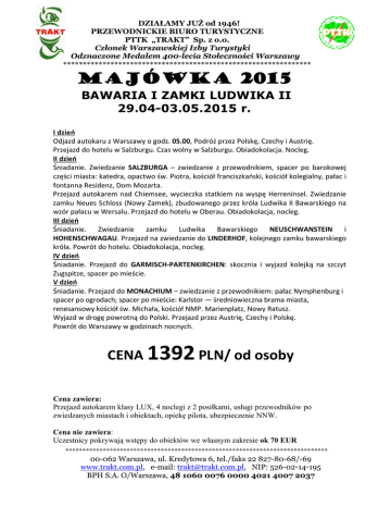 DZIAŁAMY JUŻ od 1946! PRZEWODNICKIE BIURO TURYSTYCZNE PTTK „TRAKT” Sp. z o.o. Członek Warszawskiej Izby Turystyki Odznaczone Medalem 400-lecia Stołeczności Warszawy *************************************************************** MAJÓWKA 2015 BAWARIA I ZAMKI LUDWIKA II 29.04-03.05.2015 r. I dzień Odjazd autokaru z Warszawy o godz. 05.00, Podróż przez Polskę, Czechy i Austrię. Przejazd do hotelu w Salzburgu. Czas wolny w Salzburgu. Obiadokolacja. Nocleg. II dzień Śniadanie. Zwiedzanie SALZBURGA – zwiedzanie z przewodnikiem, spacer po barokowej części miasta: katedra, opactwo św. Piotra, kościół franciszkański, kościół kolegialny, pałac i fontanna Residenz, Dom Mozarta. Przejazd autokarem nad Chiemsee, wycieczka statkiem na wyspę Herreninsel. Zwiedzanie zamku Neues Schloss (Nowy Zamek), zbudowanego przez króla Ludwika II Bawarskiego na wzór pałacu w Wersalu. Przejazd do hotelu w Oberau. Obiadokolacja, nocleg. III dzień Śniadanie. Zwiedzanie zamku Ludwika Bawarskiego NEUSCHWANSTEIN i HOHENSCHWAGAU. Przejazd na zwiedzanie do LINDERHOF, kolejnego zamku bawarskiego króla. Powrót do hotelu. Obiadokolacja, nocleg. IV dzień Śniadanie. Przejazd do GARMISCH-PARTENKIRCHEN: skocznia i wyjazd kolejką na szczyt Zugspitze, spacer po mieście. V dzień Śniadanie. Przejazd do MONACHIUM – zwiedzanie z przewodnikiem: pałac Nymphenburg i spacer po ogrodach; spacer po mieście: Karlstor — średniowieczna brama miasta, renesansowy kościół św. Michała, kościół NMP. Marienplatz, Nowy Ratusz. Wyjazd w drogę powrotną do Polski. Przejazd przez Austrię, Czechy i Polskę. Powrót do Warszawy w godzinach nocnych. CENA 1392 PLN/ od osoby Cena zawiera: Przejazd autokarem klasy LUX, 4 noclegi z 2 posiłkami, usługi przewodników po zwiedzanych miastach i obiektach, opiekę pilota, ubezpieczenie NNW. Cena nie zawiera: Uczestnicy pokrywają wstępy do obiektów we własnym zakresie ok 70 EUR ***************************************************************************** 00-062 Warszawa, ul. Kredytowa 6, tel./faks 22 827-80-68/-69 www.trakt.com.pl, e-mail: [email protected], NIP: 526-02-14-195 BPH S.A. O/Warszawa, 48 1060 0076 0000 4021 4007 2037