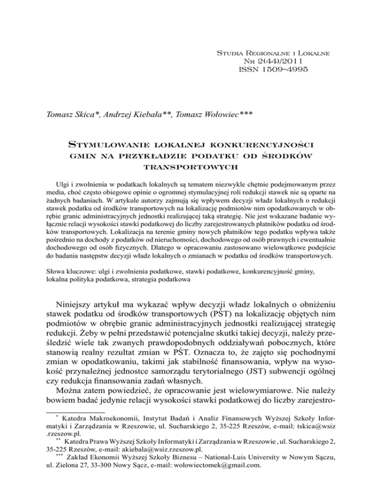 Studia Regionalne i Lokalne Nr 2(44)/2011 ISSN 1509–4995 Tomasz Skica*, Andrzej Kiebała**, Tomasz Wołowiec*** STYMULOWANIE LOKALNEJ KONKURENCYJNOŚCI GMIN NA PRZYKŁADZIE PODATKU OD ŚRODKÓW TRANSPORTOWYCH Ulgi i zwolnienia w podatkach lokalnych są tematem niezwykle chętnie podejmowanym przez media, choć często obiegowe opinie o ogromnej stymulacyjnej roli redukcji stawek nie są oparte na żadnych badaniach. W artykule autorzy zajmują się wpływem decyzji władz lokalnych o redukcji stawek podatku od środków transportowych na lokalizację podmiotów nim opodatkowanych w obrębie granic administracyjnych jednostki realizującej taką strategię. Nie jest wskazane badanie wyłącznie relacji wysokości stawki podatkowej do liczby zarejestrowanych płatników podatku od środków transportowych. Lokalizacja na terenie gminy nowych płatników tego podatku wpływa także pośrednio na dochody z podatków od nieruchomości, dochodowego od osób prawnych i ewentualnie dochodowego od osób fizycznych. Dlatego w opracowaniu zastosowano wielowątkowe podejście do badania następstw decyzji władz lokalnych o zmianach w podatku od środków transportowych. Słowa kluczowe: ulgi i zwolnienia podatkowe, stawki podatkowe, konkurencyjność gminy, lokalna polityka podatkowa, strategia podatkowa Niniejszy artykuł ma wykazać wpływ decyzji władz lokalnych o obniżeniu stawek podatku od środków transportowych (PŚT) na lokalizację objętych nim podmiotów w obrębie granic administracyjnych jednostki realizującej strategię redukcji. Żeby w pełni przedstawić potencjalne skutki takiej decyzji, należy prześledzić wiele tak zwanych prawdopodobnych oddziaływań pobocznych, które stanowią realny rezultat zmian w PŚT. Oznacza to, że zajęto się pochodnymi zmian w opodatkowaniu, takimi jak stabilność finansowania, wpływ na wysokość przynależnej jednostce samorządu terytorialnego (JST) subwencji ogólnej czy redukcja finansowania zadań własnych. Można zatem powiedzieć, że opracowanie jest wielowymiarowe. Nie należy bowiem badać jedynie relacji wysokości stawki podatkowej do liczby zarejestro* Katedra Makroekonomii, Instytut Badań i Analiz Finansowych Wyższej Szkoły Informatyki i Zarządzania w Rzeszowie, ul. Sucharskiego 2, 35-225 Rzeszów, e-mail: tskica@wsiz .rzeszow.pl. ** Katedra Prawa Wyższej Szkoły Informatyki i Zarządzania w Rzeszowie , ul. Sucharskiego 2, 35-225 Rzeszów, e-mail: [email protected]. *** Zakład Ekonomii Wyższej Szkoły Biznesu – National-Luis University w Nowym Sączu, ul. Zielona 27, 33-300 Nowy Sącz, e-mail: [email protected]. STYMULOWANIE LOKALNEJ KONKURENCYJNOŚCI GMIN… 119 wanych płatników PŚT. Przeciwko takiemu ujęciu przemawia choćby fakt, że wzrost na terenie JST liczby podmiotów objętych tym podatkiem rzutuje pośrednio również na dochody z podatków od nieruchomości, dochodowego od osób prawnych i ewentualnie dochodowego od osób fizycznych. Wskazaną okoliczność należy brać pod uwagę przy ustalaniu następstw decyzji władz lokalnych o zmianach w PŚT. W prezentowanym opracowaniu wykorzystano analizę studialną i autorskie badania empiryczne w zakresie kształtowania optymalnego wzorca prorozwojowej polityki podatkowej na poziomie lokalnym. Poddano weryfikacji hipotezę o skuteczności instrumentów polityki fiskalnej w stymulowaniu lokalnej gospodarki. Uzyskane w ten sposób rezultaty pozwalają na kompleksową ocenę siły oddziaływania stymulacyjnej funkcji podatków lokalnych. Konstrukcja podatku od środków transportowych PŚT jest przykładem podatku bezpośredniego typu majątkowego. Oznacza to, że opodatkowaniu nim podlegają określone składniki majątku, a za podatnika uznaje się podmiot, do którego należą. Opodatkowanie wiąże się z posiadaniem określonych w ustawie środków transportu1. W art. 8 ustawa o podatkach i opłatach lokalnych wskazuje siedem rodzajów środków transportu, których posiadanie wiąże się z koniecznością opodatkowania. Należy przy tym zgodzić się z poglądem wyrażonym w orzecznictwie, że organ podatkowy nie może sam na podstawie np. przeprowadzonych przez siebie oględzin ustalać, czy dany samochód ma inny charakter, rodzaj i ładowność niż przyjęto w dowodzie rejestracyjnym, jeżeli wcześniej w stosownym trybie nie podważy tego dowodu2. Organ podatkowy nie ma bowiem uprawnień (formalnych kompetencji) do dokonywania tego rodzaju ustaleń, co oznacza, że przy określeniu skutków podatkowych wiążące są informacje z dowodu rejestracyjnego. Wynika to z faktu, że rejestracja pojazdu odbywa się w trybie postępowania administracyjnego zakończonego wydaniem decyzji. Decyzja taka korzysta zaś z domniemania prawdziwości, dopóki nie zostanie wyeliminowana z obrotu prawnego we właściwym ustawowo trybie (Miszczuk 2009). Obowiązek podatkowy co do zasady obejmuje właścicieli wskazanych wyżej środków transportu. Pamiętać jednak należy, że jego płatnikami są również jednostki organizacyjne, na które środek transportu został zarejestrowany, oraz posiadacze powierzonych przez zagraniczną osobę fizyczną lub prawną środków transportowych, które zostały zarejestrowane na terytorium Rzeczypospolitej Polskiej. Rejestracja pojazdu stanowi tylko dopuszczenie pojazdu do ruchu3. 1 Podatek od środków transportowych reguluje ustawa z 12 stycznia 1991 r. o podatkach i opłatach lokalnych (Dz.U. z 2010 r. nr 95 poz. 613 z późn. zm.). 2 Zob. np. wyrok NSA we Wrocławiu z 17 marca 2000 r., sygn. akt I SA/Wr 1256/99 – LEX nr 60449. 3 Art. 71 ust. 1 ustawy z 20 czerwca 1997 r., Prawo o ruchu drogowym (Dz.U. z 2005 r. nr 108 poz. 908 z późn. zm.). 120 TOMASZ SKICA, ANDRZEJ KIEBAŁA, TOMASZ WOŁOWIEC Może do niej dojść, jeżeli pojazd spełnia określone przepisami warunki techniczne. Rejestracji dokonuje na wniosek właściciela starosta właściwy ze względu na miejsce jego zamieszkania lub siedzibę4. Pamiętać jedn