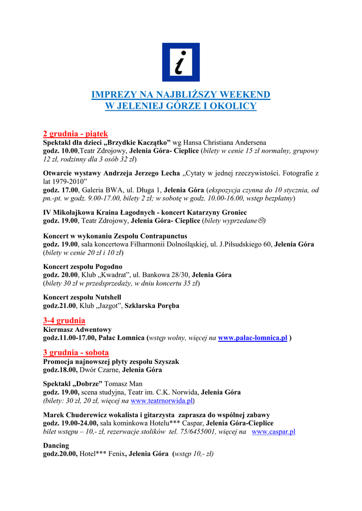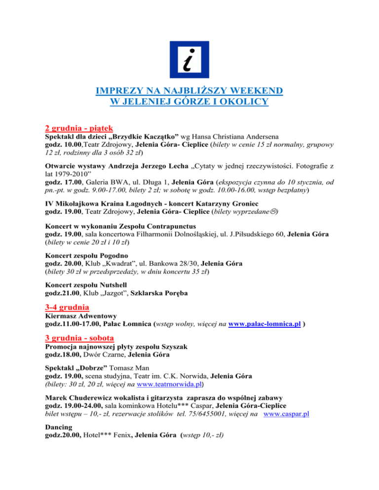 IMPREZY NA NAJBLIŻSZY WEEKEND W JELENIEJ GÓRZE I OKOLICY 2 grudnia - piątek Spektakl dla dzieci „Brzydkie Kaczątko” wg Hansa Christiana Andersena godz. 10.00,Teatr Zdrojowy, Jelenia Góra- Cieplice (bilety w cenie 15 zł normalny, grupowy 12 zł, rodzinny dla 3 osób 32 zł) Otwarcie wystawy Andrzeja Jerzego Lecha „Cytaty w jednej rzeczywistości. Fotografie z lat 1979-2010” godz. 17.00, Galeria BWA, ul. Długa 1, Jelenia Góra (ekspozycja czynna do 10 stycznia, od pn.-pt. w godz. 9.00-17.00, bilety 2 zł; w sobotę w godz. 10.00-16.00, wstęp bezpłatny) IV Mikołajkowa Kraina Łagodnych - koncert Katarzyny Groniec godz. 19.00, Teatr Zdrojowy, Jelenia Góra- Cieplice (bilety wyprzedane) Koncert w wykonaniu Zespołu Contrapunctus godz. 19.00, sala koncertowa Filharmonii Dolnośląskiej, ul. J.Piłsudskiego 60, Jelenia Góra (bilety w cenie 20 zł i 10 zł) Koncert zespołu Pogodno godz. 20.00, Klub „Kwadrat”, ul. Bankowa 28/30, Jelenia Góra (bilety 30 zł w przedsprzedaży, w dniu koncertu 35 zł) Koncert zespołu Nutshell godz.21.00, Klub „Jazgot”, Szklarska Poręba 3-4 grudnia Kiermasz Adwentowy godz.11.00-17.00, Pałac Łomnica (wstęp wolny, więcej na www.palac-lomnica.pl ) 3 grudnia - sobota Promocja najnowszej płyty zespołu Szyszak godz.18.00, Dwór Czarne, Jelenia Góra Spektakl „Dobrze” Tomasz Man godz. 19.00, scena studyjna, Teatr im. C.K. Norwida, Jelenia Góra (bilety: 30 zł, 20 zł, więcej na www.teatrnorwida.pl) Marek Chuderewicz wokalista i gitarzysta zaprasza do wspólnej zabawy godz. 19.00-24.00, sala kominkowa Hotelu*** Caspar, Jelenia Góra-Cieplice bilet wstępu – 10,- zł, rezerwacje stolików tel. 75/6455001, więcej na www.caspar.pl Dancing godz.20.00, Hotel*** Fenix, Jelenia Góra (wstęp 10,- zł) DJ Spaso, Twardy, Witek godz.20.00, Klub „Kwadrat”, Jelenia Góra (wstęp 10 zł) Naaman – koncert godz.21.00, Klub „Jazgot”, Szklarska Poręba (wstęp 10 zł) IV Międzynarodowy Turniej Mikołajkowy Trampkarzy o Puchar Prezydenta Miasta Jeleniej Góry impreza z udziałem 8 zespołów krajowych oraz ekip z Niemiec oraz Czech godz. 9.00-14.00 na hali przy ul. Złotniczej 12, Jelenia Góra Mikołajkowy Turniej Szachowy „Złoty Jelonek” turniej dla dzieci ze szkół podstawowych godz. 9.00 Szkoła Podstawowa Nr 11,ul. Stanisława Moniuszki 9, Jelenia Góra organizator: Klub Szachowy „Jelonka” Jelenia Góra Mecz siatkówki MKS Olimpia Kowary- ULKS Opal, Kudowa Zdrój godz.17.00, hala sportowa, Szkoła Podstawowa nr 1, Kowary 4 grudnia - niedziela Niedzielny Poranek Muzyczny „Mikołaju w jakim mieszkasz kraju?” -koncert godz. 10.00 i 12.00, sala koncertowa, ul. J. Piłsudskiego 60, Jelenia Góra (bilety 10 zł i 5 zł) Akond ze Skwak pokaz mody dzieci w wieku przedszkolnym i ich mam; pokaz uświetni etiuda aktorsko-taneczna do limeryku Edwarda Leara przygotowany przez Zespół „Hayat” godz. 12.00, sala widowiskowa MDK „Muflon”, ul. Cieplicka 172, Jelenia Góra-Sobieszów (wstęp wolny) Spektakl „Tomcio Paluszek” Jerzy Zaborowski godz. 13.00 i 16.00,Pałac Wojanów (bilety:15 zł normalny, grupowy 12 zł, rodzinny dla 3 osób 32 zł) Dzień Anioła „Ludzie to anioły z jednym skrzydłem, dlatego aby się wznieść, musimy trzymać się razem” Maria Konopnicka Anielskie Mikołajki w Centrum Miasta w programie: godz. 16.00, Anioł w mieście, projekcja filmu „Anioł w Krakowie”, reż. Artur Więcek (Polska, 2002) godz. 16.00-17.30, Anielska twórczość, warsztaty artystyczne dla dzieci godz. 17.30, Anioły w religii, wykład o aniołach, prowadzenie ks. Bazyli Sawczuk, godz. 18.00, Lokalne anioły sztuki, licytacja prac plastycznych i spotkanie z ich twórcami godz. 18.30, Anioły w muzyce, Mikołajkowa muzyka w wykonaniu artystów z Przystani Twórczej, godz. 18.50, Spotkanie z Mikołajem, anielskim wysłannikiem niebios godz.19.00, Anioły w literaturze, slam poetycki w wykonaniu aktorów Teatru Odnalezionego; wydarzeniu towarzyszyć będą Anielskie uczynki - rozdawanie oświadczeń woli, zbiórka art. biurowych dla dzieci z Domu Dziecka Dąbrówka, pieniądze uzyskane w wyniku licytacji zostaną przekazane na cel charytatywny dla Jeleniogórskiego Stowarzyszenia Rodzin i Przyjaciół Dzieci z Zespołem Downa. Zapraszamy do wspólnej zabawy! Wszystkim chętnym Mikołaj rozda podarunki (prosimy o kontakt pod tel 696 016 965). Anielskie przebrania mile widziane w Klubie „Kwadrat” przy ul. Bankowej 28/30 w Jeleniej Górze (wstęp wolny) Plugged Jazz godz. 18.00, Klub „Kwadrat”, Jelenia Góra (wstęp wolny) Spektakl „Dobrze” Tomasz Man (bilet normalny 30 zł, ulgowy 20 zł, więcej na www.teatrnorwida.pl ) godz. 19.00, scena studyjna, Teatr im. C.K.Norwida, Jelenia Góra XLI Rajd na Raty – zakończenie sezonu; wyjazd z przystanku „tunel”, MZK Nr 2 godz. 8.24; trasa: Jelenia Góra - Maciejowa (MZK), Maciejowa - Dziwiszów Dolny - Sośnia - „Grób Wandala” - Jelenia Góra, ul. Bankowa; więcej na www.rajdnaraty2011.webreporter.pl organizator: PTTK Odział „Sudety Zachodnie” Halowy Turniej Mikołajkowy Żaków o Puchar Prezydenta Miasta Jeleniej Góry impreza z udziałem 8 zespołów krajowych oraz ekip z Niemiec oraz Czech godz. 9.00-14.00 w hali przy ul. Złotniczej 12, Jelenia Góra WERNISAŻE, WYSTAWY do 4 grudnia Wystawa prac plastycznych dzieci „W promieniach światła ”Galeria „Kolor”, ul. Cieplicka 172, Jelenia Góra-Sobieszów (wstęp wolny) do 9 grudnia Jeleniogórska Ścieżka Filmowa Prezentacja materiałów archiwalnych z okazji 115 lat kin jeleniogórskich Archiwum Państwowe, ul. płk Wacława Kazimierskiego 3, Jelenia Góra do 9 grudnia Wystawa malarstwa Alicji Ochocińskiej (Fraktalika) „Inne Światy” Galeria Małych Form Książnicy Karkonoskiej ul. Bankowa 27, Jelenia Góra do10 grudnia Wystawy fotografii BikeShot ‘2011 Galeria Skene, Teatr im. C.K. Norwida, Al. Wojska Polskiego 38, Jelenia Góra do 15 grudnia IV FOTORUSZENIE wystawa fotograficzna, Al