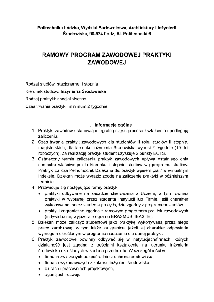 Politechnika Łódzka, Wydział Budownictwa, Architektury i Inżynierii Środowiska, 90-924 Łódź, Al. Politechniki 6 RAMOWY PROGRAM ZAWODOWEJ PRAKTYKI ZAWODOWEJ Rodzaj studiów: stacjonarne II stopnia Kierunek studiów: Inżynieria Środowiska Rodzaj praktyki: specjalistyczna Czas trwania praktyki: minimum 2 tygodnie 1. 2. 3. 4. 5. 6. I. Informacje ogólne Praktyki zawodowe stanowią integralną część procesu kształcenia i podlegają zaliczeniu. Czas trwania praktyk zawodowych dla studentów II roku studiów II stopnia, magisterskich, dla kierunku Inżynieria Środowiska wynosi 2 tygodnie (10 dni roboczych). Za realizację praktyk student uzyskuje 2 punkty ECTS. Ostateczny termin zaliczenia praktyk zawodowych upływa ostatniego dnia semestru właściwego dla kierunku i stopnia studiów wg programu studiów. Praktyki zalicza Pełnomocnik Dziekana ds. praktyk wpisem „zal.” w wirtualnym indeksie. Dziekan może wyrazić zgodę na zaliczenie praktyki w późniejszym terminie. Przewiduje się następujące formy praktyk: praktyki odbywane na zasadzie skierowania z Uczelni, w tym również praktyki w wybranej przez studenta Instytucji lub Firmie, jeśli charakter wykonywanej przez studenta pracy będzie zgodny z programem studiów praktyki zagraniczne zgodne z ramowym programem praktyk zawodowych (indywidualne, wyjazd z programu ERASMUS, IEASTE). Dziekan może zaliczyć studentowi jako praktykę wykonywaną przez niego pracę zarobkową, w tym także za granicą, jeżeli jej charakter odpowiada wymogom określonym w programie nauczania dla danej praktyki. Praktyki zawodowe powinny odbywać się w instytucjach/firmach, których działalność jest zgodna z treściami kształcenia na kierunku inżynieria środowiska określonych w kartach przedmiotu. W szczególności w: firmach związanych bezpośrednio z ochroną środowiska, firmach wykonawczych z zakresu inżynierii środowiska, biurach i pracowniach projektowych, agencjach rozwoju, zespołach przygotowujących opracowania i dokumenty planistyczne na poziomach lokalnym, regionalnym, krajowym, z zakresu wodociągów i kanalizacji, przedsiębiorstwach gospodarki komunalnej i mieszkaniowej, biurach geodezyjnych, firmach konsultingowych i doradczych, instytucjach i agencjach Unii Europejskiej. 7. Student może sam wybrać instytucję, w której zamierza odbyć praktykę lub skorzystać z pośrednictwa opiekuna praktyk. 8. W przypadku samodzielnego wyboru instytucji student zobowiązany jest do jej akceptacji przez opiekuna praktyk. 9. Studenci odbywający praktykę zawodową mają obowiązek ubezpieczyć się od skutków następstw nieszczęśliwych wypadków. Ubezpieczenia tego dokonują studenci indywidualnie. 10. Z tytułu odbywania praktyk student nie otrzymuje wynagrodzenia, z wyłączeniem sytuacji, gdy zaliczając praktykę jest zatrudniony w firmie na podstawie odrębnych umów zawartych bezpośrednio pomiędzy firmą a studentem. 11. Wydział nie zwraca studentowi kosztów z tytułu odbywania praktyki. II. Cel, zadania oraz zakres tematyczny praktyki 1. Celem praktyki jest zapoznanie studenta z praktycznym wymiarem zawodu do wykonywania którego uprawniony będzie po ukończeniu kierunku inżynieria środowiska. Cele szczegółowe obejmują: poszerzenie i weryfikację wiedzy zdobytej na studiach oraz rozwijanie umiejętności jej praktycznego wykorzystania, zapoznanie się z zasadami funkcjonowania różnych instytucji oraz ze specyfiką pracy na różnych stanowiskach, przygotowanie do pracy w zespołach oraz radzenia sobie w nietypowych sytuacjach zawodowych (konfliktowych), przygotowanie studenta do samodzielnej pracy oraz odpowiedzialności za powierzone mu zadania, ułatwienie przyszłemu absolwentowi znalezienia pracy poprzez osobisty kontakt z potencjalnymi pracodawcami i możliwość zaprezentowania merytorycznego i praktycznego przygotowania do wykonywania zawodu, umożliwienie pozyskania materiałów do pracy dyplomowej. Zakres zadań i prac wykonywanych w czasie praktyki powinien być dostosowany do profilu i charakteru działalności jednostki, w której jest odbywana praktyka i powinien obejmować wybrane zagadnienia z zakresu zamieszczonego w punktach 2 i 3. Do podstawowych zadań praktyki zawodowej należy zapoznanie studenta z: zakresem działania i funkcjonowaniem Instytucji oraz przepisami BHP przepisami prawnymi obowiązującymi w inżynierii środowiska, technikami i sposobami wykonywania prac dokumentacyjnych i projektowych oraz procesem uzgadniania decyzji projektowych i realizacyjnych, narzędziami stosowanymi w zagadnieniach związanych z gospodarką wodno – ściekową, wentylacją, ochroną środowiska, kompetencjami urzędów i obiegiem informacji, procesem wydawania decyzji administracyjnych w zakresie projektowania i realizacji obiektów i urządzeń związanych z zaopatrzeniem w wodę, odprowadzeniem i oczyszczaniem ścieków, wentylacją i klimatyzacją w budynkach i obiektach, zagadnieniami współpracy z różnymi instytucjami i społecznością lokalną. 2. 3. Zakres prac, w których powinni uczestniczyć studenci w czasie odbywania praktyki zawodowej obejmuje między innymi: poznanie struktury i zakresu działania „zakładu”, poznanie gospodarki wodno – ściekowej „zakładu”, poznanie metod oczyszczania ścieków, opracowania koncepcji ewakuacji ścieków dla konkretnego obiektu, wykonywanie projektów instalacji wodociągowych i kanalizacyjnych, wentylacji i klimatyzacji, sporządzanie opracowań dotyczących efektywności i sprawności technicznej dla konkretnych rozwiązań technicznych inżynierii środowiska (oczyszczalnie ścieków, przepompownie, kotłownie, itp.), obmiary robót, odbiory prac, ocena jakości wykonania robót na budowie, poznanie dokumentów na placu budowy, rola kierownika budowy, kierownika robót, majstra, brygadzisty, inpektora nadzoru, udział w rozruchach wykonanych instalacji na budowie, udział w organizacji przetargów na prace projektowe i wykonawc