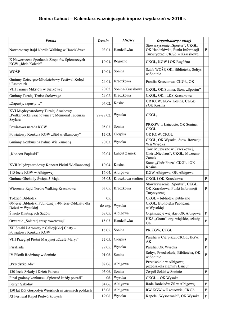 Gmina Łańcut – Kalendarz ważniejszych imprez i wydarzeń w 2016 r. Forma Termin Miejsce Organizatorzy / uwagi Stowarzyszenie „Sportur”, CKGŁ, OK Handzlówka, Punkt Informacji Turystycznej CKGŁ w Kraczkowej Noworoczny Rajd Nordic Walking w Handzlówce 03.01. Handzlówka X Noworoczne Spotkanie Zespołów Śpiewaczych KGW „Idzie Kolęda” 10.01. Rogóżno CKGŁ, KGW i OK Rogóżno WOŚP 10.01. Sonina Sztab WOŚP, OK, Biblioteka, Sołtys w Soninie 24.01. Kraczkowa Parafia Kraczkowa, CKGŁ, OK Gminny Dziecięco-Młodzieżowy Festiwal Kolęd i Pastorałek VIII Turniej Mikstów w Siatkówce 20.02. Sonina/Kraczkowa CKGŁ, OK Sonina, Stow. „Sportur” Gminny Turniej Tenisa Stołowego 24.02. Kraczkowa „Zapusty, zapusty…” 04.02. Kosina XVI Międzynarodowy Turniej Szachowy „Podkarpacka Szachownica”; Memoriał Tadeusza Szylara 27-28.02. Wysoka Powiatowa narada KGW 05.03. Sonina Powiatowy Konkurs KGW „Stół wielkanocny” 12.03. Cierpisz Gminny Konkurs na Palmę Wielkanocną 20.03. Wysoka „Koncert Papieski” 02.04. Łańcut Zamek XVII Międzynarodowy Koncert Pieśni Wielkanocnej 10.04. Kosina 115-lecie KGW w Albigowej 16.04. Albigowa Gminne Obchody Święta 3-Maja Wiosenny Rajd Nordic Walking Kraczkowa Tydzień Bibliotek 60-lecie Biblioteki Publicznej i 40-lecie Oddziału dla Dzieci w Wysokiej Święto Kwitnących Sadów Otwarcie „Solarnej trasy rowerowej” CKGŁ, OK i LKS Kraczkowa GR KGW, KGW Kosina, CKGŁ i OK Kosina CKGŁ, PRKGW w Łańcucie, OK Sonina, CKGŁ GR KGW, CKGŁ CKGŁ, OK Wysoka, Stow. Rozwoju Wsi Wysoka Tow. Muzyczne w Kraczkowej, Chór „Nicolaus”, CKGŁ, MuzeumZamek Stow. „Chór Fraza” CKGŁ i OK Kosina KGW Albigowa, OK Albigowa 03.05. Kraczkowa stadion CKGŁ i OK Kraczkowa Stowarzyszenie „Sportur”, CKGŁ, 03.05. Kraczkowa OK Kraczkowa, Punkt Informacji Turystycznej 05. CKGŁ – biblioteki publiczne CKGŁ, Biblioteka Publiczna do uzg. Wysoka w Wysokiej Albigowa 08.05. Organizacje wiejskie, OK Albigowa HKS „Grom”, org. wiejskie, szkoły, 15.05. Handzlówka OK XII Smaki i Aromaty z Galicyjskiej Chaty – Powiatowy Konkurs KGW 15.05. Sonina VIII Przegląd Pieśni Maryjnej „Cześć Maryi” 22.05. Cierpisz Parafiada 29.05. Wysoka IV Piknik Rodzinny w Soninie 01.06. Sonina „Przedszkolada” 02.06. Albigowa 130-lecie Szkoły i Dzień Patrona 05.06. Sonina Finał gminny konkursu „Śpiewać każdy potrafi” P 06. Wysoka P P P P PR KGW, CKGŁ Parafia w Cierpiszu, CKGŁ, KGW, AK Parafia, OK Wysoka Sołtys, Przedszkole, Biblioteka, OK w Soninie Przedszkole w Albigowej, przedszkola z gminy Łańcut Zespół Szkół w Soninie P P P P CKGŁ – OK Wysoka Rada Rodziców ZS w Albigowej P 150 lat Kół Gospodyń Wiejskich na ziemiach polskich 04.06. Albigowa 18.06. Albigowa RW KGW w Rzeszowie, CKGŁ P XI Festiwal Kapel Podwórkowych 19.06. Wysoka Kapela „Wysoczanie”, OK Wysoka P Festyn Szkolny 90-lecie Orkiestry Dętej w Handzlówce; 15-lecie Niepublicznego Gimnazjum w Handzlówce i nadanie sztandaru 25.06. Handzlówka Festyn „Weekend z Rodziną” 26.06. Głuchów IV Parafiada – festyn 26.06. Kraczkowa 65-lecie OSP Albigowa-Honie do ust. Albigowa-Honie Piknik lotniczy 02.07. Rogóżno Festyn „Jarmark z Piosenką Biesiadną” CKGŁ-OK Handzlówka, Orkiestra Dęta, NG w Handzlówce P P 03.07. Rogóżno OK, CKGŁ Parafia, KGW, LKS „Czarni”, OK, CKGŁ OSP Albigowa-Honie Lotnicze Stowarzyszenie Ziemi Łańcuckiej OK, CKGŁ, KGW 70-lecie LKS „Sawa” 03.07. Sonina LKS „Sawa” P Festyn wakacyjny 10.07. Kosina OK P Jubileusz 90-lecia OSP w Głuchowie 17.07. Głuchów P XVII Festiwal Kwiatów 24.07. Albigowa OSP Głuchów WR KGW, GR KGW, OK, CKGŁ, St. „DA”, St. RdWŁ Wójt Gminy Wiązownica, GCK w Wiązownicy, CKGŁ Komitet Organizacyjny Komitet Organizacyjny P Komitet Organizacyjny P P 04.09. Kraczkowa CKGŁ OK Głuchów Wójt, Rada Gminy, CKGŁ, Stow. „Razem dla Wsi Łańcuckiej” KGW, OK w Kraczkowej 04.09. Kosina OK Kosina, Stow. „Sportur” P Prezentacja Gminy Łańcut w Radawie (gm. Wiązownica) Dożynki wiejskie Dożynki wiejskie Dożynki wiejskie Wojewódzki Turniej Warcabowy Dożynki gminne + Finał konkursu „Zasłużony dla Gminy Łańcut” Święto Pieczonego Ziemniaka II Bieg Uliczny „Kosińska Piątka”; II Marsz Wiatraków Nordic Walking II Konkurs „Najsmaczniejsze pierogi” 31.07. Radawa 14.08. Głuchów, Sonina Wysoka, 15.08. Handzlówka, Rogóżno 21.08. Albigowa, Kosina 26.08. Głuchów OK 28.08. Cierpisz 09. Wysoka 40-lecie KGW w Głuchowie 09. Głuchów 25-lecie Zespołu Pieśni i Tańca „Patria” 09. Kraczkowa Powiatowy Konkurs KGW „Zamknąć lato w słoiku” Dzień Papieski Międzynarodowe Spotkanie z Tradycją „Stefanowa Nuta”, 10-lecie Kapeli Młodzieżowej „Hop Siup”; 50-lecie Domu Kultury w Albigowej Powiatowy Konkurs KGW „Święto Chleba” 01.10. Kraczkowa 10. 08.10. Albigowa 10. Głuchów GR KGW, KGW, OK Wysoka KGW Głuchów, CKGŁ – OK Głuchów OK Kraczkowa, Stow. ZPiT „Patria” KGW, OK, CKGŁ Parafie, OK OK Albigowa, Kapela „Hop Siup”, CKGŁ, organizacje wiejskie w Albigowej KGW, OK, CKGŁ 20-lecie Zespołu Regionalnego „Sonina” Turniej Tenisa Stołowego z okazji Święta Niepodległości Gminne Obchody Święta Niepodległości, Koncert Pieśni Patriotycznej i Popularnej 29.10. Sonina OK Sonina, CKGŁ, ZL „Sonina” 11.11. Kraczkowa OK 11.11. Samorząd Gminy, CKGŁ, szkoły 25-lecie Zespołu Piosenki i Ruchu „Pyza” 26.11. Albigowa 25-lecie Zespołu Obrzędowego „Tkacze” Wystawa „Czas Bożego Narodzenia” Konkurs kronik KGW 11. Wysoka 9-11.12. Albigowa 10.12. Albigowa OK Albigowa, CKGŁ, Stow. „Dla Albigowej” OK Wysoka, CKGŁ KGW, OK (do 13.12.) GR KGW, CKGŁ 22.05.-19.06.2016. – Dni Gminy Łańcut P – impreza organizowana w plenerze (m.in. przy Ośrodku Kultury, szkole, kościele lub na stadionie). P P P P P P P