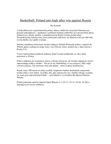 Basketball: Poland aim high after win against Russia By Konrad Z jednodniowym wyprzedzeniem polscy kibice siatkówki otrzymali fantastyczny prezent mikołajkowy - spotkanie z polskimi królami siatkówki na warszawskim placu Zamkowym. Kiedy autokar z podopiecznymi Raula Lozano jechał ulicą Świętokrzyską, eskortowany przez policyjny radiowóz, na Starówce był już taki tłok, że nie dałoby się szpilki wcisnąć. Srebrny medalista mistrzostw świata siatkarzy Michał Winiarski poleci z Japonii do Włoch, gdzie czekają na niego żona i syn Oliwier, który urodził się w dniu meczu z Rosją (3:2). Trener reprezentacji polskich siatkarzy Raul Lozano podkreślił, że chce dalej pracować w Polsce. Polscy siatkarze po wygranym meczu z Rosją cieszą się, ale twardo stąpają po ziemi i zapowiadają walkę o medal. - Nie po to się znaleźliśmy w tym miejscu, żeby zająć czwarte miejsce. Nie możemy teraz dać plamy - mówi Łukasz Kadziewicz. Każdy mecz MŚ niesie za sobą wysiłek, stopniowo będzie dochodziło zmęczenie, trzeba sobie z tym radzić. Za kilka, dni, gdy zmierzymy się z Serbią i Rosją, wyjdzie ile warta jest reprezentacja Polski. – powiedział w wywiadzie dla Sportu Mariusz Wlazły. Polska pokonała mistrza Japonii Sakai Blazers 3:1 (25:17, 25:13, 24:26, 25:20) w sparingowym meczu siatkarzy.