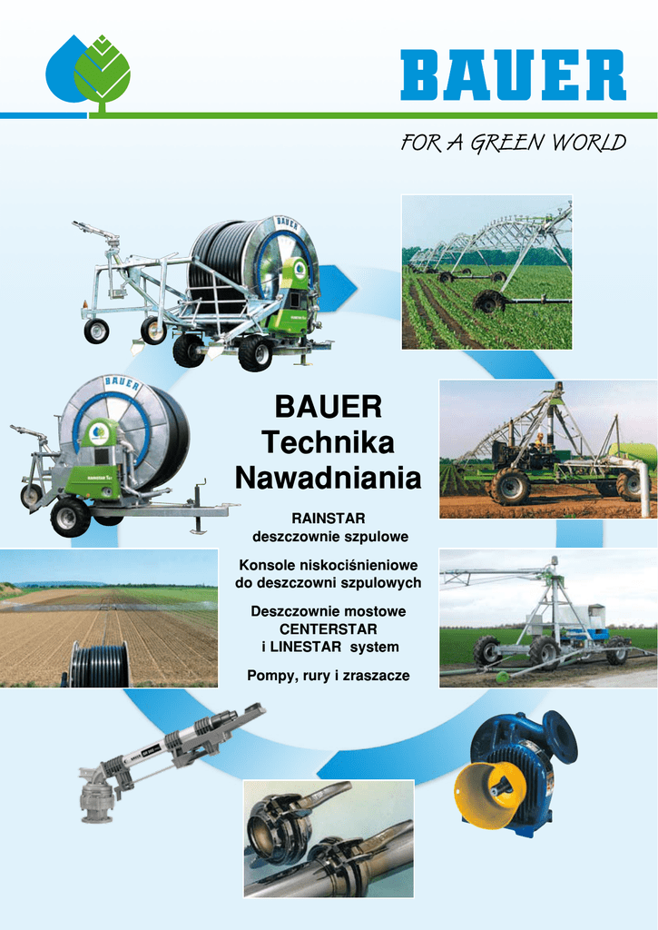 BAUER Technika Nawadniania RAINSTAR deszczownie szpulowe Konsole niskociśnieniowe do deszczowni szpulowych Deszczownie mostowe CENTERSTAR i LINESTAR system Pompy, rury i zraszacze BAUER oferuje pełną gamę produktów dla ekonomicznego nawodnienia różnych upraw. BAUER CENTERSTAR System nawadniania dla dużych powierzchni przy niskim ciśnieniu wejściowym wody – stały lub przestawiany – pracujący dookoła lub po jego części – mocna i trwała konstrukcja – wysoka stabilność urządzenia – wysoki moment obrotowy na każdym przęśle – precyzyjna i niezawodna kontrola wyrównania – śred. rury: 133, 168 i 203 mm BAUER RAINSTAR Sprawdzone deszczownie szpulowe dla każdego użytkownika – elementy stalowe ocynkowane ogniowo – bardzo długi okres użytkowania – max. niezawodności i efektywności wykorzystania – przystosowane dla większości kształtów i rozmiarów pól – największa łatwość obsługi – optymalne nawodnienie – bogate wyposażenie w standardzie BAUER RAINSTAR T kompletnie ocynkowany ogniowo – śred. przewodu PE 65 – 100 mm – dług. przewodu PE 250 – 450 m – sterownie komputerem ECOSTAR BAUER LINESTAR System nawadniania dla prostokątnych powierzchni upraw – zasilanie z kanału lub np. z węża zasilającego hydrantu – prowadzenie wzdłuż kabla lub bruzdy – precyzyjna kontrola ustawienia – śred. rury: 168 i 203 mm BAUER RAINSTAR E – śred. przewodu PE 90 – 140 mm – dług. przewodu PE 300 – 650 m – sterownie komputerem ECOSTAR BAUER RAINSTAR E61 S/H – śred. przewodu PE 110 – 140 mm – dług. przewodu PE 550 – 750 m – sterownie komputerem ECOSTAR – idealna konstrukcja na bardzo duże pola – hydrauliczne opuszczanie i obraca nie BAUER RAINSTAR 65 TX Plus – śred. przewodu PE 65 – 75 mm – dług. przewodu PE 220 – 300 m – sterownie komputerem ECOSTAR lub mechaniczne BAUER FAMOS ciągnikowe pompy do wody – doskonała sprawność – wysoka ekonomiczność – bardzo długi okres użytkowania – ciśnienie do 12 bar – wydajność do 150 m3/h – wszechstronne zastosowanie – duża rozpiętość akcesoriów BAUER HK rury z szybkozłączami w rozmiarach od 50 mm do 194 mm – ocynk ogniowy gwarantuje długi czas użytkowania – maksymalna stabilność i mały ciężar – aż do 30o możliwość wychylenia na złączu – aż do 20 bar ciśnienie robocze – pełny zakres oferowanego osprzętu Röhren- und Pumpenwerk BAUER GmbH 8570 Voitsberg, Austria Phone +43 3142 200-0 Fax +43 3142 200-320 / -340 www.bauer-at.com, [email protected] Twój dealer BAUER‘a: Subject to change / Irrigation Technology / 02 2006 e BAUER konsole niskociśnieniowe Najlepszy sposób nawadniania delikatnych roślin i upraw – od 3,5 bar ciśnienia wody na wejściu na deszczownię – ekonomiczne wykorzystanie wody i energii – wystarczy jedna osoba do przygo towania konsoli do pracy i trans- portu – AS 26 - szerokość nawadnianego pasa do 36 m – AS 32 - szerokość nawadnianego pasa do 50 m – AS 50 - szerokość nawadnianego pasa do 72 m – AS 64 - szerokość nawadnianego pasa do 86 m BAUER CENTERLINER Multistar Może pracować wkoło i wzdłuż pola jak linear i pivot – obracany i przestawiany – automatyczna kontrola dla różnych prędkości – oferowany dla nieregularnych kształtów pól – zasilanie wodą z hydrantów