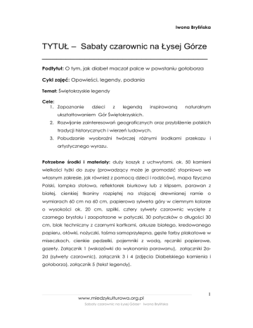 Iwona Brylińska TYTUŁ – Sabaty czarownic na Łysej Górze ___________________________________ Podtytuł: O tym, jak diabeł maczał palce w powstaniu gołoborza Cykl zajęć: Opowieści, legendy, podania Temat: Świętokrzyskie legendy Cele: 1. Zapoznanie dzieci z legendą inspirowaną naturalnym ukształtowaniem Gór Świętokrzyskich. 2. Rozwijanie zainteresowań geograficznych oraz przybliŜenie polskich tradycji historycznych i wierzeń ludowych. 3. Pobudzanie wyobraźni twórczej róŜnymi środkami przekazu i artystycznego wyrazu. Potrzebne środki i materiały: duŜy koszyk z uchwytami, ok. 50 kamieni wielkości łyŜki do zupy (prowadzący moŜe je gromadzić stopniowo we własnym zakresie, jak równieŜ z pomocą dzieci i rodziców), mapa fizyczna Polski, lampka stołowa, reflektorek biurkowy lub z klipsem, parawan z białej, cienkiej tkaniny rozpiętej na stojącej drewnianej ramie o wymiarach 60 cm na 60 cm, papierowa sylweta góry w ciemnym kolorze o wysokości ok. 20 cm, szpilki, cztery sylwety czarownic wycięte z czarnego brystolu i zaopatrzone w patyczki, 30 patyczków o długości 30 cm, blok techniczny z czarnymi kartkami, arkusze białego, kredowanego papieru, ołówki, noŜyczki, taśma samoprzylepna, gęste farby plakatowe w miseczkach, cienkie pędzelki, pojemniki z wodą, ręczniki papierowe, gazety. Załącznik 1 (wskazówki do wykonania parawanu), załączniki 2a2d (sylwety czarownic), załącznik 3 i 4 (zdjęcia Diabelskiego kamienia i gołoborza), załącznik 5 (tekst legendy). ________________________________________________________________________________________ www.miedzykulturowa.org.pl Sabaty czarownic na Łysej Górze- Iwona Brylińska 1 Realizacja 1. Magiczny kamień – zabawa integracyjna. Prowadzący wita się z dziećmi i pyta o ich samopoczucie. WyraŜa zadowolenie, Ŝe większa część zgromadzonych osób ma pogodny nastrój, bo czeka je spotkanie z pewną tajemnicą i odrobiną czarów. Uprzedza, Ŝe nie będzie to nic bardzo strasznego, ale lepiej mieć dobre samopoczucie, Ŝeby zmierzyć się z magią. Na początek zabawa. Prowadzący prosi dzieci, Ŝeby usiadły w krąg. Pokazuje kamień i informuje, Ŝe nie jest takim zwyczajnym, znalezionym przy drodze kamykiem. To upominek od przyjaciela, podarowany ze szczerego serca, a przez to waŜny i wyjątkowy. Prowadzący wyjaśnia, Ŝe przedmioty, które mają dla ludzi szczególne znaczenie, są traktowane często jak talizmany. Talizman ma przynosić szczęście i chronić przed złymi zdarzeniami. Czy tak jest naprawdę? O tym musieliby powiedzieć posiadacze talizmanów. Prowadzący uŜyje swojego kamienia, Ŝeby ściągnąć do głów dzieci same pogodne, radosne myśli. Za chwilę kamień powędruje w krąg, z ręki do ręki. Trzeba go ogrzać swoim dotykiem, pomyśleć o czymś bardzo przyjemnym i przekazać sąsiadowi. Prowadzący rozpoczyna zabawę pełną pozytywnego skupienia. Kiedy kamień wraca do niego, stwierdza, Ŝe jest ciepły i nasycony dobrą energią, a to wróŜy udany dzień dla wszystkich. Pyta, czy ktoś ma ochotę zdradzić innym, o czym myślał, kiedy trzymał w ręku kamień. Prowadzący wysłuchuje chętnych, po czym zwraca uwagę, Ŝe kaŜdy miał nieco inne skojarzenie, co dowodzi faktu, jak wiele rzeczy, sytuacji i zdarzeń wprawia nas w dobry nastrój. 2. „Zimny jak głaz” – ćwiczenie językowe. Skały, głazy, kamienie zawsze pobudzały wyobraźnię ludzi swoją niezniszczalnością, cichą tajemniczością i wiecznym chłodem. Istnieje wiele przysłów i powiedzeń, w których kamień symbolizuje cięŜar, milczenie i obojętność, a czasami siłę i niezłomność. Prowadzący prosi dzieci o przytoczenie i objaśnienie znanych im porzekadeł i dodaje kilka od siebie, np. Serce z kamienia, Kamienna twarz, Ktoś ma kamień u szyi, Spadł mi kamień z serca, Twardy jak skała, Zimny jak głaz, Kamień na kamieniu nie pozostał, Na kamieniu ________________________________________________________________________________________ www.miedzykulturowa.org.pl Sabaty czarownic na Łysej Górze- Iwona Brylińska 2 urodzony (ktoś wyjątkowy, człowiek wartościowy), Przepadł jak kamień w wodę, Milczeć jak kamień, Trafiła kosa na kamień, CięŜki, jak kamień młyński, Idzie komuś jak z kamienia, Wrzucić kamień do czyjegoś ogródka (złośliwość, przytyk), Oleju z kamienia się nie wyciśnie, itd. Prowadzący stawia na dywanie kosz z kamieniami. Prosi dzieci, Ŝeby wzięły po jednym i dokładnie obejrzały. Za chwilę kaŜdy musi podać określenie charakteryzujące kamienie lub skały. Nie chodzi tylko o pojedyncze przymiotniki określające cechy, ale takŜe o opisowe porównania (kamień/skała jest jak..., wygląda jak..., przypomina... ). Mogą przy tej okazji powstać takŜe neologizmy, bo dziecięca wyobraźnia bywa nieprzewidywalna. Kolejka gry rusza po kole. Kto scharakteryzuje kamień jako okaz przyrody nieoŜywionej lub symbol, wrzuca swój kamyk z powrotem do kosza. Kto niczego nie wymyśli w ciągu kilkunastu sekund lub powieli określenie, zostaje z kamieniem w ręku. Kolejka wraca i gra toczy się dalej dla tych, którym nie udało się za pierwszym razem. Prowadzący moŜe pomóc niektórym dzieciom, mając wiedzę o ich indywidualnych moŜliwościach. 3. Praca z mapą. Prowadzący pyta dzieci, gdzie ich zdaniem, moŜna znaleźć najwięcej kamieni. Skupia się na odpowiedzi typującej skaliste góry. Zawiesza na ścianie mapę fizyczną Polski i wskazuje południową część kraju, gdzie rozciągają się łańcuchy, pasma i masywy górskie. Zwraca uwagę, Ŝe Ŝółty i pomarańczowy kolor oznacza na mapie wzniesienia i tereny górzyste. Odszukuje Kielce leŜące w obrębie WyŜyny Małopolskiej, a dokładniej WyŜyny Kielecko – Sandomierskiej. W pobliŜu Kielc wskazuje masyw Gór Świętokrzyskich i najwyŜsze szczyty Łysicę i Łysą górę. Odczytuje wszystkie nazwy geograficzne i zaprasza zainteresowanych do przyjrzenia s