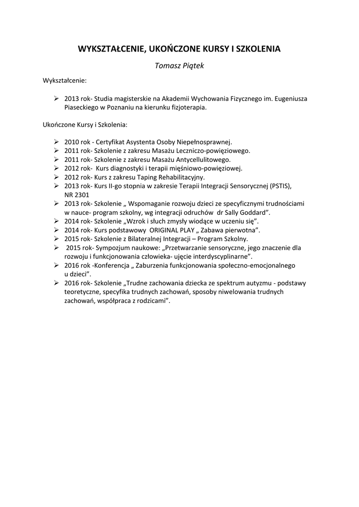 WYKSZTAŁCENIE, UKOŃCZONE KURSY I SZKOLENIA Tomasz Piątek Wykształcenie: 2013 rok- Studia magisterskie na Akademii Wychowania Fizycznego im. Eugeniusza Piaseckiego w Poznaniu na kierunku fizjoterapia. Ukończone Kursy i Szkolenia: 2010 rok - Certyfikat Asystenta Osoby Niepełnosprawnej. 2011 rok- Szkolenie z zakresu Masażu Leczniczo-powięziowego. 2011 rok- Szkolenie z zakresu Masażu Antycellulitowego. 2012 rok- Kurs diagnostyki i terapii mięśniowo-powięziowej. 2012 rok- Kurs z zakresu Taping Rehabilitacyjny. 2013 rok- Kurs II-go stopnia w zakresie Terapii Integracji Sensorycznej (PSTIS), NR 2301 2013 rok- Szkolenie „ Wspomaganie rozwoju dzieci ze specyficznymi trudnościami w nauce- program szkolny, wg integracji odruchów dr Sally Goddard”. 2014 rok- Szkolenie „Wzrok i słuch zmysły wiodące w uczeniu się”. 2014 rok- Kurs podstawowy ORIGINAL PLAY „ Zabawa pierwotna”. 2015 rok- Szkolenie z Bilateralnej Integracji – Program Szkolny. 2015 rok- Sympozjum naukowe: „Przetwarzanie sensoryczne, jego znaczenie dla rozwoju i funkcjonowania człowieka- ujęcie interdyscyplinarne”. 2016 rok -Konferencja „ Zaburzenia funkcjonowania społeczno-emocjonalnego u dzieci”. 2016 rok- Szkolenie „Trudne zachowania dziecka ze spektrum autyzmu - podstawy teoretyczne, specyfika trudnych zachowań, sposoby niwelowania trudnych zachowań, współpraca z rodzicami”.