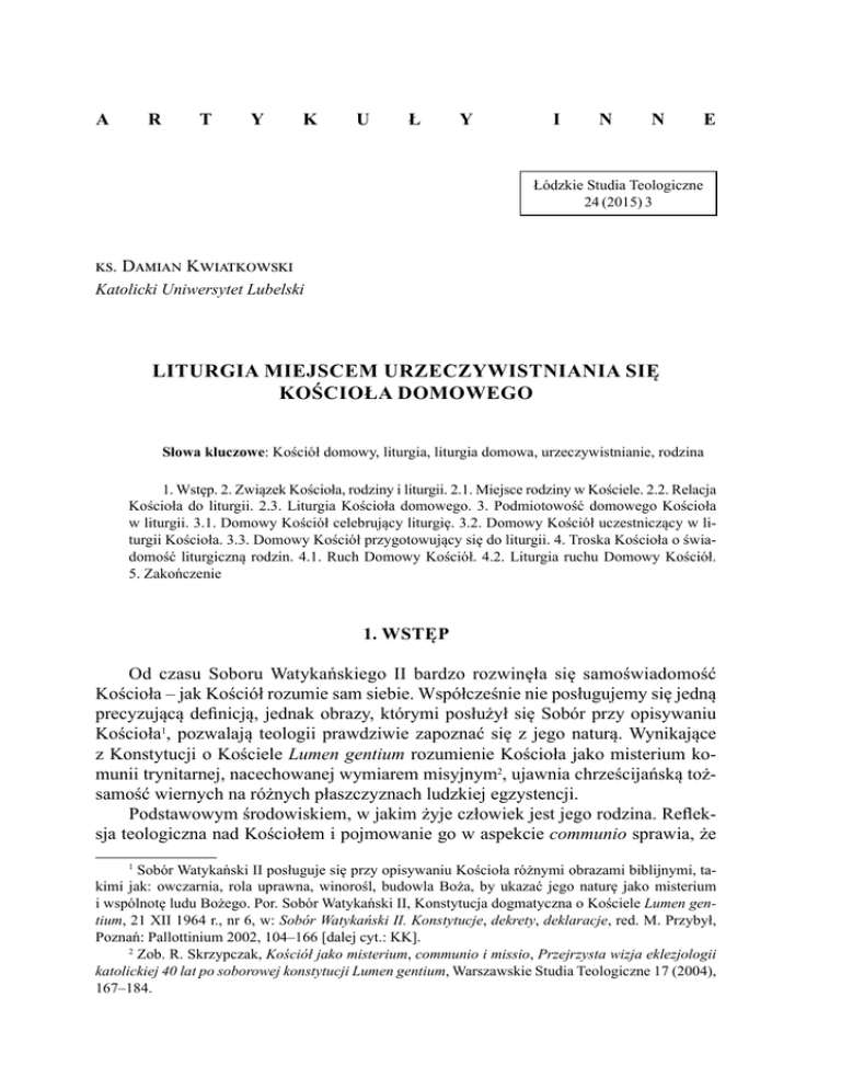 A R T Y K U Ł Y I N N E Łódzkie Studia Teologiczne 24 (2015) 3 ks. Damian Kwiatkowski Katolicki Uniwersytet Lubelski LITURGIA MIEJSCEM URZECZYWISTNIANIA SIĘ KOŚCIOŁA DOMOWEGO Słowa kluczowe: Kościół domowy, liturgia, liturgia domowa, urzeczywistnianie, rodzina 1. Wstęp. 2. Związek Kościoła, rodziny i liturgii. 2.1. Miejsce rodziny w Kościele. 2.2. Relacja Kościoła do liturgii. 2.3. Liturgia Kościoła domowego. 3. Podmiotowość domowego Kościoła w liturgii. 3.1. Domowy Kościół celebrujący liturgię. 3.2. Domowy Kościół uczestniczący w liturgii Kościoła. 3.3. Domowy Kościół przygotowujący się do liturgii. 4. Troska Kościoła o świadomość liturgiczną rodzin. 4.1. Ruch Domowy Kościół. 4.2. Liturgia ruchu Domowy Kościół. 5. Zakończenie 1. WSTĘP Od czasu Soboru Watykańskiego II bardzo rozwinęła się samoświadomość Kościoła – jak Kościół rozumie sam siebie. Współcześnie nie posługujemy się jedną precyzującą definicją, jednak obrazy, którymi posłużył się Sobór przy opisywaniu Kościoła1, pozwalają teologii prawdziwie zapoznać się z jego naturą. Wynikające z Konstytucji o Kościele Lumen gentium rozumienie Kościoła jako misterium komunii trynitarnej, nacechowanej wymiarem misyjnym2, ujawnia chrześcijańską tożsamość wiernych na różnych płaszczyznach ludzkiej egzystencji. Podstawowym środowiskiem, w jakim żyje człowiek jest jego rodzina. Refleksja teologiczna nad Kościołem i pojmowanie go w aspekcie communio sprawia, że Sobór Watykański II posługuje się przy opisywaniu Kościoła różnymi obrazami biblijnymi, takimi jak: owczarnia, rola uprawna, winorośl, budowla Boża, by ukazać jego naturę jako misterium i wspólnotę ludu Bożego. Por. Sobór Watykański II, Konstytucja dogmatyczna o Kościele Lumen gentium, 21 XII 1964 r., nr 6, w: Sobór Watykański II. Konstytucje, dekrety, deklaracje, red. M. Przybył, Poznań: Pallottinium 2002, 104–166 [dalej cyt.: KK]. 2 Zob. R. Skrzypczak, Kościół jako misterium, communio i missio, Przejrzysta wizja eklezjologii katolickiej 40 lat po soborowej konstytucji Lumen gentium, Warszawskie Studia Teologiczne 17 (2004), 167–184. 1 DAMIAN KWIATKOWSKI 126 [2] rodziny nie można pojmować jako prostego bytu w strukturze Kościoła, ale jako rzeczywistość wpisująca się istotowo w wspólnotową naturę Kościoła. Rodzina jest bowiem najmniejszą wspólnotą Kościoła i jak ujmuje to nauczanie Soboru: jest „niejako Kościołem domowym – velut ecclesia domestica” (KK nr 11, por. DA 11)3. Pogłębiona refleksja teologiczna o Kościele, ma wpływ także na rozumienie liturgii. Jak ukazuje Konstytucja o liturgii Sacrosanctum Concilium4, jest ona czynnością samego Chrystusa, która uświęca człowieka i oddaje cześć Bogu (por. KL 7). W ten sposób liturgia przynależy do istoty Kościoła. Jest ona bowiem jego epifanią; znakiem, który jednocześnie go uwidacznia i urzeczywistnia jako Lud Boży. Takie postrzeganie rzeczywistości Kościoła pozwala nam dostrzec szereg relacji między Kościołem, liturgią i rodziną. Nie jest to zależność, która odzwierciedlałaby tylko wzajemnie spełnianie względem siebie określonych funkcji. Współzależność odnosi się tu do istoty ich natury. Rozumiejąc liturgię jako urzeczywistnianie się Kościoła, a rodzinę jako Kościół domowy, można zadać pytanie: czy mamy prawo w konsekwencji wnioskować, że liturgia w odniesieniu do rodziny także staje się miejscem jej urzeczywistniania się? W celu udzielenia odpowiedzi na postawione pytanie, zostanie przeprowadzona analiza rozumienia rodziny jako Kościoła domowego oraz ukazane zostaną elementy urzeczywistniania się Kościoła w liturgii. Pozwoli to podjąć rozważanie nad aspektem teologicznym liturgii w odniesieniu do rodziny, co umożliwi przebadanie konsekwencji rozumienia jej jako podmiotu liturgii. W tym opracowaniu zostanie podjęta także kwestia troski Kościoła o zaistnienie w rodzinach świadomości tego, jaką rolę liturgia spełnia w urzeczywistnianiu się ich wspólnoty rodzinnej jako Kościoła. Ukazane to zostanie na przykładzie ruchu Domowy Kościół, który jest przejawem zrzeszenia się wiernych w Kościele i bezpośrednio odwołuje się do soborowej idei Kościoła domowego. Jako część Ruchu Światło-Życie wpisuje się w strukturę formacji liturgicznej5. 2. ZWIĄZEK KOŚCIOŁA, RODZINY I LITURGII By wyjaśnić, czym jest liturgia Kościoła domowego, najpierw dokonać należy zbadania miejsca rodziny w Kościele, następnie ukazać powiązanie Kościoła z liturgią i dopiero w konsekwencji zaprezentować, jak rzeczywistość rodziny i Kościoła odzwierciedlają się w liturgii. Zob. Sobór Watykański II, Dekret o apostolstwie świeckich Apostolicam actuositatem, 18.11.12.1965 r., w: Sobór Watykański II..., dz.cyt., 377–401 [dalej cyt.: DA]. 4 Zob. Sobór Watykański II, Konstytucja o liturgii świętej Sacrosanctum Concilium, 4 XII 1963 r., w: Sobór Watykański II..., dz.cyt., 48–78 [dalej cyt.: KL]. 5 Na terenie Polski można do najbardziej rozwiniętych organizacyjnie i duchowo ruchów rodzinnych zaliczyć także: Rodzina Rodzin, Ruch Rodzin Nazaretanskich, Spotkania Małżeńskie oraz Synodalne Grupy Rodzin. Por. B. Mierzwiński, J. Wilk, R. Bieleń, Duszpasterstwo rodzin, w: Teologia pastoralna, t. 2: Teologia pastoralna szczegółowa, red. R. Kamiński, Lublin: Wydawnictwo ALTA 2 2002, 439. 3 [3] LITURGIA MIEJSCEM URZECZYWISTNIANIA SIĘ KOŚCIOŁA DOMOWEGO 127 2.1. MIEJSCE RODZINY W KOŚCIELE W Kościele zawsze przypisywano specjalne znaczenie rodzinie. Jako rodzinę rozumiemy tu „wspólnotę osób opartą na więzach krwi czy adopcji, wspólnotę koncentrującą się wokół relacji rodziców i dzieci. Fundamentem tak pojętej rodziny jest trwały, uznany prawnie związek mężczyzny i kobiety. Dla chrześcijan ma on wymiar sakramentu, staje się communio personarum, osobową komunią miło