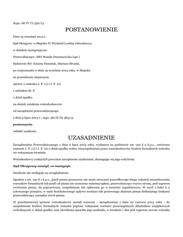 Sygn. akt IV Cz 550/13 POSTANOWIENIE Dnia 19 września 2013 r. Sąd Okręgowy w Słupsku IV Wydział Cywilny Odwoławczy w składzie następującym: Przewodniczący: SSO Wanda Dumanowska (spr.) Sędziowie SO: Jolanta Deniziuk, Mariusz Struski, po rozpoznaniu w dniu 19 września 2013 roku, w Słupsku na posiedzeniu niejawnym sprawy z wniosku J. P. (1) i J. P. (2) z udziałem M. P. o dział spadku na skutek zażalenia wnioskodawców od zarządzenia przewodniczącego z dnia 9 lipca 2013 r., sygn. akt IX Ns 585/13 postanawia: oddalić zażalenie. UZASADNIENIE Zarządzeniem Przewodniczącego z dnia 9 lipca 2013 roku, wydanym na podstawie art. 130 § 2 k.p.c., zwrócono wniosek J. P. (1) i J. P. (2) o dział spadku wobec nieuzupełnienia przez wnioskodawców braków formalnych wniosku we wskazanym terminie. Wnioskodawcy zaskarżyli powyższe zarządzenie zażaleniem, domagając się jego uchylenia. Sąd Okręgowy zważył, co następuje: Zażalenie nie zasługuje na uwzględnienie. Zgodnie z art. 130 § 1 k.p.c., jeżeli pismo procesowe nie może otrzymać prawidłowego biegu wskutek niezachowania warunków formalnych lub jeżeli od pisma nie uiszczono należnej opłaty, przewodniczący wzywa stronę, pod rygorem zwrócenia pisma, do poprawienia, uzupełnienia lub opłacenia go w terminie tygodniowym. W myśl z kolei § 2 cytowanego przepisu, w razie bezskutecznego upływu terminu lub ponownego złożenia pisma dotkniętego brakami przewodniczący zarządza zwrot pisma. W przedmiotowej sprawie wnioskodawcy zostali wezwani - zarządzeniem z dnia 22 czerwca 2013 roku - do uzupełnienia braków formalnych wniosku poprzez wskazanie wartości poszczególnych składników majątkowych wchodzących w skład spadku oraz określenia sposobu jego podziału, w terminie 7 dni pod rygorem zwrotu wniosku (k. 1). Powyższe wezwanie zostało przez J. P. (1) odebrane w dniu 1 lipca 2013 roku (k. 24), zaś przez J. P. (2) w dniu 12 lipca 2013 roku (k.30). W odpowiedzi na wezwanie obaj wnioskodawcy, w piśmie z dnia 3 lipca 2013 roku (k. 21), wskazali, że domagają się od uczestniczki postępowania spłat pieniężnych, a wartość masy spadkowej szacują intuicyjnie na 300.000 zł. W ocenie Sądu Okręgowego wnioskodawcy nie uzupełnili braków formalnych wniosku w sposób należyty. Wprawdzie określili proponowany sposób podziału spadku, jednakże nie podali wartości poszczególnych składników masy spadkowej, ograniczając się jedynie do intuicyjnego wskazania łącznej wartość spadku. Wprawdzie w sprawie o dział spadku ma zastosowanie art. 684 kpc, który nakłada na sąd obowiązek ustalenia składu i wartości spadku z urzędu, jednak nie zwalnia to wnioskodawców od obowiązku, określonego w art. 617 kpc (poprzez odesłanie z art. 688 kpc) tj. dokładnego określenia rzeczy mających ulec podziałowi. Obowiązek ten obejmuje, jak prawidłowo wskazał Sąd Rejonowy, zarówno określenie składu masy spadkowej oraz jej wartości, ze wskazaniem wartości poszczególnych składników. Nadmienić należy, iż wskazany obowiązek działania sądu z urzędu urzeczywistnia się dopiero po nadaniu sprawie biegu, czyli po fazie wstępnej postępowania, w trakcie której badaniu podlega czy pismo wszczynające postepowanie w sprawie nie zawiera braków formalnych. Z uwagi na powyższe Sąd Okręgowy na podstawie art. 385 k.p.c. w zw. z art. 397 § 2 k.p.c. w zw. z art. 398 k.p.c. oddalił zażalenie, jako bezzasadne.