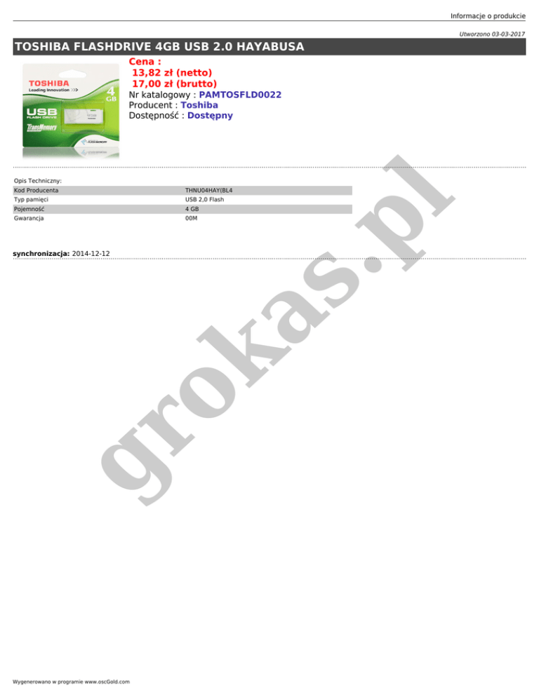 Informacje o produkcie Utworzono 03-03-2017 TOSHIBA FLASHDRIVE 4GB USB 2.0 HAYABUSA Cena : 13,82 zł (netto) 17,00 zł (brutto) Nr katalogowy : PAMTOSFLD0022 Producent : Toshiba Dostępność : Dostępny Kod Producenta THNU04HAY(BL4 Typ pamięci USB 2,0 Flash Pojemność 4 GB Gwarancja 00M gr ok as synchronizacja: 2014-12-12 .p l Opis Techniczny: Wygenerowano w programie www.oscGold.com