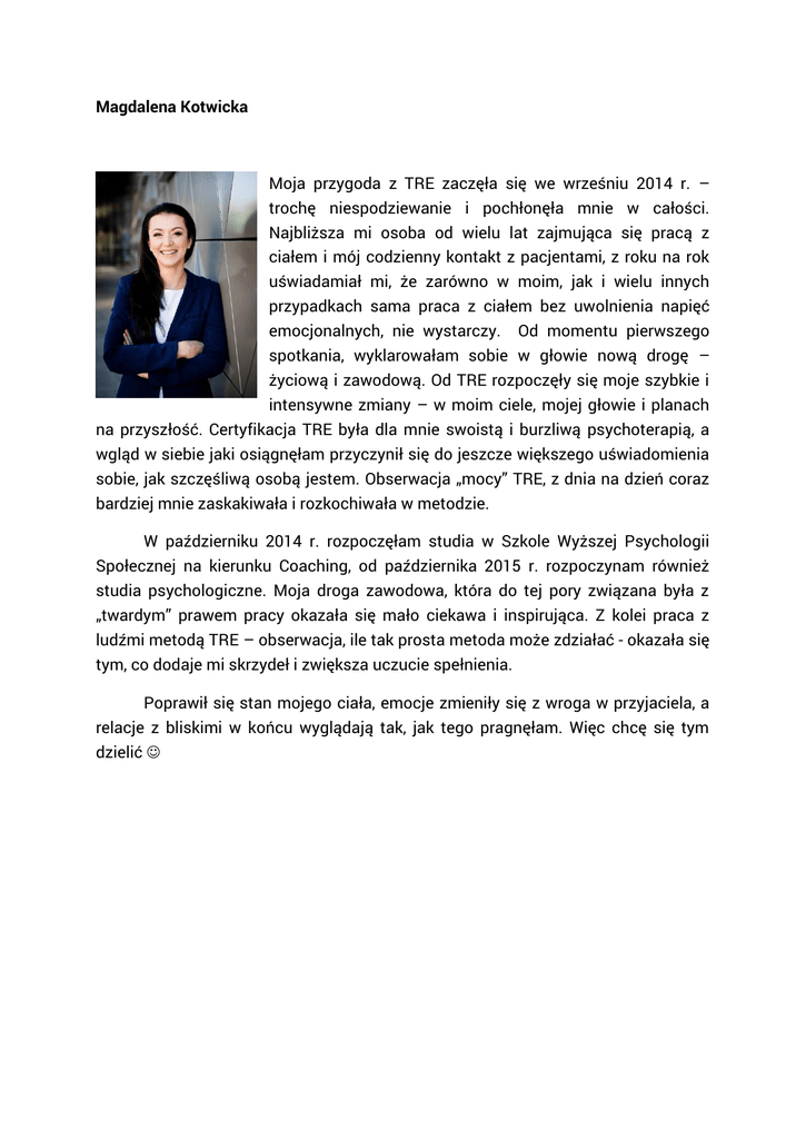 Magdalena Kotwicka Moja przygoda z TRE zaczęła się we wrześniu 2014 r. – trochę niespodziewanie i pochłonęła mnie w całości. Najbliższa mi osoba od wielu lat zajmująca się pracą z ciałem i mój codzienny kontakt z pacjentami, z roku na rok uświadamiał mi, że zarówno w moim, jak i wielu innych przypadkach sama praca z ciałem bez uwolnienia napięć emocjonalnych, nie wystarczy. Od momentu pierwszego spotkania, wyklarowałam sobie w głowie nową drogę – życiową i zawodową. Od TRE rozpoczęły się moje szybkie i intensywne zmiany – w moim ciele, mojej głowie i planach na przyszłość. Certyfikacja TRE była dla mnie swoistą i burzliwą psychoterapią, a wgląd w siebie jaki osiągnęłam przyczynił się do jeszcze większego uświadomienia sobie, jak szczęśliwą osobą jestem. Obserwacja „mocy” TRE, z dnia na dzień coraz bardziej mnie zaskakiwała i rozkochiwała w metodzie. W październiku 2014 r. rozpoczęłam studia w Szkole Wyższej Psychologii Społecznej na kierunku Coaching, od października 2015 r. rozpoczynam również studia psychologiczne. Moja droga zawodowa, która do tej pory związana była z „twardym” prawem pracy okazała się mało ciekawa i inspirująca. Z kolei praca z ludźmi metodą TRE – obserwacja, ile tak prosta metoda może zdziałać - okazała się tym, co dodaje mi skrzydeł i zwiększa uczucie spełnienia. Poprawił się stan mojego ciała, emocje zmieniły się z wroga w przyjaciela, a relacje z bliskimi w końcu wyglądają tak, jak tego pragnęłam. Więc chcę się tym dzielić
