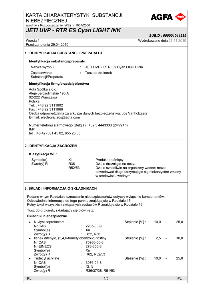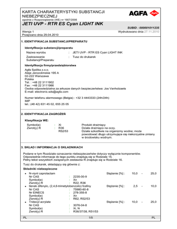 KARTA CHARAKTERYSTYKI SUBSTANCJI NIEBEZPIECZNEJ zgodnie z Rozporządzenie (WE) nr 1907/2006 JETI UVP - RTR ES Cyan LIGHT INK SUBID : 000001011235 Wydrukowano dnia 27.11.2010 Wersja 1 Przejrzano dnia 29.04.2010 1. IDENTYFIKACJA SUBSTANCJI/PREPARATU Identyfikacja substancji/preparatu Nazwa wyrobu : JETI UVP - RTR ES Cyan LIGHT INK Zastosowanie Substancji/Preparatu : Tusz do drukarek Identyfikacja firmy/przedsiębiorstwa Agfa Spólka z.o.o. Aleje Jerozolimskie 195 A 02-222 Warszawa Polska Tel. : +48 22 3111902 Fax : +48 22 3111966 Osoba odpowiedzialna za arkusze danych bezpieczeństwa: Jos Vanholzaets E-mail: [email protected] Numer telefonu alarmowego (Belgia) : +32 3 4443333 (24h/24h) IMP tel.: (48 42) 631 45 02, 655 25 05 2. IDENTYFIKACJA ZAGROŻEŃ Klasyfikacja WE: Symbol(e) Zwrot(y) R : : Xi R36 R52/53 Produkt drażniący Działa drażniąco na oczy. Działa szkodliwie na organizmy wodne; może powodować długo utrzymujące się niekorzystne zmiany w środowisku wodnym. 3. SKŁAD I INFORMACJA O SKŁADNIKACH Podane w tym Rozdziale oznaczenie niebezpieczeństw dotyczy wyłącznie komponentów. Odpowiednie informacje do tego punktu znajdują się w Rodziale 15. Pełny tekst wszystkich związanych zestawów R znajduje się w Rodziale 16. Tusz do drukarek, składający się głównie z: Składniki niebezpieczne • N-viynl caprolactam Nr CAS : 2235-00-9 Symbol(e) : Xn Zwrot(y) R : R22, R36 • tlenek difenylo, (2,4,6-trimetylobenzoilo) fosfiny Nr CAS : 75980-60-8 Nr EINECS : 278-355-8 Symbol(e) : Xn Zwrot(y) R : R62, R52/53 • Tridecyl acrylate Nr CAS : 3076-04-8 : Xi, N Symbol(e) Zwrot(y) R : R36/37/38, R51/53 PL 1/5 Stężenie [%] : 10,0 - 25,0 Stężenie [%] : 2,5 - 10,0 Stężenie [%] : 10,0 - 25,0 PL KARTA CHARAKTERYSTYKI SUBSTANCJI NIEBEZPIECZNEJ zgodnie z Rozporządzenie (WE) nr 1907/2006 JETI UVP - RTR ES Cyan LIGHT INK SUBID : 000001011235 Wydrukowano dnia 27.11.2010 Wersja 1 Przejrzano dnia 29.04.2010 4. PIERWSZA POMOC Kontakt z oczami : Kontakt przez skórę : Połknięcie Wdychanie : : Przemywać dokładnie dużą ilością wody przynajmniej przez 15 minut i skonsultować się z lekarzem. Zmyć natychmiast dużą ilością wody z mydłem. W razie utrzymywania się objawów, skontaktować się z lekarzem. Natychmiast zdjąć skażone ubranie. Nie wywoływać wymiotów. Wezwać lekarza. Wyprowadzić poszkodowanego na świeże powietrze. W razie potrzeby skontaktować się z lekarzem. 5. POSTĘPOWANIE W PRZYPADKU POŻARU Odpowiednie środki gaśnicze Specyficzne zagrożenia w czasie zwalczania pożaru : aerozol wodny, Suchy proszek., piasek, Dwutlenek węgla (CO2)., piana alkoholoodporna : Nie używać zwartego strumienia wody, ponieważ może rozproszyć i rozprzestrzenić ogień. 6. POSTĘPOWANIE W PRZYPADKU NIEZAMIERZONEGO UWOLNIENIA DO ŚRODOWISKA Osobiste środki ostrożności Środowiskowe środki ostrożności Metody oczyszczania Porady dodatkowe : Patrz Rodział 8. : Usuwanie odpadków - patrz Rodział 13. : W razie potrzeby, w przypadku rozlania zatamować. Zaimpregnować materiałem absorpcyjnym. Zebrać większe ilości rozsypanego produktu do odpowiednio oznaczonego i zaplombowanego pojemnika. Chronić przed dostaniem się do ścieków, gleby lub wód powierzchniowych. : Gdy produkt dostanie się do zbiorników lub kanalizacji lub do gleby i zanieczyścił rośliny należy powiadomić straż pożarną lub policję. 7. POSTĘPOWANIE Z SUBSTANCJĄ/PREPARATEM I JEJ/JEGO MAGAZYNOWANIE Operacje Wytyczne ochrony przeciwpożarowej : Trzymać z dala od zródeł ciepła i ognia. Magazynowanie Wymagania względem pomiesczeń i pojemników magazynowych Wytyczne składowania : Trzymać pojemnik dokładnie zamknięty. Chronić przed światłem słonecznym. : Przechowywać z dala od utleniaczy. 8. KONTROLA NARAŻENIA I ŚRODKI OCHRONY INDYWIDUALNEJ Śtrodki kontroli narażenia PL 2/5 PL KARTA CHARAKTERYSTYKI SUBSTANCJI NIEBEZPIECZNEJ zgodnie z Rozporządzenie (WE) nr 1907/2006 JETI UVP - RTR ES Cyan LIGHT INK SUBID : 000001011235 Wydrukowano dnia 27.11.2010 Wersja 1 Przejrzano dnia 29.04.2010 Środki techniczne : Środki higieny : Ochrona rąk : Ochrona rąk : Ochrona oczu : Należy zachować odpowiednią wentylację, aby uniknąć przekroczenia dopuszczalnego stężenia w miejscu pracy. Dbać o zachowanie zwykłych środków ostrożności w kontakcie z chemikaliami. Trzymać z dala od żywności, napojów i tytoniu. <** Phrase language not available: [ PL ] ZAGFA X08.00100200 **> Używać rękawic ochronnych. Przy przedłużającym się lub częstym kontakcie z chemikaliami używaj odpornych chemicznie rękawic wykonanych z materiałów: kauczuk butylowy (grubość >= 0,36 mm, czas przejścia > 480 min), guma nitrilowa (grubość >= 0,38 mm, czas przejścia > 480 min) lub z neoprenu (grubość >= 0,65 mm, czas przejścia > 240 min). Dla ochrony przed sporadycznym ochlapaniem chemikaliami używaj rękawic o czasie przejścia > 60 min. Unikaj używania rękawic z naturalnego lateksu. Okulary ochronne. 9. WŁAŚCIWOŚCI FIZYKOCHEMICZNE Informacje ogólne Postać Barwa : : Płyn Niebieski Istotne Informacje Ochrony Zdrowia i Środowiska Temperatura wrzenia/zakres Temperatura zapłonu : : 227 °C Niepalny. 10. STABILNOŚĆ I REAKTYWNOŚĆ Trwałość Warunki i materiały, których należy unikać : Produkt jest trwały w normalnych warunkach przechowywania i używania. : Unikać kontaktu z silnymi utleniaczami. 11. INFORMACJE TOKSYKOLOGICZNE Działa drażniąco na oczy. Dane toksykologiczne, charakterystyczne dla poszczególnych składników w stanie czystym: Ostra toksyczność drogą pokarmową • tlenek difenylo, (2,4,6trimetylobenzoilo) fosfiny : LD50 szczur > 2.000 mg/kg Inne informacje Oznaczenie stopnia ryzyka preparatu - patrz Rodział 15. 12. INFORMACJE EKOLOGICZNE Ekotoksyczność PL 3/5 PL KARTA CHARAKTERYSTYKI SUBSTANCJI NIEBEZPIECZNEJ zgodnie z Rozporządzenie (WE) nr 1907/2006 JETI UVP - RTR ES Cyan LIGHT INK SUBID : 000001011235 Wydrukowano dnia 27.11.2010 Wersja 1 Prze