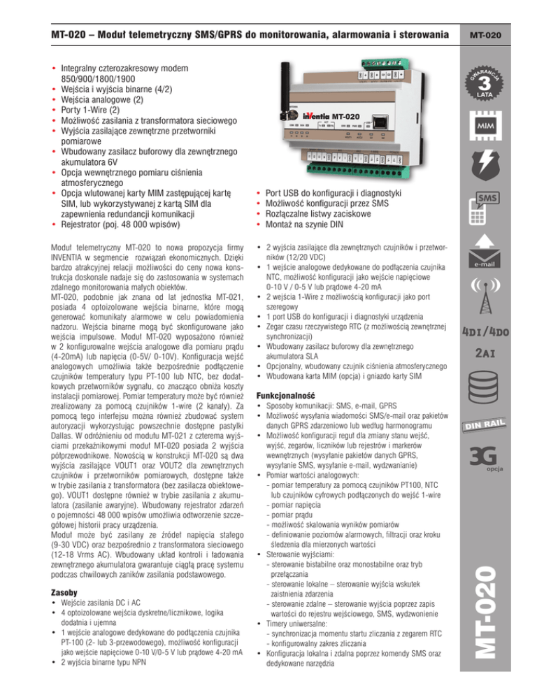 MT-020 – Moduł telemetryczny SMS/GPRS do monitorowania, alarmowania i sterowania Zasoby • Wejście zasilania DC i AC • 4 optoizolowane wejścia dyskretne/licznikowe, logika dodatnia i ujemna • 1 wejście analogowe dedykowane do podłączenia czujnika PT-100 (2- lub 3-przewodowego), możliwość konfiguracji jako wejście napięciowe 0-10 V/0-5 V lub prądowe 4-20 mA • 2 wyjścia binarne typu NPN G LATA MIM e-mail IP67 IP68 • Port USB do konfiguracji i diagnostyki • Możliwość konfiguracji przez SMS • Rozłączalne listwy zaciskowe • Montaż na szynie DIN • 2 wyjścia zasilające dla zewnętrznych czujników i przetworników (12/20 VDC) GPRS MODEM • 1 wejście analogowe dedykowane do podłączenia czujnika NTC, możliwość konfiguracji jako wejście napięciowe 0-10 V / 0-5 V lub prądowe 4-20 mA • 2 wejścia 1-Wire z możliwością konfiguracji jako port szeregowy • 1 port USB do konfiguracji i diagnostyki urządzenia • Zegar czasu rzeczywistego RTC (z możliwością zewnętrznej synchronizacji) • Wbudowany zasilacz buforowy dla zewnętrznego akumulatora SLA • Opcjonalny, wbudowany czujnik ciśnienia atmosferycznego • Wbudowana karta MIM (opcja) i gniazdo karty SIM IP67 e-mail 4di/4do GPRS 2ai MODEM Funkcjonalność • Sposoby komunikacji: SMS, e-mail, GPRS • Możliwość wysyłania wiadomości SMS/e-mail oraz pakietów danych GPRS zdarzeniowo lub według harmonogramu • Możliwość konfiguracji reguł dla zmiany stanu wejść, wyjść, zegarów, liczników lub rejestrów i markerów wewnętrznych (wysyłanie pakietów danych GPRS, wysyłanie SMS, wysyłanie e-mail, wydzwanianie) • Pomiar wartości analogowych: - pomiar temperatury za pomocą czujników PT100, NTC lub czujników cyfrowych podłączonych do wejść 1-wire - pomiar napięcia - pomiar prądu - możliwość skalowania wyników pomiarów - definiowanie poziomów alarmowych, filtracji oraz kroku śledzenia dla mierzonych wartości • Sterowanie wyjściami: - sterowanie bistabilne oraz monostabilne oraz tryb przełączania - sterowanie lokalne – sterowanie wyjścia wskutek zaistnienia zdarzenia - sterowanie zdalne – sterowanie wyjścia poprzez zapis wartości do rejestru wejściowego, SMS, wydzwonienie • Timery uniwersalne: - synchronizacja momentu startu zliczania z zegarem RTC - konfigurowalny zakres zliczania • Konfiguracja lokalna i zdalna poprzez komendy SMS oraz dedykowane narzędzia IP67 e-mail IL DIN RA opcja GPRS MODEM MT-020 Moduł telemetryczny MT-020 to nowa propozycja firmy INVENTIA w segmencie rozwiązań ekonomicznych. Dzięki bardzo atrakcyjnej relacji możliwości do ceny nowa konstrukcja doskonale nadaje się do zastosowania w systemach zdalnego monitorowania małych obiektów. MT-020, podobnie jak znana od lat jednostka MT-021, posiada 4 optoizolowane wejścia binarne, które mogą generować komunikaty alarmowe w celu powiadomienia nadzoru. Wejścia binarne mogą być skonfigurowane jako wejścia impulsowe. Moduł MT-020 wyposażono również w 2 konfigurowalne wejścia analogowe dla pomiaru prądu (4-20mA) lub napięcia (0-5V/ 0-10V). Konfiguracja wejść analogowych umożliwia także bezpośrednie podłączenie czujników temperatury typu PT-100 lub NTC, bez dodatkowych przetworników sygnału, co znacząco obniża koszty instalacji pomiarowej. Pomiar temperatury może być również zrealizowany za pomocą czujników 1-wire (2 kanały). Za pomocą tego interfejsu można również zbudować system autoryzacji wykorzystując powszechnie dostępne pastylki Dallas. W odróżnieniu od modułu MT-021 z czterema wyjściami przekaźnikowymi moduł MT-020 posiada 2 wyjścia półprzewodnikowe. Nowością w konstrukcji MT-020 są dwa wyjścia zasilające VOUT1 oraz VOUT2 dla zewnętrznych czujników i przetworników pomiarowych, dostępne także w trybie zasilania z transformatora (bez zasilacza obiektowego). VOUT1 dostępne również w trybie zasilania z akumulatora (zasilanie awaryjne). Wbudowany rejestrator zdarzeń o pojemności 48 000 wpisów umożliwia odtworzenie szczegółowej historii pracy urządzenia. Moduł może być zasilany ze źródeł napięcia stałego (9-30 VDC) oraz bezpośrednio z transformatora sieciowego (12-18 Vrms AC). Wbudowany układ kontroli i ładowania zewnętrznego akumulatora gwarantuje ciągłą pracę systemu podczas chwilowych zaników zasilania podstawowego. ARANC W JA • Integralny czterozakresowy modem 850/900/1800/1900 • Wejścia i wyjścia binarne (4/2) • Wejścia analogowe (2) • Porty 1-Wire (2) • Możliwość zasilania z transformatora sieciowego • Wyjścia zasilające zewnętrzne przetworniki pomiarowe • Wbudowany zasilacz buforowy dla zewnętrznego akumulatora 6V • Opcja wewnętrznego pomiaru ciśnienia atmosferycznego • Opcja wlutowanej karty MIM zastępującej kartę SIM, lub wykorzystywanej z kartą SIM dla zapewnienia redundancji komunikacji • Rejestrator (poj. 48 000 wpisów) MT-020 Dane Techniczne MT-020 • Obsługa kodów DTMF • Limity transmisji wiadomości SMS • Dynamiczne wstawianie wartości zmiennych w tekst wiadomości SMS • Programowe progi alarmowe (4), histereza i stała filtracji dla wejść analogowych • Kontrola ładowania zewnętrznego akumulatora • Diody LED (status modułu, aktywność komunikacji GSM/ GPRS, poziom sygnału GSM, stan we/wy binarnych) • Przyjazne narzędzia konfiguracyjne i diagnostyczne Ogólne Wejście akumulatora buforowego Napięcie robocze akumulatora Rodzaj akumulatora 6V kwasowo-ołowiowy / żelowy Maksymalny prąd ładowania (zalecana min. pojemność akumulatora*) * Należy zawsze sprawdzić specyfikację zastosowanego akumulatora. Wyjście zasilania VOUT1 (stabilizowane) Napięcie wyjściowe Maksymalny prąd wyjściowy 105x86x58 mm Waga 12 V lub 20 V 150 mA dla 20 V Wyjście zasilania VOUT2 (niestabilizowane) Napięcie wyjściowe Wymiary (dł. x szer. x wys.) 0,4 A (1,3 Ah) 0,8 A (3,0 Ah) Vzas -2 V Maksymalny prąd wyjściowy 50 mA 300 g Sp