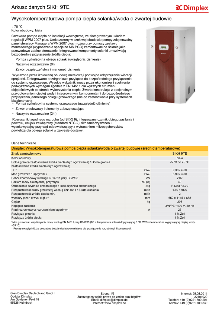 Arkusz danych SIKH 9TE Wysokotemperaturowa pompa ciepła solanka/woda o zwartej budowie : 70 °C Kolor obudowy: biała Grzewcza pompa ciepła do instalacji wewnętrznej ze zintegrowanym układem regulacji WPM 2007 plus. Umieszczony w czołowej obudowie pompy zdejmowalny panel sterujący Managera WPM 2007 plus można przy pomocy zestawu montażowego (wyposażenie specjalne MS PGD) zamontować na ścianie jako przewodowe zdalne sterowanie. Integrowane komponenty solanki umożliwiają bezpośrednie przyłączenie źródła ciepła: - Pompa cyrkulacyjna obiegu solanki (uwzględnić ciśnienie) - Naczynie rozszerzalne (8l) - Zawór bezpieczeństwa i manometr ciśnienia Wyciszona przez izolowaną obudowę metalową i podwójne odsprzężenie wibracji sprężarki. Zintegrowane bezdrganiowe przyłącze do bezpośredniego przyłączenia do systemu grzewczego. Wysokie wskaźniki mocy przez ekonomizer i spełnienie podwyższonych wymagań zgodnie z EN 14511 dla wyższych strumieni objętościowych po stronie wykorzystania ciepła. Zwarta konstrukcja z opcjonalnym przygotowaniem ciepłej wody i integrowanymi komponentami do bezpośredniego przyłączenia jednolitego obiegu grzewczego (nie do zastosowania przy systemach biwalentnych): - Pompa cyrkulacyjna systemu grzewczego (uwzględnić ciśnienie) - Zawór przelewowy i elementy zabezpieczające - Naczynie rozszerzalne (24l) Rozrusznik łagodnego rozruchu (od SI(K) 9), integrowany czujnik obiegu zasilania i powrotu, czujnik zewnętrzny (standard NTC-2), filtr zanieczyszczeń i wysokowydajny przyrząd odpowietrzający z wytrącaniem mikropęcherzyków powietrza dla obiegu solanki w zakresie dostawy. Dane techniczne Dimplex Wysokotemperaturowa pompa ciepła solanka/woda o zwartej budowie (średniotemperaturowe) Znak zamówieniowy SIKH 9TE Kolor obudowy Dolna granica zastosowania źródła ciepła (tryb ogrzewania) / Górna granica zastosowania źródła ciepła (tryb ogrzewania) / * Moc grzewcza 1 sprężarki / Pobór znamionowy według EN 14511 przy B0/W35 Poziom mocy akustycznej przyrządu Oznaczenie czynnika chłodniczego / Ilość czynnika chłodniczego Przepustowość wody grzewczej według EN14511 / Strata ciśnienia Przepustowość źródła ciepła min. wymiary (szer. x wys. x gł.)** Ciężar Napięcie zasilania Prąd rozruchowy z rozrusznikiem łagodnym Przyłącze grzania Przyłącze źródła ciepła biała -5 °C do 25 °C kW/kW/kW dB (A) -/kg m³/h m³/h mm kg A 9,30 / 4,50 8,90 / 3,50 2,07 49 R134a / 2,70 1,60 / 7000 2 652 x 1115 x 688 203 3/N/PE ~400 V, 50 Hz 26 1 ¼ Zoll 1 ¼ Zoll *Moc grzewcza i współczynnik mocy według EN 14511 przy B0/W35 (B0 = temperatura solanki dopływającej 0 °C, W35 = temperatura wypływającej ciepłej wody. +35 °C) **Proszę uwzględnić, że potrzebne będzie dodatkowe miejsce dla przyłączenia rur, obsługi i konserwacji. Glen Dimplex Deutschland GmbH Oddział Dimplex Am Goldenen Feld 18 95326 Kulmbach Strona 1/3 Zastrzegamy sobie prawo do zmian oraz błędów! Email: [email protected] Internet: www.dimplex.de Internet: 25.05.2011 22101020 Telefon: +49 (0)9221 709-201 Telefax: +49 (0)9221 709-339 Wyposażenie urządzenia SIKH 9TE Opis Typ-nr Numer artykułu Ilości przykładow e SIKH 9TE 356080 1 SYL 250 352260 AP SVT SVT 200 SVT 300 SVT 400 AFN 825 SWPR 500 348900 348910 348920 348930 328610 337500 1 PSP 100E CTHK 631 CTHK 632 CTHK 633 CTHK 634 PSW 100 PSW 200 PSW 500 VSH KS VSW KS EB KPV VTB 25 WWM 25 UPE 60 MMH 25 353360 336180 335910 322140 322150 351090 339830 339210 343110 343120 348650 339870 346600 358870 348640 1 HDLR 450 HCT 300 337450 351210 HL 11C HL 16C HL 26C HL 36C 351730 351740 351750 351760 WWSP 229E WWSP 332 FLH 60 FLHU 70 FLH 25M SVK 852 WWSP 880 WWSP 442E 353380 346610 338060 338070 349430 326660 337880 353370 PWS 332 348620 WPG 25 356030 1 UP 60 340300 1 NWPM EWPM LWPM 410 RBG WPM MS PGD AP PGD FG 3115 KRRV 003 356960 356970 339410 339700 353810 356570 336620 322070 Sztuk Cena Pompa ciepła Wysokotemperaturowa pompa ciepła solanka/woda o zwartej budowie Elastyczne taśmy izolacyjne do podłożenia Wyposażenie dodatkowe źródła ciepła Zestaw przyłączeniowy rozdzielacza solanki Rozdzielacz obiegu solanki 2 krotny Rozdzielacz obiegu solanki 3 krotny Rozdzielacz obiegu solanki 4 krotny Środek przeciw zamarzaniu dla obiegu solanki 20 l Presorat niskiego ciśnienia solanki 3 Akcesoria hydrauliczne Zbiornik buforowy do zabudowy pod pompą Grzałka 2,0 kW Grzałka 2,9 kW CTHK 632 Grzałka 4,5 kW CTHK 633 Grzałka 6,0 kW CTHK 634 Podstawa zbiornika buforowego 100l* Podstawa zbiornika buforowego 200 l* Uniwersalny zbiornik buforowy 500 l* Zestaw połączeniowego grzania Zestaw uzupełniający ciepłej wody Dodatkowe podzespoły EB KPV Belka rozdzielacza Moduł ciepłej wody / moduł niemieszanego obiegu grzewczego Elektronicznie regulowana pompa obiegowa dla wody grzewczej Mieszany obieg grzewczy z czujnikiem temperatury 1 1 Akcesoria do ogrzewania Podzespoły rur do grzałek* Ogrzewanie rurowe 3 kW Akcesoria do ogrzewania i chłodzenia Konwektor wentylatorowy grzanie/chłodzenie* Konwektor wentylatorowy grzanie/chłodzenie* Konwektor wentylatorowy grzanie/chłodzenie* Konwektor wentylatorowy grzanie/chłodzenie* Wyposażenie dodatkowe przygotowania ciepłej wody Zbiornik ciepłej wody zabudowany pod pompą* Zasobnik ciepłej wody 300 l z czujnikiem temperatury Ogrzewanie kołnierzowe do ciepłej wody Ogrzewanie kołnierzowe do ciepłej wody Ogrzewanie kołnierzowe FLH 25M Układ zaworów zabezpieczających Zasobnik ciepłej wody 400 l z czujnikiem temperatury* Design zasobnik ciepłej wody z obudową z blachy i czujnikiem temperatury* Kombinacja zbiorników dla ogrzewania i przygotowania ciepłej wody* Seria pomp DN 25 do bezpośredniego podłączenia zbiornika ciepłej wody Pompa obiegowa wody grzewczej 1 1 Wyposażenie dodatkowe techniki regulacji Rozszerzenie dla podłączenia sieci Ethernet Rozszerzenie dla przyłączenia magistrali KNX/EIB Karta wtykowa menedżera pompy ciep