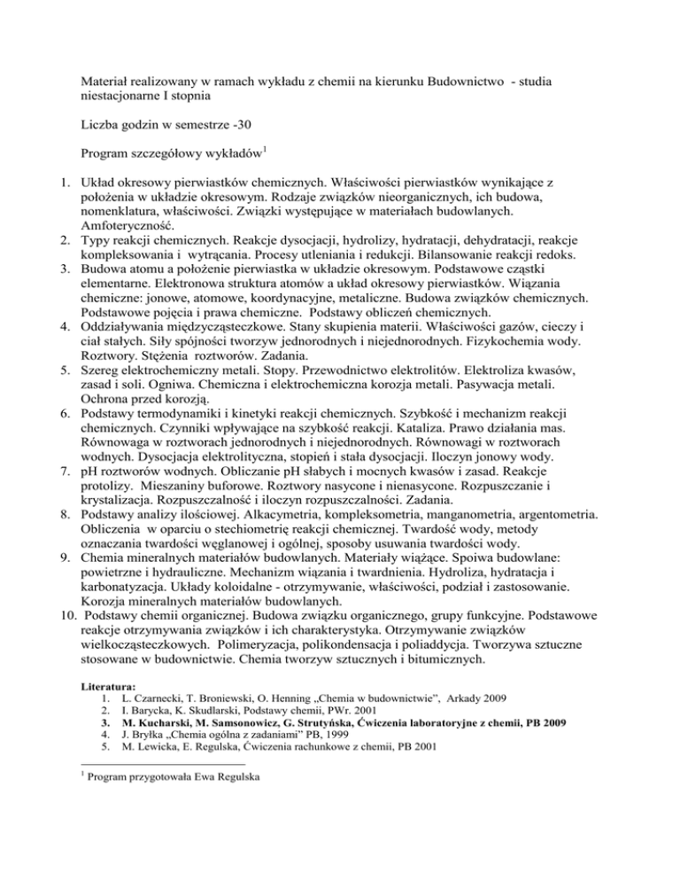 Materiał realizowany w ramach wykładu z chemii na kierunku Budownictwo - studia niestacjonarne I stopnia Liczba godzin w semestrze -30 Program szczegółowy wykładów1 1. Układ okresowy pierwiastków chemicznych. Właściwości pierwiastków wynikające z położenia w układzie okresowym. Rodzaje związków nieorganicznych, ich budowa, nomenklatura, właściwości. Związki występujące w materiałach budowlanych. Amfoteryczność. 2. Typy reakcji chemicznych. Reakcje dysocjacji, hydrolizy, hydratacji, dehydratacji, reakcje kompleksowania i wytrącania. Procesy utleniania i redukcji. Bilansowanie reakcji redoks. 3. Budowa atomu a położenie pierwiastka w układzie okresowym. Podstawowe cząstki elementarne. Elektronowa struktura atomów a układ okresowy pierwiastków. Wiązania chemiczne: jonowe, atomowe, koordynacyjne, metaliczne. Budowa związków chemicznych. Podstawowe pojęcia i prawa chemiczne. Podstawy obliczeń chemicznych. 4. Oddziaływania międzycząsteczkowe. Stany skupienia materii. Właściwości gazów, cieczy i ciał stałych. Siły spójności tworzyw jednorodnych i niejednorodnych. Fizykochemia wody. Roztwory. Stężenia roztworów. Zadania. 5. Szereg elektrochemiczny metali. Stopy. Przewodnictwo elektrolitów. Elektroliza kwasów, zasad i soli. Ogniwa. Chemiczna i elektrochemiczna korozja metali. Pasywacja metali. Ochrona przed korozją. 6. Podstawy termodynamiki i kinetyki reakcji chemicznych. Szybkość i mechanizm reakcji chemicznych. Czynniki wpływające na szybkość reakcji. Kataliza. Prawo działania mas. Równowaga w roztworach jednorodnych i niejednorodnych. Równowagi w roztworach wodnych. Dysocjacja elektrolityczna, stopień i stała dysocjacji. Iloczyn jonowy wody. 7. pH roztworów wodnych. Obliczanie pH słabych i mocnych kwasów i zasad. Reakcje protolizy. Mieszaniny buforowe. Roztwory nasycone i nienasycone. Rozpuszczanie i krystalizacja. Rozpuszczalność i iloczyn rozpuszczalności. Zadania. 8. Podstawy analizy ilościowej. Alkacymetria, kompleksometria, manganometria, argentometria. Obliczenia w oparciu o stechiometrię reakcji chemicznej. Twardość wody, metody oznaczania twardości węglanowej i ogólnej, sposoby usuwania twardości wody. 9. Chemia mineralnych materiałów budowlanych. Materiały wiążące. Spoiwa budowlane: powietrzne i hydrauliczne. Mechanizm wiązania i twardnienia. Hydroliza, hydratacja i karbonatyzacja. Układy koloidalne - otrzymywanie, właściwości, podział i zastosowanie. Korozja mineralnych materiałów budowlanych. 10. Podstawy chemii organicznej. Budowa związku organicznego, grupy funkcyjne. Podstawowe reakcje otrzymywania związków i ich charakterystyka. Otrzymywanie związków wielkocząsteczkowych. Polimeryzacja, polikondensacja i poliaddycja. Tworzywa sztuczne stosowane w budownictwie. Chemia tworzyw sztucznych i bitumicznych. Literatura: 1. L. Czarnecki, T. Broniewski, O. Henning „Chemia w budownictwie”, Arkady 2009 2. I. Barycka, K. Skudlarski, Podstawy chemii, PWr. 2001 3. M. Kucharski, M. Samsonowicz, G. Strutyńska, Ćwiczenia laboratoryjne z chemii, PB 2009 4. J. Bryłka „Chemia ogólna z zadaniami” PB, 1999 5. M. Lewicka, E. Regulska, Ćwiczenia rachunkowe z chemii, PB 2001 1 Program przygotowała Ewa Regulska