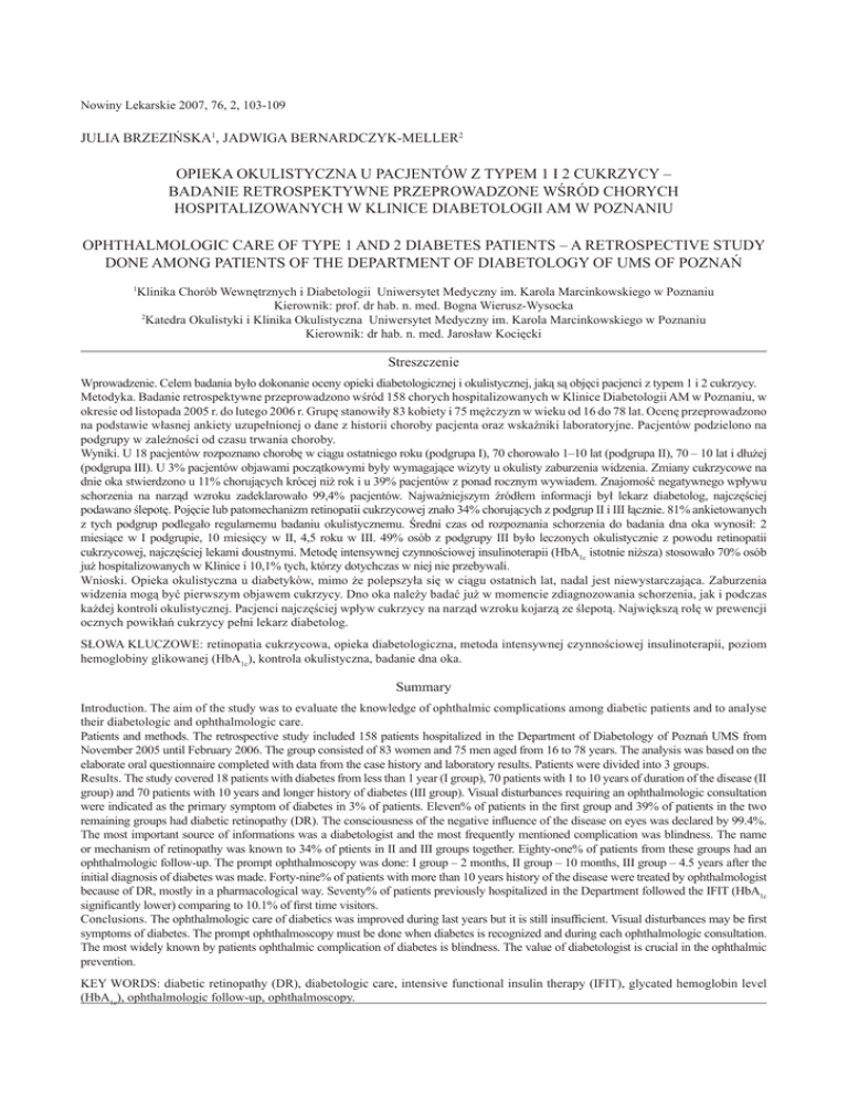 Nowiny Lekarskie 2007, 76, 2, 103-109 JULIA BRZEZIŃSKA1, JADWIGA BERNARDCZYK-MELLER2 OPIEKA OKULISTYCZNA U PACJENTÓW Z TYPEM 1 I 2 CUKRZYCY – BADANIE RETROSPEKTYWNE PRZEPROWADZONE WŚRÓD CHORYCH HOSPITALIZOWANYCH W KLINICE DIABETOLOGII AM W POZNANIU OPHTHALMOLOGIC CARE OF TYPE 1 AND 2 DIABETES PATIENTS – A RETROSPECTIVE STUDY DONE AMONG PATIENTS OF THE DEPARTMENT OF DIABETOLOGY OF UMS OF POZNAŃ 1 Klinika Chorób Wewnętrznych i Diabetologii Uniwersytet Medyczny im. Karola Marcinkowskiego w Poznaniu Kierownik: prof. dr hab. n. med. Bogna Wierusz-Wysocka 2 Katedra Okulistyki i Klinika Okulistyczna Uniwersytet Medyczny im. Karola Marcinkowskiego w Poznaniu Kierownik: dr hab. n. med. Jarosław Kocięcki Streszczenie Wprowadzenie. Celem badania było dokonanie oceny opieki diabetologicznej i okulistycznej, jaką są objęci pacjenci z typem 1 i 2 cukrzycy. Metodyka. Badanie retrospektywne przeprowadzono wśród 158 chorych hospitalizowanych w Klinice Diabetologii AM w Poznaniu, w okresie od listopada 2005 r. do lutego 2006 r. Grupę stanowiły 83 kobiety i 75 mężczyzn w wieku od 16 do 78 lat. Ocenę przeprowadzono na podstawie własnej ankiety uzupełnionej o dane z historii choroby pacjenta oraz wskaźniki laboratoryjne. Pacjentów podzielono na podgrupy w zależności od czasu trwania choroby. Wyniki. U 18 pacjentów rozpoznano chorobę w ciągu ostatniego roku (podgrupa I), 70 chorowało 1–10 lat (podgrupa II), 70 – 10 lat i dłużej (podgrupa III). U 3% pacjentów objawami początkowymi były wymagające wizyty u okulisty zaburzenia widzenia. Zmiany cukrzycowe na dnie oka stwierdzono u 11% chorujących krócej niż rok i u 39% pacjentów z ponad rocznym wywiadem. Znajomość negatywnego wpływu schorzenia na narząd wzroku zadeklarowało 99,4% pacjentów. Najważniejszym źródłem informacji był lekarz diabetolog, najczęściej podawano ślepotę. Pojęcie lub patomechanizm retinopatii cukrzycowej znało 34% chorujących z podgrup II i III łącznie. 81% ankietowanych z tych podgrup podlegało regularnemu badaniu okulistycznemu. Średni czas od rozpoznania schorzenia do badania dna oka wynosił: 2 miesiące w I podgrupie, 10 miesięcy w II, 4,5 roku w III. 49% osób z podgrupy III było leczonych okulistycznie z powodu retinopatii cukrzycowej, najczęściej lekami doustnymi. Metodę intensywnej czynnościowej insulinoterapii (HbA1c istotnie niższa) stosowało 70% osób już hospitalizowanych w Klinice i 10,1% tych, którzy dotychczas w niej nie przebywali. Wnioski. Opieka okulistyczna u diabetyków, mimo że polepszyła się w ciągu ostatnich lat, nadal jest niewystarczająca. Zaburzenia widzenia mogą być pierwszym objawem cukrzycy. Dno oka należy badać już w momencie zdiagnozowania schorzenia, jak i podczas każdej kontroli okulistycznej. Pacjenci najczęściej wpływ cukrzycy na narząd wzroku kojarzą ze ślepotą. Największą rolę w prewencji ocznych powikłań cukrzycy pełni lekarz diabetolog. SŁOWA KLUCZOWE: retinopatia cukrzycowa, opieka diabetologiczna, metoda intensywnej czynnościowej insulinoterapii, poziom hemoglobiny glikowanej (HbA1c), kontrola okulistyczna, badanie dna oka. Summary Introduction. The aim of the study was to evaluate the knowledge of ophthalmic complications among diabetic patients and to analyse their diabetologic and ophthalmologic care. Patients and methods. The retrospective study included 158 patients hospitalized in the Department of Diabetology of Poznań UMS from November 2005 until February 2006. The group consisted of 83 women and 75 men aged from 16 to 78 years. The analysis was based on the elaborate oral questionnaire completed with data from the case history and laboratory results. Patients were divided into 3 groups. Results. The study covered 18 patients with diabetes from less than 1 year (I group), 70 patients with 1 to 10 years of duration of the disease (II group) and 70 patients with 10 years and longer history of diabetes (III group). Visual disturbances requiring an ophthalmologic consultation were indicated as the primary symptom of diabetes in 3% of patients. Eleven% of patients in the first group and 39% of patients in the two remaining groups had diabetic retinopathy (DR). The consciousness of the negative influence of the disease on eyes was declared by 99.4%. The most important source of informations was a diabetologist and the most frequently mentioned complication was blindness. The name or mechanism of retinopathy was known to 34% of ptients in II and III groups together. Eighty-one% of patients from these groups had an ophthalmologic follow-up. The prompt ophthalmoscopy was done: I group – 2 months, II group – 10 months, III group – 4.5 years after the initial diagnosis of diabetes was made. Forty-nine% of patients with more than 10 years history of the disease were treated by ophthalmologist because of DR, mostly in a pharmacological way. Seventy% of patients previously hospitalized in the Department followed the IFIT (HbA1c significantly lower) comparing to 10.1% of first time visitors. Conclusions. The ophthalmologic care of diabetics was improved during last years but it is still insufficient. Visual disturbances may be first symptoms of diabetes. The prompt ophthalmoscopy must be done when diabetes is recognized and during each ophthalmologic consultation. The most widely known by patients ophthalmic complication of diabetes is blindness. The value of diabetologist is crucial in the ophthalmic prevention. KEY WORDS: diabetic retinopathy (DR), diabetologic care, intensive functional insulin therapy (IFIT), glycated hemoglobin level (HbA1c), ophthalmologic follow-up, ophthalmoscopy. 104 Przemysław Julia Brzezińska Lisiński i inni i inni Wprowadzenie Wpływ cukrzycy na narząd wzroku przejawia się w postaci swoistego powikłania choroby, jakim jest retinopatia cukrzycowa oraz w predysponowaniu do występowania innych zaburzeń ocznych. Retinopatia cukrzycowa stanowi najpoważniejsze powik