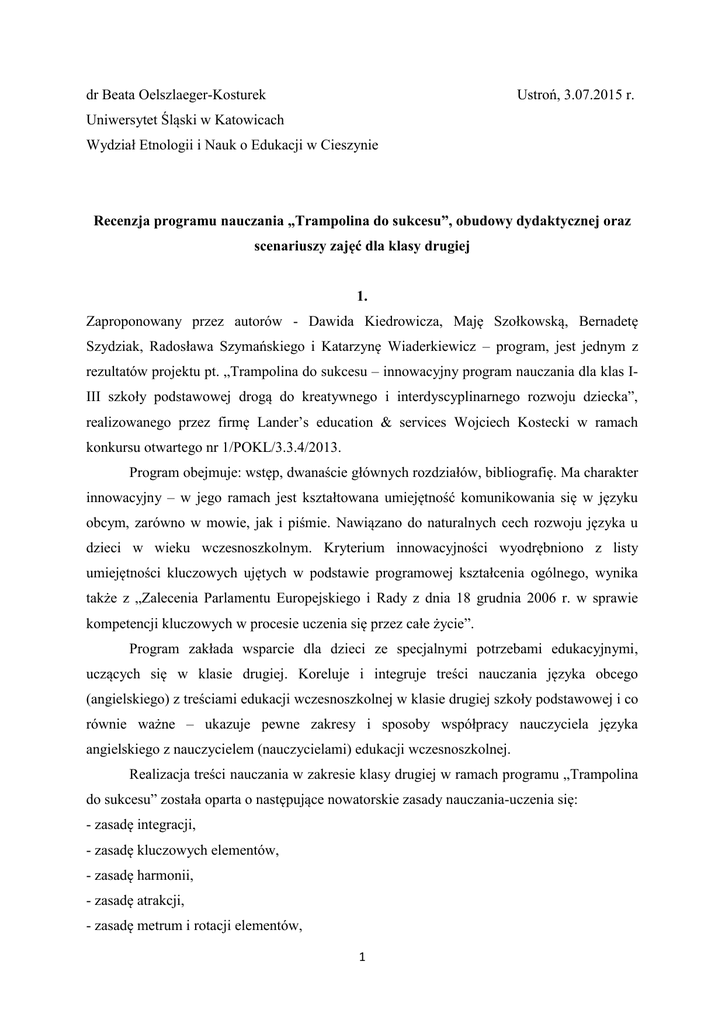 Ustroń, 3.07.2015 r. dr Beata Oelszlaeger-Kosturek Uniwersytet Śląski w Katowicach Wydział Etnologii i Nauk o Edukacji w Cieszynie Recenzja programu nauczania „Trampolina do sukcesu”, obudowy dydaktycznej oraz scenariuszy zajęć dla klasy drugiej 1. Zaproponowany przez autorów - Dawida Kiedrowicza, Maję Szołkowską, Bernadetę Szydziak, Radosława Szymańskiego i Katarzynę Wiaderkiewicz – program, jest jednym z rezultatów projektu pt. „Trampolina do sukcesu – innowacyjny program nauczania dla klas IIII szkoły podstawowej drogą do kreatywnego i interdyscyplinarnego rozwoju dziecka”, realizowanego przez firmę Lander’s education & services Wojciech Kostecki w ramach konkursu otwartego nr 1/POKL/3.3.4/2013. Program obejmuje: wstęp, dwanaście głównych rozdziałów, bibliografię. Ma charakter innowacyjny – w jego ramach jest kształtowana umiejętność komunikowania się w języku obcym, zarówno w mowie, jak i piśmie. Nawiązano do naturalnych cech rozwoju języka u dzieci w wieku wczesnoszkolnym. Kryterium innowacyjności wyodrębniono z listy umiejętności kluczowych ujętych w podstawie programowej kształcenia ogólnego, wynika także z „Zalecenia Parlamentu Europejskiego i Rady z dnia 18 grudnia 2006 r. w sprawie kompetencji kluczowych w procesie uczenia się przez całe życie”. Program zakłada wsparcie dla dzieci ze specjalnymi potrzebami edukacyjnymi, uczących się w klasie drugiej. Koreluje i integruje treści nauczania języka obcego (angielskiego) z treściami edukacji wczesnoszkolnej w klasie drugiej szkoły podstawowej i co równie ważne – ukazuje pewne zakresy i sposoby współpracy nauczyciela języka angielskiego z nauczycielem (nauczycielami) edukacji wczesnoszkolnej. Realizacja treści nauczania w zakresie klasy drugiej w ramach programu „Trampolina do sukcesu” została oparta o następujące nowatorskie zasady nauczania-uczenia się: - zasadę integracji, - zasadę kluczowych elementów, - zasadę harmonii, - zasadę atrakcji, - zasadę metrum i rotacji elementów, 1 - zasadę inicjatywy i aktywności każdego dziecka, - zasadę „pół na pół”, - zasadę partycypacji dorosłych, - zasadę warstw językowych, - zasadę oceniania kształtującego-uczenia się. Treści programu mają być realizowane w oparciu o jego innowacyjną obudowę dydaktyczną. Program „Trampolina do sukcesu”, przeznaczony do realizacji w klasie drugiej, jasno określa adresatów – odbiorców programu (uczniów klasy drugiej), realizatorów programu (nauczycieli), partnerów programu (rodziców), warunki organizacyjne i środki techniczne (organizacja przestrzeni edukacyjnej z różnorodnością użytkową środków dydaktycznych. W programie zostały wyodrębnione szczegółowe cele kształcenia i wychowania oraz zostały opisane sposoby ich realizacji w zakresie: edukacji polonistycznej, nowożytnego języka obcego, edukacji muzycznej, edukacji plastycznej, edukacji społecznej, edukacji przyrodniczej, edukacji matematycznej, zajęć komputerowych, zajęć technicznych, wychowania fizycznego i edukacji zdrowotnej. Program uwzględnia w całości wymogi odnośnie celów i treści kształcenia wynikające z podstawy programowej. Odpowiednie ich uszczegółowienie, sposoby środki i warunki ich realizacji znalazły swoje odzwierciedlenie w obudowie programu, w tym – w scenariuszach lekcji z języka angielskiego oraz zajęć edukacyjnych w klasie drugiej. Innowacyjnym elementem programu jest wprowadzenie informacji o możliwych i spodziewanych rezultatach nauki języka obcego w przedszkolu oraz warunkach i sposobach realizacji podstawy programowej wychowania przedszkolnego w zakresie przygotowania dziecka do posługiwania się językiem obcym nowożytnym, w tym – do kontynuacji tej nauki w klasie pierwszej, a następnie w klasie drugiej. Są to istotne informacje dla nauczyciela języka obcego, który musi wiedzieć, na jakim poziomie językowym mogą być uczniowie, z którymi rozpoczyna i kontynuuje. Interesujące jest także wprowadzenie informacji o drugim etapie edukacyjnym – celów kształcenia i wymagań ogólnych w zakresie nauki języka obcego nowożytnego. Są to równie ważne informacje dla nauczyciela języka obcego, który musi wiedzieć, jakie będą kolejne cele i zadania, stawiane przed jego uczniami po ukończeniu klasy trzeciej. Program zawiera cele kształcenia oraz ogólne wymagania związane z ich realizacją – aktualną podstawę programową do edukacji wczesnoszkolnej. Wiele miejsca poświęcono omówieniu: 2 - metod nauczania języka obcego w klasie drugiej: Total Physical Response (TPR) – metodzie reagowania całym ciałem, metodzie audiolingwalnej, podejściu komunikacyjnemu, Community Language Learning (CLL) – nauczaniu doradczemu; - formom nauczania języka obcego w klasie drugiej – zbiorowej, indywidualnej, pracy w parach, grupowej; - technikom nauczania języka obcego w klasie drugiej (piosenki, rymowanki, wierszyki; gry i zabawy; teksty narracyjne; poznanie kinestetyczne; dryle językowe; gotowe frazy leksykalne, używanie pomocy wizualnych; używanie materiałów autentycznych; tablica multimedialna). Bardzo szczegółowo omówiono problem integracji treści nauczania języka angielskiego z innymi treściami edukacji wczesnoszkolnej realizowanymi w klasie drugiej. Ukazano przykładowy przebieg zajęć edukacyjnych, a także przedstawiono ramowy plan dydaktyczny z nowożytnego języka obcego dla klasy pierwszej i ramowy plan integracji treści nowożytnego języka obcego z treściami pozostałych rodzajów edukacji. W odrębnym rozdziale programu uwzględniono treści nauczania w zakresie edukacji wczesnoszkolnej – w tym - dla klasy drugiej. Wzorzec ten wystarczy przenieść na przykłady rozkładu materiału z języka angielskiego dla klasy drugiej oraz scenariusze lekcji z języka angielskiego i z edukacji wczesnoszkolnej dla klasy drugiej, ujęte w obudowie programu i zastosować, traktując g
