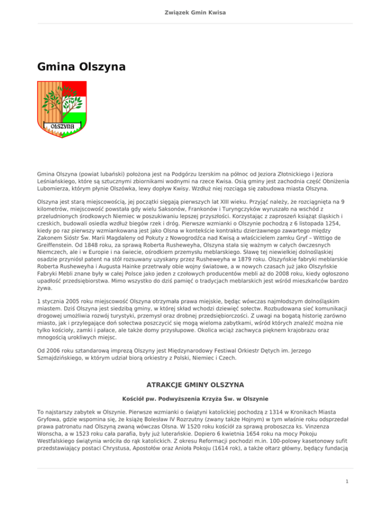 Związek Gmin Kwisa Gmina Olszyna Gmina Olszyna (powiat lubański) położona jest na Podgórzu Izerskim na północ od Jeziora Złotnickiego i Jeziora Leśniańskiego, które są sztucznymi zbiornikami wodnymi na rzece Kwisa. Osią gminy jest zachodnia część Obniżenia Lubomierza, którym płynie Olszówka, lewy dopływ Kwisy. Wzdłuż niej rozciąga się zabudowa miasta Olszyna. Olszyna jest starą miejscowością, jej początki sięgają pierwszych lat XIII wieku. Przyjąć należy, że rozciągnięta na 9 kilometrów, miejscowość powstała gdy wielu Saksonów, Frankonów i Turyngczyków wyruszało na wschód z przeludnionych środkowych Niemiec w poszukiwaniu lepszej przyszłości. Korzystając z zaproszeń książąt śląskich i czeskich, budowali osiedla wzdłuż biegów rzek i dróg. Pierwsze wzmianki o Olszynie pochodzą z 6 listopada 1254, kiedy po raz pierwszy wzmiankowana jest jako Olsna w kontekście kontraktu dzierżawnego zawartego między Zakonem Sióstr Św. Marii Magdaleny od Pokuty z Nowogrodźca nad Kwisą a właścicielem zamku Gryf – Wittigo de Greiffenstein. Od 1848 roku, za sprawą Roberta Rusheweyha, Olszyna stała się ważnym w całych ówczesnych Niemczech, ale i w Europie i na świecie, ośrodkiem przemysłu meblarskiego. Sławę tej niewielkiej dolnośląskiej osadzie przyniósł patent na stół rozsuwany uzyskany przez Rusheweyha w 1879 roku. Olszyńskie fabryki meblarskie Roberta Rusheweyha i Augusta Hainke przetrwały obie wojny światowe, a w nowych czasach już jako Olszyńskie Fabryki Mebli znane były w całej Polsce jako jeden z czołowych producentów mebli aż do 2008 roku, kiedy ogłoszono upadłość przedsiębiorstwa. Mimo wszystko do dziś pamięć o tradycjach meblarskich jest wśród mieszkańców bardzo żywa. 1 stycznia 2005 roku miejscowość Olszyna otrzymała prawa miejskie, będąc wówczas najmłodszym dolnośląskim miastem. Dziś Olszyna jest siedzibą gminy, w której skład wchodzi dziewięć sołectw. Rozbudowana sieć komunikacji drogowej umożliwia rozwój turystyki, przemysł oraz drobnej przedsiębiorczości. Z uwagi na bogatą historię zarówno miasto, jak i przylegające doń sołectwa poszczycić się mogą wieloma zabytkami, wśród których znaleźć można nie tylko kościoły, zamki i pałace, ale także domy przysłupowe. Okolica wciąż zachwyca pięknem krajobrazu oraz mnogością urokliwych miejsc. Od 2006 roku sztandarową imprezą Olszyny jest Międzynarodowy Festiwal Orkiestr Dętych im. Jerzego Szmajdzińskiego, w którym udział biorą orkiestry z Polski, Niemiec i Czech. ATRAKCJE GMINY OLSZYNA Kościół pw. Podwyższenia Krzyża Św. w Olszynie To najstarszy zabytek w Olszynie. Pierwsze wzmianki o świątyni katolickiej pochodzą z 1314 w Kronikach Miasta Gryfowa, gdzie wspomina się, że książę Bolesław IV Rozrzutny (zwany także Hojnym) w tym właśnie roku odsprzedał prawa patronatu nad Olszyną zwaną wówczas Olsna. W 1520 roku kościół za sprawą proboszcza ks. Vinzenza Wonscha, a w 1523 roku cała parafia, były już luterańskie. Dopiero 6 kwietnia 1654 roku na mocy Pokoju Westfalskiego świątynia wróciła do rąk katolickich. Z okresu Reformacji pochodzi m.in. 100-polowy kasetonowy sufit przedstawiający postaci Chrystusa, Apostołów oraz Anioła Pokoju (1614 rok), a także ołtarz główny, będący fundacją 1 Związek Gmin Kwisa rodziny von Uechtritz (1652 rok). Wśród zabytkowego wyposażenia wymienić należy m.in. romańską chrzcielnicę, a także tzw. Ołtarz Oliwny z pocz. XVIII wieku. Do kościoła przylega barokowa dzwonnica, która dobudowana została w latach 1709-1711 przez ówczesnego właściciela Majątku Zamkowego barona Abrahama Ernsta von Döbschütz. Z kościołem związane są liczne legendy, m.in. z czasów wojen husyckich. Kościół pw. św. Józefa Oblubieńca NMP w Olszynie Druga świątynia ewangelicka w Olszynie po tej, która wybudowana została w latach 1740-1742 w centrum miejscowości za zgodą króla pruskiego Fryderyka II Wielkiego. Obecny kościół, zbudowany w latach 1895-1897 w stylu neogotyckim i poświęcony 23 września 1897 roku, powstał w innym miejscu niż pierwszy, na wzgórzu powyżej Olszówki. Wszystko po to, aby ochronić dom Boży od powodzi, która kilkakrotnie w XIX wieku nawiedziła Olszynę. Od lipca 1946 roku kościół pełni funkcje katolickiej świątyni parafialnej pw. Św. Józefa Oblubieńca NMP. W kościele znajdują się zabytkowe ołtarze z XVII i XIX wieku, a także organy firmy Schlag&Söhne ze Świdnicy. Kościół pw. św. Antoniego Padewskiego w Biedrzychowicach Kościół w Biedrzychowicach wybudowany został w latach 1654-1656 i pełnił funkcję tzw. Grenzkirche - kościoła granicznego "Zum Jesusbrunnen". Uczęszczali do niego ewangelicy nie tylko z Biedrzychowic, ale również z Olszyny, Gryfowa i okolic. Od 1946 roku kościół stał się świątynią katolicką pw. Św. Antoniego. Wewnątrz świątyni zobaczyć można zabytkowy ołtarz główny, organy, a także doskonale zachowaną kaplicę grobową właścicieli Biedrzychowic w latach 1668-1787 – rodziny von Schweinitz. Pałac w Biedrzychowicach Pierwsze wzmianki o dworze szlacheckim w Biedrzychowicach pochodzą z 1527 roku za czasów kiedy wieś była w rękach rodziny von Nostitz. W 1702 roku Moritz Christian von Schweinitz przebudował dwór w okazały barokowy pałac. Jest to okazała trzykondygnacyjna budowla pokryta mansardowym dachem. Do głównego wejścia prowadzi most z suchą fosą. Budynek otoczony jest pięknym parkiem w stylu angielskim. Właścicielem, którzy przyczynił się do rozkwitu wsi był baron Aleksander von Minutoli - wielki kolekcjoner dzieł sztuki, posiadający kolekcje szkieł weneckich, ceramiki egipskiej, etruskiej czy greckiej. Jego zbiory zawierały też mumie i maski afrykańskie. Jako mecenas sztuki odrestaurował zamek Rajsko nad Jeziorem Złotnickim. Kolejnym właścicielem poprzez małżeństwo z córką Anną b