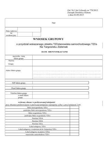 Zał. Nr 2 do Uchwały nr 778/2015 Zarządu Dzielnicy Ochota z dnia 02.09.2015 logo Data wpływu Nr ewidencyjny WNIOSEK GRUPOWY o przydział wskazanego obiektu TZI/stanowiska samochodowego TZI/s Na Targowisku Zieleniak DANE IDENTYFIKACYJNE nazwisko imię lidera grupy Nazwa Grupy Adres lidera grupy ……………………………………………………………………………………….. ……………………………………………………………………………………….. ……………………………………………………………………………………….. NIP lidera grupy Pesel lidera grupy Telefon lidera grupy e-mail lidera grupy wybrany obszar w preferowanej kolejności przy obszarze preferowanym w pierwszej kolejności wpisujemy cyfrę 1, przy kolejnym 2 itd.. Boks niewygrodzony TZI/e podwójny Boks niewygrodzony TZI/e Boks wygrodzony TZI/e podwójny Boks wygrodzony TZI/e Pawilon TZI/d Pawilon TZI/b Pawilon TZI/a Lokal usługowy TZI/c Lokal usługowy z wejściem od ul. Grójeckiej TZI/c Lokal usługowy na piętrze TZI/p stanowiska samochodowe TZI/s Zał. Nr 2 do Uchwały nr 778/2015 Zarządu Dzielnicy Ochota z dnia 02.09.2015 Informacje o grupie: 1. Forma współpracy: ………………………………………………………………………………………. …………………………………………………………………………………………………………… …………………………………………………………………………………………………………… 2. Członkowie: LP funkcja Imię i nazwisko 1 ……………………………………. ………………………………………………………………… 2 ……………………………………. ………………………………………………………………… 3 ……………………………………. ………………………………………………………………… 4 ……………………………………. ………………………………………………………………… 5 ……………………………………. ………………………………………………………………… 6 ……………………………………. ………………………………………………………………… 7 ……………………………………. ………………………………………………………………… 8 ……………………………………. ………………………………………………………………… 9 ……………………………………. ………………………………………………………………… 10 ……………………………………. ………………………………………………………………… Do wniosku należy dołączyć: 1. Kopię umowy określająca zasady współpracy grupy 2. Wypełnione i podpisane indywidualnie przez członków grupy formularze: „Dane Członka Grupy”. Zał. Nr 2 do Uchwały nr 778/2015 Zarządu Dzielnicy Ochota z dnia 02.09.2015 Dane Członka Grupy o nazwie: ……………………………………………… DANE IDENTYFIKACYJNE nazwisko imię Adres ……………………………………………………………………………………….. ……………………………………………………………………………………….. ……………………………………………………………………………………….. NIP Pesel telefon e-mail Indywidualna działalność gosp. rolnik spółka (podać KRS) Informacja o aktualnym statusie wnioskodawcy na Targowiskach: Banacha/Zastępcze Należy postawić znak X w kratce po prawej stronie od rubryki w której opis jest zgodny ze statusem wnioskodawcy 1. Nie prowadzę od 30.06.2012r działalności na Targowiskach Banacha i Zastępcze 2. Posiadałem ważną w okresie 14.09.2006r – 30.06.2012 umowę dzierżawy/użyczenia gruntu na Południowej części Targowiska Banacha 3. Nie mam zalęgłości w opłatach z tytułu ww. umowy 1. Posiadałem ważną w okresie 14.09.2006r – 30.06.2012 umowę dzierżawy/użyczenia gruntu na Południowej części Targowiska Banacha 2. Nie mam zalęgłości w opłatach z tytułu umowy dzierżawy na Targowiskach: Banacha 3. Po 30.06.2012r nie podnajmowałem ponad 50% przedmiotu dzierżawy Nie spełniam ww. wymagań, wystąpiłem do Zarządu Dzielnicy Ochota o zgodę na rozpatrzenie mojego wniosku w pierwszej turze. …... Zał. Nr 2 do Uchwały nr 778/2015 Zarządu Dzielnicy Ochota z dnia 02.09.2015 Wyrażam zgodę na: 1. Warunki umowy dzierżawy/najmu określone w Zarządzeniu nr 1507/2011 Prezydenta m. st. Warszawy z dnia 14.09.2011r 2. Wysokość opłat określoną Uchwałą Zarządu Dzielnicy nr 781 z dnia 02.09.2015r 3. Rozwiązanie umowy dzierżawy gruntu/pawilonu na Targowisku Banacha lub zastępczym z chwilą podpisania umowy której dotyczy niniejszy wniosek. Oświadczam, iż w przypadku uzyskania przez grupę przydziału obiektu, mój indywidualny wniosek o przydział obiektu TZI/ stanowiska samochodowego TZI/s należy uznać za niebyły. PODPIS