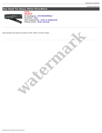 Informacje o produkcie Utworzono 03-03-2017 Dye Head Tie Heavy Metal Olive/Black Cena : 59,90 zł Nr katalogowy : DY27003HMOLV Producent : Dye Stan magazynowy : brak w magazynie Średnia ocena : brak recenzji w at er m ar k Kiedy potrzebny jest szybki lans pojawia sie DYE. Krótko i na temat. Kropka. Wygenerowano w programie www.oscGold.com