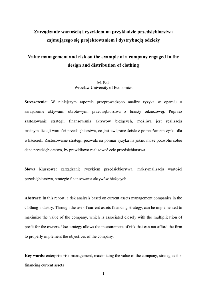 Zarządzanie wartością i ryzykiem na przykładzie przedsiębiorstwa zajmującego się projektowaniem i dystrybucją odzieży Value management and risk on the example of a company engaged in the design and distribution of clothing M. Bąk Wroclaw University of Economics Streszczenie: W niniejszym raporcie przeprowadzono analizę ryzyka w oparciu o zarządzanie aktywami obrotowymi przedsiębiorstwa z branży odzieżowej. Poprzez zastosowanie strategii finansowania aktywów bieżących, możliwa jest realizacja maksymalizacji wartości przedsiębiorstwa, co jest związane ściśle z pomnażaniem zysku dla właścicieli. Zastosowanie strategii pozwala na pomiar ryzyka na jakie, może pozwolić sobie dane przedsiębiorstwo, by prawidłowo realizować cele przedsiębiorstwa. Słowa kluczowe: zarządzanie ryzykiem przedsiębiorstwa, maksymalizacja wartości przedsiębiorstwa, strategie finansowania aktywów bieżących Abstract: In this report, a risk analysis based on current assets management companies in the clothing industry. Through the use of current assets financing strategy, can be implemented to maximize the value of the company, which is associated closely with the multiplication of profit for the owners. Use strategy allows the measurement of risk that can not afford the firm to properly implement the objectives of the company. Key words: enterprise risk management, maximizing the value of the company, strategies for financing current assets 1 JEL Classification: A10 Rencenzent 1: K. Ladra Link do recenzji: http://figshare.com/articles/Refleksje_na_temat_pracy_Zarz_dzanie_warto_ci_i_ryzykiem_na _przyk_adzie_przedsi_biorstwa_zajmuj_cego_si_projektowaniem_i_dystrybucj_odzie_y_aut orstwa_M_B_k/971033 Rencenzent 2: K. Pacyńska Link do recenzji: http://figshare.com/articles/Refleksje_na_temat_pracy_Zarz_dzanie_warto_ci_i_ryzykiem_na _przyk_adzie_przedsi_biorstwa_zajmuj_cego_si_projektowaniem_i_dystrybucj_odzie_y/971 020 Wstęp Istotnym aspektem decyzji inwestycyjnych związanych z lokowaniem i wykonywaniem kapitału jest ryzyko, które w ścisły sposób wiąże się z podejmowaniem przedsięwzięć. Ryzyko to może cechować się różnorodnością, i dlatego też prócz analizy finansowej ważnym kryterium decyzyjnym będzie stopień ryzyka. Teoretycznie zwiększenie ryzyka powoduje możliwość uzyskania większych korzyści i odwrotnie 1. Inwestor, który zdecyduje się na realizację przedsięwzięcia o większym stopniu ryzyka w stosunku do innych projektów, musi liczyć się z koniecznością oceny, o ile większe muszą być korzyści z dokonanej inwestycji, by zrekompensować większe ryzyko. Analiza ryzyka związanego z zarządzaniem aktywami obrotowymi, ściśle związana jest z wartością przedsiębiorstwa. Stosowanie strategii 1 Finanse firmy, pod red.: J. Kowalczyk, Wydawnictwo Międzynarodowej Szkoły Zarządzania, Warszawa 1993, str. 96 2 finansowania aktywów ma za zadanie realizować główny cel zarządzania przedsiębiorstwem – maksymalizować bogactwo właścicieli. Strategie finansowania aktywów bieżących Stosowanie metody strategii finansowania aktywów bieżących, służy ustaleniu optymalnego poziomu i struktury aktywów przy uwzględnieniu poziomu towarzyszącego ryzyka. W analizie finansowej wyróżniamy trzy rodzaje strategii. Strategia agresywna finansowania aktywów bieżących, opiera się na założeniu, że znaczna część stałego i całość zmiennego zapotrzebowania przedsiębiorstwa na źródła finansowania związane z aktywami bieżącymi pochodzi z finansowania krótkoterminowego. Zaletą tej strategii jest relatywnie niski koszt finansowania zewnętrznego, co wynika z faktu, że koszt finansowania krótkoterminowego jest z założenia niższy od długoterminowego. Wadą natomiast jest wysoki poziom ryzyka. 2 Strategia umiarkowana finansowania aktywów bieżących, polega na dostosowaniu do okresu na jaki potrzebne jest finansowanie do długości okresu na jaki potrzebne są aktywa. Stała część aktywów bieżących jest finansowana kapitałem długoterminowym, a zmienna część kapitałem krótkoterminowym. Cechą charakterystyczną strategii umiarkowanej jest przeciętny poziom ryzyka i korzyści związane z finansowaniem. Strategia konserwatywna finansowania aktywów bieżących zakłada zarówno trwały jak i zmienny stan aktywów bieżących, utrzymywany w oparciu o finansowanie długoterminowe. Cechą strategii jest niski poziom ryzyka i niskie korzyści związane z finansowaniem 3. Każda Prezentacja multimedialna - Strategie finansowania aktywów płynnych , autor G. Michalski http://michalskig.files.wordpress.com/2010/11/michalskigstrategiefinansowaniaaktywowplyn nych.ppt 3 Prezentacja multimedialna - Strategie finansowe przedsiębiorstwa, autor G. Michalski http://michalskig.files.wordpress.com/2009/02/wszystkiewykladywsziaopolesfplato2009v200 9ii19.pdf 2 3 ze strategii obrazuje poziom osiąganej wartości przedsiębiorstwa i rodzaj polityki zarządzania aktywami. Zastosowanie strategii finansowania aktywów bieżących Tabela 1. Porównanie poszczególnych strategii Strategia finansowania Strategia finansowania Strategia finansowania kapitału obrotowego kapitału obrotowego kapitału obrotowego AGRESYWNA UMIARKOWANA KONSERWATYWNA PRZYCHODY ZE SPRZEDAŻY 2 765 275 AKTYWA TRWAŁE 775 097 KAPITAŁ OBROTOWY 1 093 535 SUMA BILANSOWA 1 868 632 KAPITAŁ ZAANGAŻOWANY 1 868 632 KAPITAŁ WŁASNY 1 194 971 KAPITAŁ OBCY 673 661 KAPITAŁ OBCY DŁUGOTERMINOWY 128 945 345 231 568 759 KAPITAŁ OBCY KRÓTKOTERMINOWY 544 716 328 430 104 902 ZYSK PRZEZ ODSETKAMI I OPODATKOWANIEM 411 944 ZYSK OPERACYJNY NETTO PO OPODATKOWANIU 348 833 WOLNE PRZEPŁYWY PIENIĘŻNE 348 833 PREMIA ZA RYZYKO – KOREKTA WSPÓŁCZYNNIK BETA PO UZWGLĘDNIENIU PREMII 0,04 0,015 -0,03 0,89 0,85 0,81 8,40 8,30 8,20 6,39 6,25 6,01 5,01 4,95 4,91 6,34 6,29 6,11 137 864,45 143 096,62 148 702,51 ZA RYZYKO STOPA KOSZTU KAPITAŁU WŁASNEGO STOPA KOSZTU KAPITAŁU OBCEGO D