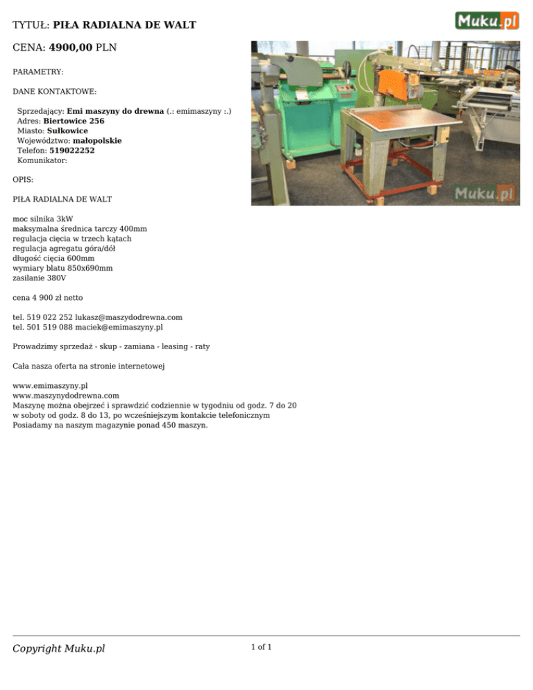 TYTUŁ: PIŁA RADIALNA DE WALT CENA: 4900,00 PLN PARAMETRY: DANE KONTAKTOWE: Sprzedający: Emi maszyny do drewna (.: emimaszyny :.) Adres: Biertowice 256 Miasto: Sułkowice Województwo: małopolskie Telefon: 519022252 Komunikator: OPIS: PIŁA RADIALNA DE WALT moc silnika 3kW maksymalna średnica tarczy 400mm regulacja cięcia w trzech kątach regulacja agregatu góra/dół długość cięcia 600mm wymiary blatu 850x690mm zasilanie 380V cena 4 900 zł netto tel. 519 022 252 [email protected] tel. 501 519 088 [email protected] Prowadzimy sprzedaż - skup - zamiana - leasing - raty Cała nasza oferta na stronie internetowej www.emimaszyny.pl www.maszynydodrewna.com Maszynę można obejrzeć i sprawdzić codziennie w tygodniu od godz. 7 do 20 w soboty od godz. 8 do 13, po wcześniejszym kontakcie telefonicznym Posiadamy na naszym magazynie ponad 450 maszyn. Copyright Muku.pl 1 of 1