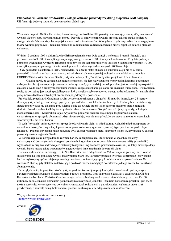 Ekoportal.eu - ochrona środowiska ekologia ochrona przyrody recykling biopaliwa GMO odpady UE finansuje budowę statku do usuwania plam oleju i ropy W ramach projektu Oil Sea Harvester, finansowanego ze środków UE, powstaje innowacyjny statek, który ma usuwać wycieki olejów i ropy na wzburzonym morzu. Decyzję w sprawie opracowania projektu takiego statku podjęto w następstwie dwóch poważnych europejskich katastrof zbiornikowców. W obydwóch tych przypadkach - ze względu na trudne warunki pogodowe - działania mające na celu usunięcie zanieczyszczeń nie mogły zapobiec dotarciu plam do wybrzeża. W dniu 12 grudnia 1999 r. zbiornikowiec Erika przełamał się na dwie części u wybrzeży Bretanii (Francja), gdy przewoził około 30 000 ton ciężkiego oleju napędowego. Około 13 000 ton wyciekło do morza. Trzy lata później u północno-wschodnich wybrzeży Hiszpanii podobny los spotkał zbiornikowiec Prestige z ładunkiem w postaci 70 000 ton ciężkiego oleju opałowego. Zanim statek poszedł na dno, wyciekło z niego do 4000 ton oleju. - Gdy patrzyłem na katastrofę Eriki, zobaczyłem, że obecne statki służące do usuwania oleju nie są w stanie prowadzić działań na wzburzonym morzu, ani też zbierać oleju o wysokiej lepkości - powiedział w rozmowie z CORDIS Wiadomości Christian Gaudin, inżynier budowy okrętów i koordynator projektu Oil Sea Harvester. Gaudin mówi, że czekanie, aż morze się uspokoi, nie jest rozwiązaniem w przypadku katastrof podobnego rodzaju - im dłużej trwa operacja usuwania zanieczyszczeń, tym bardziej prawdopodobne jest to, że olej się rozpuści i zmiesza z wodą oraz z drobnymi cząstkami wskutek czego odzyskanie go stanie się znacznie trudniejsze. - Pomyślałem sobie, że potrzebny jest statek specjalistyczny, który mógłby szybko reagować na tego rodzaju katastrofy i natychmiast podejmować działania w trudnych warunkach pogodowych - powiedział. Projekt, jaki przedstawił Gaudin ze swoim zespołem, to trimaran o długości 138 metrów i szerokości 38 metrów, składający się z dużego centralnego pojedynczego kadłuba i dwóch kadłubów bocznych. Kadłuby boczne stabilizują statek umożliwiając mu działanie przy wietrze o sile dziewięciu stopni (silny sztorm) oraz przy stanie morza do siedmiu. Ponadto te dwa kadłuby tworzą również dwa ośmiometrowe "koryta" ze spokojniejszą wodą, w których można zbierać olej. - Konstrukcja ta jest wyjątkowa, ponieważ niektóre kraje mogą dysponować statkami wyposażonymi w sprzęt do zbierania i odzyskiwania oleju, lecz nie mają środków do pracy na morzu w warunkach sztormowych - twierdzi Gaudin. W tych "korytach" umieszczony jest sprzęt do odzyskiwania oleju, w skład którego wchodzi układ transportera ze szczotkami do olejów o wysokiej lepkości oraz powierzchniowy zgarniacz (skimer) typu przelewowego do oleju lekkiego. - Podczas gdy taśma może odzyskać 99% całości rozlanego oleju, zgarniacz jest po to, aby usunąć w całości pozostałą resztę - wyjaśnia Gaudin. W konstrukcji statku uwzględniono również bariery zabezpieczające, które można w sposób niezależny wykorzystywać do zwiększenia dostępnej powierzchni zgarniania, oraz dwa zdalnie sterowane skiffy (małe łódki) wyposażone w czujniki wykrywające materiały toksyczne i wybuchowe, pozwalające określić, jak lotny może być dany wyciek. Statek można także wyposażyć w nagrzewnice i inne urządzenia do obróbki oleju. Badania wykonalności wskazują, że Oil Sea Harvester może odzyskiwać do 250 ton oleju na godzinę i że zdolność składowania na jego pokładzie wynosi maksymalnie 6000 ton. Partnerzy projektu twierdzą, że trimaran jest w stanie bardzo szybko przybyć na miejsce powstałego rozlewu, ponieważ jego prędkość ekonomiczną określa się na 20 węzłów. Z chwilą, gdy statek tam dotrze, jego prędkość można zmniejszyć do zaledwie jednego węzła, by umożliwić zbieranie oleju. Ze względu na to, że projektu zakończy się w grudniu, konsorcjum projektu będzie poszukiwało potencjalnych partnerów zainteresowanych sfinansowaniem budowy prototypu. Lecz za przyszłe korzyści z użytkowania Oil Sea Harvester trzeba płacić. Christian Gaudin szacuje, że koszt budowy statku może mieścić się w przedziale 50-100 milionów euro. Jednakże elementem podnoszącym atrakcyjność jednostki - zdaniem konsorcjum projektu - jest to, że można ją również wykorzystywać do wykonywania zadań związanych z patrolowaniem wybrzeża przez straż przybrzeżną, z kontrolą celną, holowaniem, pracami naukowymi czy odzyskiwaniem kontenerów. Więcej informacji na stronie internetowej: http://www.osh-project.org/ Źródło: strona 1 / 2 Ekoportal.eu - ochrona środowiska ekologia ochrona przyrody recykling biopaliwa GMO odpady UE finansuje budowę statku do usuwania plam oleju i ropy Copyright ©European Communities, 2007 Neither the Office for Official Publications of the European Communities, nor any person acting on its behalf, is responsible for the use, which might be made of the attached information. The attached information is drawn from the Community R&D Information Service (CORDIS). The CORDIS services are carried on the CORDIS Host in Luxembourg – http://cordis.europa.eu.int. Access to CORDIS is currently available free-of-charge. Chronione prawem autorskim ©Wspólnota Europejska, 2007 Urząd Publikacji Wspólnoty Europejskiej, ani jakakolwiek osoba działająca w jego imieniu, nie może być odpowiedzialna za użycie i skutki wykorzystania powyższej informacji. Powyższa informacja pochodzi z Wspólnotowego Serwisu Informacyjnego Badań i Rozwoju - CORDIS. Serwis CORDIS mieści się na serwerach w Luxemburgu i jest dostępny pod adresem http://cordis.europa.eu.int Dostęp do serwisu CORDIS jest obecnie darmowy. strona 2 / 2