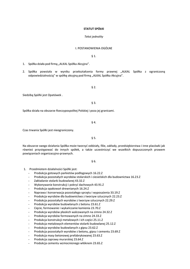 STATUT SPÓŁKI Tekst jednolity I. POSTANOWIENIA OGÓLNE § 1. 1. Spółka działa pod firmą „ALKAL Spółka Akcyjna”. 2. Spółka powstała w wyniku przekształcenia formy prawnej „ALKAL odpowiedzialnością” w spółkę akcyjną pod firmą „ALKAL Spółka Akcyjna”. Spółka z ograniczoną § 2. Siedzibą Spółki jest Opatówek . § 3. Spółka działa na obszarze Rzeczypospolitej Polskiej i poza jej granicami. § 4. Czas trwania Spółki jest nieograniczony. § 5. Na obszarze swego działania Spółka może tworzyd oddziały, filie, zakłady, przedsiębiorstwa i inne placówki jak również przystępowad do innych spółek, a także uczestniczyd we wszelkich dopuszczonych prawem powiązaniach organizacyjno-prawnych. § 6. 1. - Przedmiotem działalności Spółki jest: Produkcja gotowych parkietów podłogowych 16.22.Z Produkcja pozostałych wyrobów stolarskich i ciesielskich dla budownictwa 16.23.Z Zakładanie stolarki budowlanej 43.32.Z Wykonywanie konstrukcji i pokryd dachowych 43.91.Z Produkcja opakowao drewnianych 16.24.Z Naprawa i konserwacja pozostałego sprzętu i wyposażenia 33.19.Z Produkcja wyrobów dla budownictwa z tworzyw sztucznych 22.23.Z Produkcja pozostałych wyrobów z tworzyw sztucznych 22.29.Z Produkcja wyrobów budowlanych z betonu 23.61.Z Cięcie, formowanie i wykaoczanie kamienia 23.70.Z Produkcja wyrobów płaskich walcowanych na zimno 24.32.Z Produkcja wyrobów formowanych na zimno 24.33.Z Produkcja konstrukcji metalowych i ich części 25.11.Z Produkcja metalowych elementów stolarki budowlanej 25.12.Z Produkcja wyrobów budowlanych z gipsu 23.62.Z Produkcja pozostałych wyrobów z betonu, gipsu i cementu 23.69.Z Produkcja masy betonowej prefabrykowanej 23.63.Z Produkcja zaprawy murarskiej 23.64.Z Produkcja cementu wzmocnionego włóknem 23.65.Z - Kucie, prasowanie, wytłaczanie i walcowanie metali; metalurgia proszków 25.50.Z Obróbka metali i nakładanie powłok na metale 25.61.Z Obróbka mechaniczna elementów metalowych 25.62.Z Produkcja narzędzi 25.73.Z Produkcja pozostałych gotowych wyrobów metalowych, gdzie indziej niesklasyfikowana 25.99.Z Wykonywanie konstrukcji i pokryd dachowych 43.91.Z Pozostałe specjalistyczne roboty budowlane, gdzie indziej niesklasyfikowane 43.99.Z Wykonywanie instalacji elektrycznych 43.21.Z Wykonywanie pozostałych instalacji budowlanych 43.29.Z Zakładanie stolarki budowlanej 43.32.Z Roboty związane z budową dróg i autostrad 42.11.Z Roboty związane z budową dróg szynowych i kolei podziemnej 42.12.Z Roboty związane z budową obiektów inżynierii wodnej 42.91.Z Wykonywanie instalacji wodno-kanalizacyjnych, cieplnych, gazowych i klimatyzacyjnych 43.22.Z Wykonywanie pozostałych instalacji budowlanych 43.29.Z Malowanie i szklenie 43.34.Z Tynkowanie 43.31.Z Posadzkarstwo; tapetowanie i oblicowywanie ścian 43.33.Z Roboty budowlane związane ze wznoszeniem budynków mieszkalnych i niemieszkalnych 41.20.Z Wykonywanie pozostałych robót budowlanych wykooczeniowych 43.39.Z Badania naukowe i prace rozwojowe w dziedzinie pozostałych nauk przyrodniczych i technicznych 72.19.Z Sprzedaż hurtowa metali i rud metali 46.72.Z Sprzedaż hurtowa wyrobów metalowych oraz sprzętu i dodatkowego wyposażenia -hydraulicznego i grzejnego 46.74.Z Sprzedaż hurtowa wyrobów chemicznych 46.75.Z Sprzedaż hurtowa pozostałych półproduktów 46.76.Z Sprzedaż hurtowa maszyn wykorzystywanych w górnictwie, budownictwie oraz inżynierii lądowej i wodnej 46.63.Z Sprzedaż hurtowa drewna, materiałów budowlanych i wyposażenia sanitarnego 46.73.Z Sprzedaż detaliczna drobnych wyrobów metalowych, farb i szkła prowadzona w wyspecjalizowanych sklepach 47.52.Z Przeładunek towarów w pozostałych punktach przeładunkowych 52.24.C Magazynowanie i przechowywanie pozostałych towarów 52.10.B Działalnośd agencji reklamowych 73.11.Z Pośrednictwo w sprzedaży czasu i miejsca na cele reklamowe w radio i telewizji 73.12.A Pośrednictwo w sprzedaży miejsca na cele reklamowe w mediach drukowanych 73.12.B Pośrednictwo w sprzedaży czasu i miejsca na cele reklamowe w mediach elektronicznych (Internet) 73.12.C Pośrednictwo w sprzedaży czasu i miejsca na cele reklamowe w pozostałych mediach 73.12.D Niespecjalistyczne sprzątanie budynków i obiektów przemysłowych 81.21.Z Specjalistyczne sprzątanie budynków i obiektów przemysłowych 81.22.Z Pozostałe doradztwo w zakresie prowadzenia działalności gospodarczej i zarządzania 70.22.Z Pozostałe sprzątanie 81.29.Z Działalnośd związana z oprogramowaniem 62.01.Z Przetwarzanie danych; zarządzanie stronami internetowymi (hosting) i podobna działalnośd 63.11.Z Działalnośd portali internetowych 63.12.Z Działalnośd związana z zarządzaniem urządzeniami informatycznymi 62.03.Z Produkcja artykułów piśmiennych 17.23.Z Pozostałe drukowanie 18.12.Z Pozostała działalnośd wydawnicza 58.19.Z Działalnośd usługowa związana z przygotowywaniem do druku 18.13.Z Reprodukcja zapisanych nośników informacji 18.20.Z Transport drogowy towarów 49.41.Z Działalnośd usługowa wspomagająca transport lądowy 52.21.Z Stosunki międzyludzkie (public relations) i komunikacja 70.21.Z Działalnośd firm centralnych (head offices) i holdingów, z wyłączeniem holdingów -finansowych 70.10.Z - Pozostała finansowa działalnośd usługowa, gdzie indziej niesklasyfikowana, z wyłączeniem ubezpieczeo i funduszów emerytalnych 64.99.Z - Działalnośd w zakresie architektury 71.11.Z - Działalnośd w zakresie inżynierii i związane z nią doradztwo techniczne 71.12.Z - Działalnośd holdingów finansowych 64.20.Z - Pozostała działalnośd usługowa w zakresie technologii informatycznych i komputerowych 62.09.Z - Rozbiórka i burzenie obiektów budowlanych 43.11.Z - Przygotowanie terenu pod budowę 43.12.Z - Wykonywanie wykopów i wierceo geologiczno-inżynierskich 43.13.Z - Działalnośd agentów zajmujących się sprzedażą drewna i materiałów budowlanych 46.13.Z - Działalnośd zwią