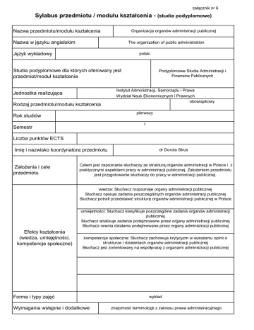 załącznik nr 6 Sylabus przedmiotu / modułu kształcenia - (studia podyplomowe) Nazwa przedmiotu/modułu kształcenia Organizacja organów administracji publicznej Nazwa w języku angielskim The organization of public administration Język wykładowy polski Studia podyplomowe dla których oferowany jest przedmiot/moduł kształcenia Jednostka realizująca Rodzaj przedmiotu/modułu kształcenia Podyplomowe Studia Administracji i Finansów Publicznych Instytut Administracji, Samorządu i Prawa Wydział Nauk Ekonomicznych i Prawnych obowiązkowy pierwszy Rok studiów I Semestr Liczba punktów ECTS Imię i nazwisko koordynatora przedmiotu Założenia i cele przedmiotu dr Dorota Strus Celem jest zapoznanie słuchaczy ze strukturą organów administracji w Polsce i z praktycznymi aspektami pracy w administracji publicznej. Założeniem przedmiotu jest przygotowanie słuchaczy do pracy w administracji publicznej. wiedza: Słuchacz rozpoznaje organy administracji publicznej Słuchacz opisuje zadania poszczególnych organów administracji publicznej Słuchacz potrafi przedstawić strukturę organów administracji publicznej w Polsce umiejetności: Słuchacz klasyfikuje poszczególne zadania organów administracji publicznej Słuchacz analizuje zadania podejmowane przez organy administracji publicznej Słuchacz ocenia działania podejmowane przez organy administracji publicznej Efekty kształcenia (wiedza, umiejętności, kompetencje społeczne) kompetencje społeczne: Słuchacz zachowuje krytycyzm w wyrażaniu opinii o strukturze i działaniach organów administracji publicznej Słuchacz jest zorientowany na współpracę z organami administracji publicznej Forma i typy zajęć Wymagania wstępne i dodatkowe wykład znajomość terminologii z zakresu prawa administracyjnego 1. Pojęcie organu administracji publicznej (ujęcie podmiotowe i przedmiotowe; wprowadzenie do prawa administracyjnego) 2. Prawo ustrojowe (zasady: centralizacji i decentralizacji, koncentracji i dekoncentracji; celowość i zasadność podziału organów administracji publicznej; istota samorządu i typologia jego form). Treści modułu kształcenia 3. Podział organów administracji publicznej (pojęcie i typologia organów administracji publicznej; administracja rządowa zespolona i niezespolona; organy centralne i terenowe). 4. Prawne formy aktywności administracji publicznej (forma i metoda działania; klasyfikacja prawnych form działania; rodzaje i istota czynności prawnych podejmowanych przez administrację w sferach zewnętrznej i wewnętrznej). Literatura podstawowa/dodatkowa 1. Zofia Duniewska, Barbara Jaworska-Dębska, Ryszarda MichalskaBadziak, Ewa Olejniczak-Szałowska, Małgorzata Stahl, Prawo administracyjne - pojęcia, instytucje, zasady w teorii i orzecznictwie, Łódź 2009. 2. M. Kulesza, H. Izdebski, Administracja publiczna. Zagadnienia ogólne, Liber 2004. 3. M. Matczak, Kompetencja organu administracji publicznej, Zakamycze 2009. Planowane formy/działania/metody dydaktyczne Wykład prowadzony w oparciu o multimedialną prezentację Sposoby weryfikacji określonych efektów kształcenia osiaganych przez studenta Forma i sposób zaliczenia (wraz z kryteriami oceniania) Bilans punktów ECTS Egzamin ustny. Weryfikacja wiedzy, umiejętności i kompetencji społecznych następuje na egzaminie Sposób oceniania: znajomość struktury organów administracji publicznej w Polsce-3,0, Znajomość różnorodnych kryteriów, pozwalajacych na wyodrębnienie organów administracji publicznej i umiejętność przyporządkowania im zadań -4,0, Kompleksowa znajomość istniejącej w Polsce struktury organów administracji publicznej powiązana z kompetencyjnością i oceną istniejącego modelu-5,0