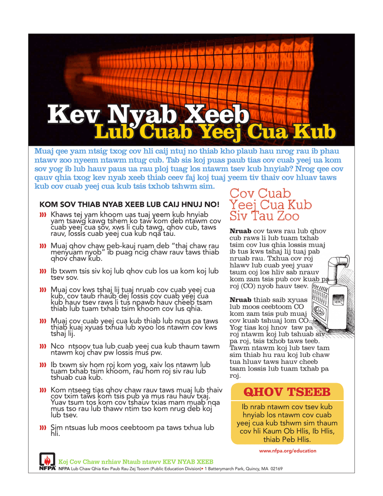 Kev Nyab Xeeb Lub Cuab Yeej Cua Kub Muaj qee yam ntsig txog cov hli caij ntuj no thiab kho plaub hau nrog rau ib phau ntawv zoo nyeem ntawm ntug cub. Tab sis koj puas paub tias cov cuab yeej ua kom sov yog ib lub hauv paus ua rau ploj tuag los ntawm tsev kub hnyiab? Nrog qee cov qauv qhia txog kev nyab xeeb thiab ceev faj koj tuaj yeem tiv thaiv cov hluav taws kub cov cuab yeej cua kub tsis txhob tshwm sim. KOM SOV THIAB NYAB XEEB LUB CAIJ HNUJ NO! KKK Khaws tej yam khoom uas tuaj yeem kub hnyiab yam tsawg kawg tshem ko taw kom deb ntawm cov cuab yeej cua sov, xws li cub tawg, qhov cub, taws rauv, lossis cuab yeej cua kub nqa tau. KKK Muaj qhov chaw peb-kauj ruam deb “thaj chaw rau menyuam nyob” ib puag ncig chaw rauv taws thiab qhov chaw kub. KKK Ib txwm tsis siv koj lub qhov cub los ua kom koj lub tsev sov. KKK Muaj cov kws tshaj lij tuaj nruab cov cuab yeej cua kub, cov taub rhaub dej lossis cov cuab yeej cua kub hauv tsev raws li tus npawb hauv cheeb tsam thiab lub tuam txhab tsim khoom cov lus qhia. KKK Muaj cov cuab yeej cua kub thiab lub nqus pa taws thiab kuaj xyuas txhua lub xyoo los ntawm cov kws tshaj lij. KKK Nco ntsoov tua lub cuab yeej cua kub thaum tawm ntawm koj chav pw lossis mus pw. KKK Ib txwm siv hom roj kom yog, xaiv los ntawm lub tuam txhab tsim khoom, rau hom roj siv rau lub tshuab cua kub. KKK Kom ntseeg tias qhov chaw rauv taws muaj lub thaiv cov txim taws kom tsis pub ya mus rau hauv txaj. Yuav tsum tos kom cov tshauv txias mam muab nqa mus tso rau lub thawv ntim tso kom nrug deb koj lub tsev. KKK Sim ntsuas lub moos ceebtoom pa taws txhua lub hli. Cov Cuab Yeej Cua Kub Siv Tau Zoo Nruab cov taws rau lub qhov cub raws li lub tuam txhab tsim cov lus qhia lossis muaj ib tus kws tshaj lij tuaj pab nruab rau. Txhua cov roj hlawv lub cuab yeej yuav tsum coj los hliv sab nrauv kom zam tsis pub cov kuab pa roj (CO) nyob hauv tsev. Nruab thiab saib xyuas lub moos ceebtoom CO kom zam tsis pub muaj cov kuab tshuaj lom CO. Yog tias koj hnov tsw pa roj ntawm koj lub tshuab siv pa roj, tsis txhob taws teeb. Tawm ntawm koj lub tsev tam sim thiab hu rau koj lub chaw tua hluav taws hauv cheeb tsam lossis lub tuam txhab pa roj. QHOV TSEEB Ib nrab ntawm cov tsev kub hnyiab los ntawm cov cuab yeej cua kub tshwm sim thaum cov hli Kaum Ob Hlis, Ib Hlis, thiab Peb Hlis. www.nfpa.org/education Koj Cov Chaw nrhiav Ntaub ntawv KEV NYAB XEEB NFPA Lub Chaw Qhia Kev Paub Rau Zej Tsoom (Public Education Division)• 1 Batterymarch Park, Quincy, MA 02169
