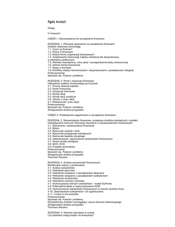 Spis treści Wstęp O Autorach CZĘŚĆ I. Wprowadzenie do zarządzania finansami ROZDZIAŁ 1. Pierwsze spojrzenie na zarządzanie finansami Znaleźć właściwą równowagę 1.1. Czym są finanse? 1.2. Praca w finansach 1.3. Różne formy organizacji biznesowych 1.4. Znajdowanie równowagi między wartością dla akcjonariuszy a interesem społecznym 1.5. Wartość wewnętrzna, ceny akcji i wynagrodzenia kadry kierowniczej 1.6. Istotne trendy biznesowe 1.7. Etyka w biznesie 1.8. Konflikty między kierownictwem, akcjonariuszami i posiadaczami obligacji Podsumowanie Sprawdź się. Pytania i problemy ROZDZIAŁ 2. Rynki i instytucje finansowe Odbudowa systemu finansowego po kryzysie 2.1. Proces alokacji kapitału 2.2. Rynki finansowe 2.3. Instytucje finansowe 2.4. Rynek akcji 2.5. Rynek akcji zwykłych 2.6. Zwroty z rynku akcji 2.7. Efektywność rynku akcji Podsumowanie Sprawdź się. Pytania i problemy Zintegrowana analiza przypadku CZĘŚĆ II. Podstawowe zagadnienia w zarządzaniu finansami ROZDZIAŁ 3. Sprawozdania finansowe, przepływy środków pieniężnych i podatki Odnajdywanie cennych informacji zawartych w sprawozdaniach finansowych 3.1. Dokumenty i sprawozdania finansowe 3.2. Bilans 3.3. Rachunek zysków i strat 3.4. Rachunek przepływów pieniężnych 3.5. Rachunek kapitału akcyjnego 3.6. Zastosowania i ograniczenia sprawozdań finansowych 3.7. Wolne środki pieniężne 3.8. MVA i EVA 3.9. Podatek dochodowy Podsumowanie Sprawdź się. Pytania i problemy Zintegrowana analiza przypadku Thomson Reuters ROZDZIAŁ 4. Analiza sprawozdań finansowych Blockbuster walczy o przetrwanie 4.1. Analiza wskaźników 4.2. Wskaźniki płynności 4.3. Wskaźniki związane z zarządzaniem aktywami 4.4. Wskaźniki związane z zarządzaniem zadłużeniem 4.5. Wskaźniki rentowności 4.6. Wskaźniki wartości rynkowej 4.7. Wykorzystanie różnych wskaźników - model DuPonta 4.8. Potencjalne błędy w wykorzystywaniu ROE 4.9. Wykorzystanie wskaźników finansowych w ocenie wyników firmy 4.10. Zastosowania wskaźników i ich ograniczenia 4.11. Liczby to nie wszystko Podsumowanie Sprawdź się. Pytania i problemy Kompleksowy problem wymagający użycia arkusza kalkulacyjnego Zintegrowana analiza przypadku Thomson Reuters ROZDZIAŁ 5. Wartość pieniądza w czasie Czy będziesz mógł przejść na emeryturę? 5.1. Osie czasu 5.2. Wartość przyszła 5.3. Wartość bieżąca 5.4. Obliczanie stopy procentowej (/) 5.5. Obliczanie liczby lat (N) 5.6. Płatności okresowe 5.7. Wartość przyszła płatności okresowej zwykłej 5.8. Wartość przyszła płatności okresowej z góry 5.9. Wartość bieżąca płatności okresowej zwykłej 5.10. Ustalanie wartości płatności, okresów i stóp procentowych w przypadku płatności okresowych 5.11. Płatności dożywotnie 5.12. Nierówne przepływy pieniężne 5.13. Wartość przyszła strumienia nierównych przepływów pieniężnych 5.14. Wyznaczanie /w przypadku strumieni nierównych przepływów pieniężnych 5.15. Półroczne i inne okresy naliczania 5.16. Porównanie stóp procentowych 5.17. Okresy ułamkowe 5.18. Pożyczki zamortyzowane Podsumowanie Sprawdź się. Pytania i problemy Kompleksowy problem wymagający użycia arkusza kalkulacyjnego Zintegrowana analiza przypadku CZĘŚĆ III. Aktywa finansowe ROZDZIAŁ 6. Stopy procentowe Stopy procentowe pozostają na niskim poziomie, ponieważ gospodarka dopiero podnosi się z recesji i kryzysu finansowego 6.1. Koszt pieniądza 6.2. Poziomy stóp procentowych 6.3. Czynniki determinujące poziom rynkowych stóp procentowych 6.4. Struktura terminowa stóp procentowych 6.5. Czynniki determinujące przebieg krzywej rentowności 6.6. Szacowanie przyszłych stóp zwrotu na podstawie krzywej rentowności 6.7. Czynniki makroekonomiczne kształtujące poziom stóp procentowych 6.8. Stopy procentowe a decyzje biznesowe Podsumowanie Sprawdź się. Pytania i problemy Kompleksowy problem wymagający użycia arkusza kalkulacyjnego Zintegrowana analiza przypadku ROZDZIAŁ 7. Obligacje i ich wycena Analiza ryzyka na rynku obligacji 7.1. Kto emituje obligacje? 7.2. Najważniejsze cechy obligacji 7.3. Wycena obligacji 7.4. Rentowność obligacji 7.5. Zmiany wartości obligacji w czasie 7.6. Obligacje z kuponem półrocznym 7.7. Ocena ryzyka obligacji 7.8. Ryzyko niewypłacalności 7.9. Rynki obligacji Podsumowanie Sprawdź się. Pytania i problemy Kompleksowy problem wymagający użycia arkusza kalkulacyjnego Zintegrowana analiza przypadku ROZDZIAŁ 8. Ryzyko i stopy zwrotu Zarządzanie ryzykiem w trudnych czasach 8.1. Zależność między ryzykiem a zwrotem 8.2. Ryzyko autonomiczne 8.3. Ryzyko w ujęciu portfelowym - model CAPM 8.4. Zależność między ryzykiem a stopą zwrotu 8.5. Kilka wątpliwości związanych ze współczynnikiem beta i modelem CAPM 8.6. Uwagi końcowe - implikacje dla przedstawicieli kierownictwa firm i inwestorów Podsumowanie Sprawdź się. Pytania i problemy Kompleksowy problem wymagający użycia arkusza kalkulacyjnego Zintegrowana analiza przypadku Thomson Reuters ROZDZIAŁ 9. Akcje i ich wycena W poszukiwaniu odpowiedniej spółki 9.1. Prawa przysługujące posiadaczowi akcji zwykłych 9.2. Rodzaje akcji zwykłych 9.3. Cena akcji a wartość wewnętrzna 9.4. Model zdyskontowanej dywidendy 9.5. Akcje stałego wzrostu 9.6. Wycena akcji o niestałym wzroście 9.7. Wycena całego przedsiębiorstwa 9.8. Akcje uprzywilejowane Podsumowanie Sprawdź się. Pytania i problemy Kompleksowy problem wymagający użycia arkusza kalkulacyjnego Zintegrowana analiza przypadku Thomson Reuters Dodatek 9A. Równowaga na rynku akcji CZĘŚĆ IV. Inwestowanie w aktywa długoterminowe - planowanie nakładów kapitałowych ROZDZIAŁ 10. Koszt kapitału Generowanie wartości w Disneyu 10.1. Średni ważony koszt kapitału (WACC) - informacje ogólne 10.2. Podstawowe definicje 10.3. Koszt zadłużenia, rd(1- T) 10.4. Koszt akcji uprzywilejowanych, rp 10.5. Koszt zysków zatrzymanych, r$ 10.6. Koszt nowych akcji zwykły