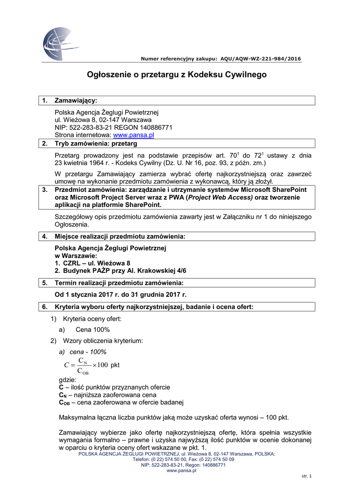 Numer referencyjny zakupu: AQU/AQW-WZ-221-984/2016 Ogłoszenie o przetargu z Kodeksu Cywilnego 1. Zamawiający: 2. Polska Agencja Żeglugi Powietrznej ul. Wieżowa 8, 02-147 Warszawa NIP: 522-283-83-21 REGON 140886771 Strona internetowa: www.pansa.pl Tryb zamówienia: przetarg Przetarg prowadzony jest na podstawie przepisów art. 701 do 721 ustawy z dnia 23 kwietnia 1964 r. - Kodeks Cywilny (Dz. U. Nr 16, poz. 93, z późn. zm.) 3. W przetargu Zamawiający zamierza wybrać ofertę najkorzystniejszą oraz zawrzeć umowę na wykonanie przedmiotu zamówienia z wykonawcą, który ją złożył. Przedmiot zamówienia: zarządzanie i utrzymanie systemów Microsoft SharePoint oraz Microsoft Project Server wraz z PWA (Project Web Access) oraz tworzenie aplikacji na platformie SharePoint. Szczegółowy opis przedmiotu zamówienia zawarty jest w Załączniku nr 1 do niniejszego Ogłoszenia. 4. Miejsce realizacji przedmiotu zamówienia: Polska Agencja Żeglugi Powietrznej w Warszawie: 1. CZRL – ul. Wieżowa 8 2. Budynek PAŻP przy Al. Krakowskiej 4/6 5. Termin realizacji przedmiotu zamówienia: Od 1 stycznia 2017 r. do 31 grudnia 2017 r. 6. Kryteria wyboru oferty najkorzystniejszej, badanie i ocena ofert: 1) Kryteria oceny ofert: a) 2) Cena 100% Wzory obliczenia kryterium: a) cena - 100% C CN 100 pkt C OB gdzie: C – ilość punktów przyznanych ofercie CN – najniższa zaoferowana cena COB – cena zaoferowana w ofercie badanej Maksymalna łączna liczba punktów jaką może uzyskać oferta wynosi – 100 pkt. Zamawiający wybierze jako ofertę najkorzystniejszą ofertę, która spełnia wszystkie wymagania formalno – prawne i uzyska najwyższą ilość punktów w ocenie dokonanej w oparciu o kryteria oceny ofert wskazane w pkt. 1. POLSKA AGENCJA ŻEGLUGI POWIETRZNEJ, ul. Wieżowa 8, 02-147 Warszawa, POLSKA; Telefon: (0 22) 574 50 00, Fax: (0 22) 574 50 09 NIP: 522-283-83-21, Regon: 140886771 www.pansa.pl str. 1 Numer referencyjny zakupu: AQU/AQW-WZ-221-984/2016 3) Zamawiający odrzuca ofertę jeżeli oferta została złożona po wyznaczonym terminie lub/i w niewłaściwym miejscu. 4) Zamawiający może odrzucić ofertę, jeżeli: a) jest niezgodna z wymaganiami niniejszego przetargu, b) będzie niekompletna lub nie będzie zawierała wszystkich wymaganych przez Zamawiającego dokumentów lub oświadczeń, Zamawiający może wezwać wykonawcę, którego oferta jest najkorzystniejsza i który w terminie nie złożył wymaganych niniejszym ogłoszeniem oświadczeń lub dokumentów lub który nie złożył pełnomocnictw, albo który złożył wymagane oświadczenia i dokumenty zawierające błędy lub który złożył wadliwe pełnomocnictwa, do ich złożenia w wyznaczonym terminie, chyba że mimo ich złożenia oferta wykonawcy podlega odrzuceniu albo konieczne byłoby unieważnienie przetargu lub jego odwołania albo jego zamknięcia bez dokonania wyboru oferty. Termin związania ofertą: 5) 7. 1) Wykonawca związany jest ofertą przez okres nie krótszy niż 30 dni licząc od dnia, w którym upływa termin składania ofert. 2) Wykonawca samodzielnie lub na wniosek Zamawiającego może przedłużyć termin związania ofertą. Opis sposobu przygotowania oferty: 8. 1) Oferta musi być sporządzona w języku polskim. 2) Zamawiający nie dopuszcza składania ofert częściowych lub wariantowych. 3) Oferta musi być złożona w formie pisemnej lub elektronicznej. W przypadku złożenia oferty w formie elektronicznej Wykonawca, którego oferta zostanie wybrana jako najkorzystniejsza, zobowiązany będzie do przedłożenia Zamawiającemu oferty w formie pisemnej w terminie 7 dni od daty powiadomienia o wyborze jego oferty. 4) Oferta musi być podpisana przez osoby upoważnione do reprezentowania wykonawcy. 5) 9. Oferta musi odpowiadać wymogom formalnym wskazanym w ogłoszeniu o przetargu. Termin oraz miejsce składania i otwarcia ofert: 1) Ofertę należy złożyć w formie pisemnej lub elektronicznej do dnia 9 grudnia 2016 r. do godz. 12.00. 2) Ofertę pisemną należy złożyć w Budynku Polskiej Agencji Żeglugi Powietrznej, ul. Gałczyńskiego 2 a - Kancelaria. Z dopiskiem: Oferta na usługę utrzymania i rozwoju MS SharePoint 2013 oraz MS Project. 3) Za datę złożenia oferty pisemnej uważa się datę wpływu oferty do Zamawiającego potwierdzoną przez pracownika Zamawiającego. 4) Ofertę przesłaną elektronicznie należy przesłać na adres e-mail: [email protected]. Za datę złożenia oferty przesłanej elektronicznie uważa się moment wpływu e-mail z ofertą do sieci informatycznej Zamawiającego. 5) Zamawiający dopuszcza wydłużenie terminu składania ofert. Informacja w powyższym zakresie zostanie niezwłocznie opublikowana w miejscu publikacji ogłoszenia o przetargu. POLSKA AGENCJA ŻEGLUGI POWIETRZNEJ, ul. Wieżowa 8, 02-147 Warszawa, POLSKA; Telefon: (0 22) 574 50 00, Fax: (0 22) 574 50 09 NIP: 522-283-83-21, Regon: 140886771 www.pansa.pl str. 2 Numer referencyjny zakupu: AQU/AQW-WZ-221-984/2016 10. Wymagania wobec Wykonawców 1. Wymagania wobec administratora: 1.1. Dobra znajomość systemów operacyjnych firmy Microsoft; 1.2. Dobra znajomość instalacji i konfiguracji systemów Microsoft Project Serwer 2013 w tym Project Web Serwer, baz danych, a w szczególności Microsoft SQL DataBase, Microsoft SharePoint 2013 i 2016; 1.3. Przynajmniej 2 letnie doświadczenie w administracji i konfiguracji systemów Microsoft Project Serwer i Microsoft SharePoint Serwer; 1.4. Potwierdzone referencjami z okresu nie więcej jak 2 lat liczonego od daty publikacji ogłoszenia co najmniej 2 usługi wykonane lub wykonywane w zakresie administrowania, utrzymania i rozwoju systemów Microsoft Project Serwer i Microsoft SharePoint Serwer; 1.5. Posiadanie Certyfikatów Microsoft Certified Solutions Expert: SharePoint; 2. Wymagania wobec programisty: 2.1. Dobra znajomość systemów operacyjnych firmy Microsoft; 2.2. Certyfikat Microsoft Certified Solutions Developer: SharePoint Applications 2