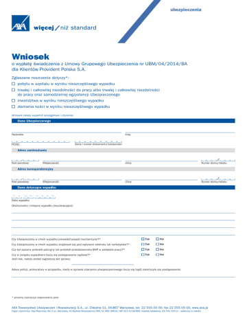 ubezpieczenia Wniosek o wypłatę świadczenia z Umowy Grupowego Ubezpieczenia nr UBM/04/2014/BA dla Klientów Provident Polska S.A. Zgłaszane roszczenie dotyczy*: pobytu w szpitalu w wyniku nieszczęśliwego wypadku trwałej i całkowitej niezdolności do pracy albo trwałej i całkowitej niezdolności do pracy oraz samodzielnej egzystencji Ubezpieczonego inwalidztwa w wyniku nieszczęśliwego wypadku złamania kości w wyniku nieszczęśliwego wypadku Wniosek należy wypełnić szczegółowo i czytelnie. Dane Ubezpieczonego Nazwisko Imię Seria i numer dokumentu tożsamości PESEL Adres zamieszkania Kod pocztowy Miejscowość Ulica Numer domu/lokalu Ulica Numer domu/lokalu Adres korespondencyjny Kod pocztowy Miejscowość Dane dotyczące wypadku D D M M R R R R Data wypadku Okoliczności i miejsce wypadku (wyczerpująco): Czy Ubezpieczony w chwili wypadku prowadził pojazd mechaniczny?* Tak Nie Czy Ubezpieczony w chwili wypadku znajdował się pod wpływem alkoholu lub narkotyków?* Tak Nie Czy był spisany protokół policyjny lub protokół przedstawiciela BHP w zakładzie pracy?* Tak Nie Czy w związku wypadkiem toczy się postępowanie sądowe?* Tak Nie Jeśli tak, należy podać sygnaturę akt sprawy: Adres policji, prokuratury w przypadku, kiedy w sprawie zdarzenia ubezpieczeniowego toczy się bądź zakończyło się postępowanie: * prosimy zaznaczyć odpowiednie pole AXA Towarzystwo Ubezpieczeń i Reasekuracji S.A., ul. Chłodna 51, 00-867 Warszawa, tel. 22 555 00 00, fax 22 555 05 00, www.axa.pl Organ rejestrowy: Sąd Rejonowy dla m.st. Warszawy, XII Wydział Gospodarczy KRS, Nr KRS 38616; NIP 521-10-36-865; Kapitał zakładowy: 83 341 500 zł – wpłacony w całości Dane dotyczące pobytu w szpitalu Data pobytu w szpitalu: D D M M R R R R od Przyczyna pobytu w szpitalu*: choroba do D D M M R R R R wypadek (wymagane wypełnienie pól powyżej dotyczących miejsca i okoliczności wypadku) Nazwa i adres szpitala, w którym leczył się Ubezpieczony w związku ze zdarzeniem ubezpieczeniowym: Czy zostało zakończone leczenie?* Tak Nie Dane dotyczące trwałej i całkowitej niezdolności do pracy / trwałej i całkowitej niezdolności do pracy oraz samodzielnej egzystencji Nazwa i adres placówki medycznej/szpitala, w którym leczył się Ubezpieczony w związku ze zdarzeniem ubezpieczeniowym: Data wydania pierwszorazowego orzeczenia lekarza orzecznika ZUS lub innego organu rentowego o trwałej i całkowitej niezdolności do pracy albo trwałej i całkowitej niezdolności do pracy oraz samodzielnej egzystencji: D D M M R R R R Dane dotyczące zgłaszającego roszczenie Nazwisko +48 Imię +48 Telefon komórkowy Telefon stacjonarny E-mail Adres korespondencyjny Kod pocztowy Ulica Numer domu/lokalu Miejscowość Ulica Numer domu/lokalu Miejscowość Ulica Numer domu/lokalu Miejscowość Forma wypłaty świadczenia* Przelew bankowy Właściciel rachunku bankowego Numer rachunku bankowego Adres właściciela rachunku bankowego: Kod pocztowy Przekaz pocztowy Adres: Kod pocztowy Oświadczam, że na powyższe pytania odpowiedziałem(am) zgodnie z prawdą. D D M M R R R R Data Miejscowość * prosimy zaznaczyć odpowiednie pole Podpis zgłaszającego roszczenie Dokumenty wymagane do zgłoszenia roszczenia Prosimy o przekazanie do Towarzystwa oryginałów lub kopii następujących dokumentów potwierdzonych za zgodność z oryginałem przez odpowiednio Ubezpieczającego, notariusza, pracownika USC, pracownika Towarzystwa bądź – w przypadku dokumentacji medycznej – pracownika placówki medycznej, z której pochodzi dokumentacja. Prosimy zaznaczyć krzyżykiem załączane do wniosku kopie dokumentów. POBYT W SZPITALU W WYNIKU NIESZCZĘŚLIWEGO WYPADKU Do zgłoszenia należy dołączyć: kopię dokumentacji medycznej, potwierdzającej wystąpienie zdarzenia ubezpieczeniowego, w tym: kartę informacyjną leczenia szpitalnego lub adresy placówek, w których Ubezpieczony był zarejestrowany, leczony w związku z zaistniałym zdarzeniem opis okoliczności zdarzenia, tj. nieszczęśliwego wypadku kopię protokołu opisującego okoliczności zdarzenia (protokołu powypadkowego sporządzonego przez Komisję BHP, notatki urzędowej z policji, protokołu oględzin miejsca zdarzenia w przypadku wypadku komunikacyjnego, informacji o sposobie zakończenia postępowania przygotowawczego – w przypadku gdy zostało wszczęte postępowanie przygotowawcze – lub kopię postanowienia o umorzeniu postępowania) kopię dowodu osobistego lub innego dokumentu tożsamości Ubezpieczonego. Dokumenty sporządzone w języku obcym, przed złożeniem Towarzystwu, powinny zostać przetłumaczone na język polski przez tłumacza przysięgłego. TRWAŁA I CAŁKOWITA NIEZDOLNOŚĆ DO PRACY ALBO TRWAŁA I CAŁKOWITA NIEZDOLNOŚĆ DO PRACY ORAZ SAMODZIELNEJ EGZYSTENCJI Do zgłoszenia należy dołączyć: opis okoliczności zdarzenia kopię dowodu osobistego lub innego dokumentu tożsamości Ubezpieczonego kopię orzeczenia lekarza orzecznika ZUS lub innego organu rentowego, stwierdzającego trwałą i całkowitą niezdolność do pracy kopię dokumentacji medycznej, potwierdzającej wystąpienie zdarzenia ubezpieczeniowego, w tym: kartę informacyjną leczenia szpitalnego lub adresy placówek, w których Ubezpieczony był zarejestrowany, leczony w związku z zaistniałym zdarzeniem kopię protokołu opisującego okoliczności zdarzenia (protokołu powypadkowego sporządzonego przez Komisję BHP, notatki urzędowej z policji, protokołu oględzin miejsca zdarzenia w przypadku wypadku komunikacyjnego, informacji o sposobie zakończenia postępowania przygotowawczego – w przypadku gdy zostało wszczęte postępowanie przygotowawcze – lub kopię postanowienia o umorzeniu postępowania). INWALIDZTWO W WYNIKU NIESZCZĘŚLIWEGO WYPADKU Do zgłoszenia należy dołączyć: opis okoliczności zdarzenia kopię opisu świadczenia pierwszej pomocy lub pomocy doraźnej (pogotowie ratunkowe, szpital) kopię protokołu opis