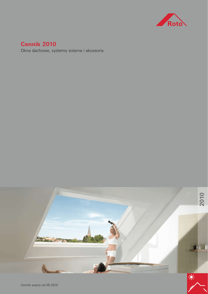 Cennik 2010 2010 Okna dachowe, systemy solarne i akcesoria Cennik ważny od 05.2010 4 Cennik 2009 Nowa generacja okien dachowych Roto: Okna Designo serii R8 i R6 Seria Designo to nowoczesne wzornictwo, nowy kolor zewnętrznego oblachowania antracyt metallic, optymalna integracja z dachem poprzez obniżony montaż, ergonomiczna wielofunkcyjna klamka i seryjnie montowany blok termoizolacyjny WD w standardzie. Okna dostępne są w wersji uchylnoobrotowej R8 i w wersji obrotowej R6, rekomendowanej do zespoleń w trudnodostępnych miejscach, z możliwością ich zdalnej obsługi. Spośród nowej rodziny okien Designo szczególnie wyróżnia się niskoemisyjne okno Designo R8 NE o najniższym na świecie współczynniku Uw=0,84 W/m2K wśród okien uchylno-obrotowych. 8 Katalog 2008 Designo R8 - nowa generacja okien dachowych Designo R8 NE 1 * Niskoemisyjne okno dachowe Roto Designo R8 NE to uchylnoobrotowe okno o zupełnie nowej konstrukcji. Dzięki opatentowanym rozwiązaniom osiągnięto współczynnik przenikalności ciepła dla całego okna Uw=0,84 W/m2K! Tak doskonałe właściwości termoizolacyjne uzyskano m.in. dzięki zastosowaniu niskoemisyjnego, potrójnego pakietu szybowego o współczynniku Ug=0,5 W/m2K. Dodatkowo w standardzie okno wyposażone jest w samoczyszczącą szybę Aquaclear i blok termoizolacyjny WD zamontowany fabrycznie wokół ramy okna. Roto Designo R8 NE - (*) najlepszy na świecie współczynnik przenikalności ciepła Uw=0,84 W/m2K w oknach uchylno-obrotowych z seryjnie montowanym blokiem WD Nowocześnie Unikalne wzornictwo, ergonomiczne kształty, obniżony montaż, optymalna integracja z dachem, nowoczesna kolorystyka Rozmiar Wymiar zewnętrzny w cm Powierzchnia szyby w m2 Okno Designo R8 NE, Współczynnik Współczynnik przenikalności szyby (Ug) przenikalności okna (Uw) 0,84 0,5 5/7 5/9 6/11 6/14 7/9 7/11 7/14 7/16 9/11 9/14 54/78 54/98 65/118 65/140 74/98 74/118 74/140 74/160 94/118 94/140 0,19 0,25 0,42 0,52 0,41 0,51 0,63 0,73 0,70 0,86 11/11 11/14 114/118 114/140 0,90 1,10 szyba Roto blueLine NE, 3-szybowy pakiet niskoemisyjny, od zewnątrz szkło hartowane pokryte powłoką samoczyszczącą Aquaclear R 89E H WD z drewna netto 2 038,52 2 149,18 2 468,85 2 804,10 2 402,46 2 619,67 2 863,11 3 063,93 2 900,82 3 198,36 3 180,33 3 516,39 R 89E K WD z PVC brutto 2 487,00 2 622,00 3 012,00 3 421,00 2 931,00 3 196,00 3 493,00 3 738,00 3 539,00 3 902,00 3 880,00 4 290,00 netto 2 272,95 2 410,66 2 726,23 2 949,18 2 638,52 2 832,79 3 065,57 3 280,33 3 083,61 3 353,28 3 321,31 3 618,85 brutto 2 773,00 2 941,00 3 326,00 3 598,00 3 219,00 3 456,00 3 740,00 4 002,00 3 762,00 4 091,00 4 052,00 4 415,00 Kołnierze uszczelniające WD, z blachy aluminiowej w kolorze antracyt metallic (R703)2) do pokryć falistych do pozostałych rodzajów pokryć1) netto brutto netto brutto 208,20 254,00 235,25 287,00 217,21 265,00 245,08 299,00 233,61 285,00 263,93 322,00 251,64 307,00 284,43 347,00 232,79 284,00 263,11 321,00 240,98 294,00 272,13 332,00 255,74 312,00 289,34 353,00 272,13 332,00 307,38 375,00 263,93 322,00 298,36 364,00 272,95 333,00 308,20 376,00 281,15 343,00 318,03 388,00 290,16 354,00 327,87 400,00 HZI do pokryć wysokoprofilowanych (wysokość profilu >50mm), SDS do pokryć płaskich (gonty bitumiczne, papa, karpiówka układana w koronkę itp.), SNO do pokryć płaskich, boki kołnierza cięte „nokety" (łupek, karpiówka układana w łuskę itp.), EZI do płaskiej dachówki zakładkowej, np. Tegalit lub Domino. Na specjalne zamówienie dostępne są okna w oblachowaniu z patynowanego tytan-cynku (TV), z miedzi (CU) lub w dowolnym kolorze RAL. Prosimy o kontakt z Biurem Handlowym Roto. 1) Cennik 2010 5 Designo R8 - nowa generacja okien dachowych Designo R8 Uchylno-obrotowe okno dachowe Designo R8 dzięki zastosowaniu okuć światowego lidera posiada dwa systemy otwierania sterowane jedną klamką. Pozycja uchylna skrzydła to bezpieczny i wygodny dostęp do otwartego okna. Pozycja obrotowa w ¾ wysokości okna to efektywne wietrzenie i możliwość wyglądania przez otwarte okno w pozycji wyprostowanej. Bezpieczeństwo zapewnia automatyczna blokada okna w pozycji do mycia. Okna Designo R8 wyróżnia nowoczesne wzornictwo, niższy montaż, nowy kolor zewnętrznego oblachowania (antracyt metallic), ergonomiczna wielofunkcyjna klamka oraz seryjnie montowany blok termoizolacyjny WD. Rozmiar Wymiar zewnętrzny w cm Powierzchnia szyby w m2 1 * Roto Designo R8 - (*) pierwsze na świecie okno uchylno-obrotowe z zamontowanym fabrycznie blokiem termoizolacyjnym WD w standardzie Energooszczędnie Seryjnie zamontowany dwuczęściowy blok termoizolacyjny w standardzie oraz folia paroizolacyjna 5/7 5/9 6/11 6/14 7/9 7/11 7/14 7/16 9/11 9/14 54/78 54/98 65/118 65/140 74/98 74/118 74/140 74/160 94/118 94/140 0,19 0,25 0,42 0,52 0,41 0,51 0,63 0,73 0,70 0,86 0,90 1,10 2 200,00 2 684,00 2 469,67 3 013,00 2 400,00 2 928,00 2 597,54 3 169,00 2 514,75 3 068,00 2 700,00 3 294,00 Okno Designo R85, szyba Roto blueLine, 2-szybowy pakiet energooszczędny: od zewnątrz szkło hartowane R 85 H WD z drewna netto brutto netto brutto R 85 K WD z PVC Okno Designo R88A, 1 435,25 1 751,00 1 656,56 2 021,00 1 500,00 1 830,00 1 782,79 2 175,00 1 750,00 1 987,70 1 700,00 2 135,00 2 425,00 2 074,00 2 000,82 2 190,98 1 962,30 2 441,00 2 673,00 2 394,00 1 987,70 2 425,00 2 092,62 2 553,00 2 096,72 2 558,00 2 240,16 2 733,00 2 255,74 2 752,00 2 574,59 3 141,00 2 050,00 2 501,00 2 286,07 2 789,00 11/11 11/14 114/118 114/140 szyba Roto blueLine Plus, 2-szybowy pakiet energooszczędny: od zewnątrz szkło hartowane pokryte powłoką samoczyszczącą Aquaclear, wypełnienie SSK 3 chroniące przed hałasem R 88A H WD z drewna netto 1 777,05 1 880,33 2 031,15 2 211,48 1 963,11 2 113,11 2 235,25 2 473,77 2 321,31 2 497,54 2 505,74 2 741,80 R 88A K WD z PVC brutto 2 168,00 2 294,00 2 478,00 2 698,00 2 395,00 2 578,00 2 727,00 3 018,00 2 832,00 3 047,00 3 057,00 3 345,00 netto 1 981,97 2 085,25 2 182,79 2 353,28