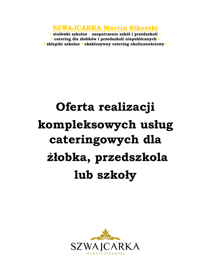 SZWAJCARKA Marcin Sikorski • stołówki szkolne • zaopatrzenie szkół i przedszkoli • • catering dla żłobków i przedszkoli niepublicznych • • sklepiki szkolne • ekskluzywny catering okolicznościowy • Oferta realizacji kompleksowych usług cateringowych dla żłobka, przedszkola lub szkoły Szanowni Państwo – pragniemy przedstawić ofertę realizacji usług cateringowych dostosowanej do potrzeb i preferencji Waszej placówki: w formie specjalistyczny catering przeznaczony dla dzieci w wieku żłobkowym, przedszkolnym i szkolnym. • Nasza firma istnieje na rynku od 1999 roku. Obecnie prowadzimy 10 stołówek szkolnych, zaopatrujemy kilkadziesiąt przedszkoli i zespołów szkolnoprzedszkolnych, a także realizujemy usługi cateringowe dla dużego zespołu szkół i kilkunastu prywatnych żłobków, przedszkoli i szkół. Do naszych klientów należą między innymi: Każdego dnia nasze kuchnie cateringowe przygotowują kilkaset zdrowych i urozmaiconych posiłków – śniadań, obiadów, podwieczorków – trafiających do placówek naszych klientów zlokalizowanych w różnych częściach Warszawy. Do wszystkich naszych klientów podchodzimy w sposób indywidualny, ściśle współpracując z kadrą kierowniczą placówek, a także uważnie wsłuchując się w potrzeby i uwagi Rodziców oraz Maluchów i starszych Uczniów. • Nasze jadłospisy opracowywane są przez trzech dietetyków, a realizują je zespoły doświadczonych kucharek i kucharzy. • Pracujemy zgodnie z systemem HACCP oraz zasadami GHP/GMP, dostosowaliśmy się w pełni do wszystkich wymogów prawnych dotyczących bezpieczeństwa żywności i żywienia. Regularnie przechodzimy kontrole przeprowadzane przez SANEPID oraz inne instytucje zajmujące się kontrolą bezpieczeństwa żywności i żywienia. • Realizujemy diety bezmleczne, bezglutenowe, eliminacyjne, wynikające z przekonań religijnych i światopoglądowych . Żywimy osoby chorujące na refluks, diabetyków, dzieci korzystające z pomp insulinowych. • Pozostajemy w stałym w kontakcie z naszymi klientami oraz rodzicami dzięki platformie informacyjnej jaką jest nasza strona internetowa www.szwajcarka.net. • Usługi cateringowe realizujemy korzystając z floty dopuszczonych do transportu żywności przez SANEPID. nowych pojazdów • Posiłki dostarczamy – zależnie od Państwa oczekiwań i potrzeb – w profesjonalnych pojemnikach/szafach termoizolacyjnych oraz pojemnikach GN ze stali nierdzewnej z uszczelkami silikonowymi i otworami odpowietrzającymi lub w wysokiej jakości pojemnikach bioplastikowych z trzciny cukrowej i naturalnych wosków (żywność pakowana jest metodą próżni lub MAP). • Korzystamy z własnego zaopatrzenia oraz usług najlepszych warszawskich dostawców, wykorzystujemy produkty pochodzące z rolnictwa ekologicznego. • Dysponujemy pakietem licznych pozytywnych referencji i zaświadczeń, które przedstawimy w dowolnej chwili na Państwa życzenie. • Jesteśmy najbardziej transparentną firmą na rynku warszawskiego żywienia zbiorowego oraz uczestnikiem projektu Rzetelna Firma. W przypadku zainteresowania naszą ofertą pozostajemy do Państwa dyspozycji: • Marcin Sikorski – właściciel firmy tel. 501 – 519 – 258/[email protected] • Łukasz Sukiennik – pełnomocnik właściciela firmy, dietetyk firmy tel. 535 – 250 – 791/[email protected] • Tomasz Hajduk – sekretarz firmy, dietetyk/specjalista ds. HACCP tel. 502 – 856 – 258/[email protected] Bardzo chętnie spotkamy się z Państwem również osobiście w dowolnym dogodnym dla Państwa terminie. Zapraszamy również na naszą stronę www.szwajcarka.net Szanowni Państwo, serdecznie dziękuję za czas poświęcony na zapoznanie się z naszą ofertą oraz zachęcam do podjęcia współpracy z moją firmą – będzie ona gwarancją bezpiecznej oraz nowocześnie zorganizowanej usługi cateringowej w Państwa placówce. z wyrazami szacunku oraz pozdrowieniami Marcin Sikorski