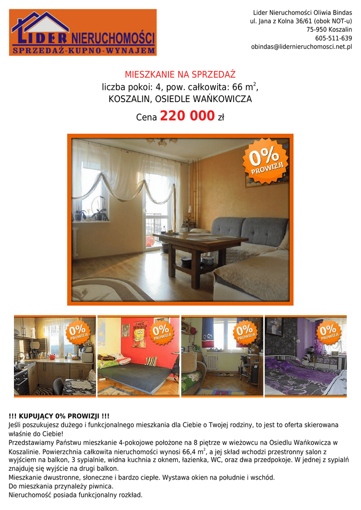 Lider Nieruchomości Oliwia Bindas ul. Jana z Kolna 36/61 (obok NOT-u) 75-950 Koszalin 605-511-639 [email protected] MIESZKANIE NA SPRZEDAŻ liczba pokoi: 4, pow. całkowita: 66 m2, KOSZALIN, OSIEDLE WAŃKOWICZA Cena 220 000 zł !!! KUPUJĄCY 0% PROWIZJI !!! Jeśli poszukujesz dużego i funkcjonalnego mieszkania dla Ciebie o Twojej rodziny, to jest to oferta skierowana właśnie do Ciebie! Przedstawiamy Państwu mieszkanie 4-pokojowe położone na 8 piętrze w wieżowcu na Osiedlu Wańkowicza w Koszalinie. Powierzchnia całkowita nieruchomości wynosi 66,4 m2, a jej skład wchodzi przestronny salon z wyjściem na balkon, 3 sypialnie, widna kuchnia z oknem, łazienka, WC, oraz dwa przedpokoje. W jednej z sypialń znajduję się wyjście na drugi balkon. Mieszkanie dwustronne, słoneczne i bardzo ciepłe. Wystawa okien na południe i wschód. Do mieszkania przynależy piwnica. Nieruchomość posiada funkcjonalny rozkład. Lider Nieruchomości Oliwia Bindas ul. Jana z Kolna 36/61 (obok NOT-u) 75-950 Koszalin 605-511-639 [email protected] Na wyposażeniu mieszkania pozostaję zabudowa kuchni oraz szafa w zabudowie znajdująca się w jednej z sypialń. Reszta umeblowania do uzgodnienia. Mieszkanie idealne dla rodziny z dziećmi ze względu na dużą przestrzeń w mieszkaniu. Nieruchomość położona na terenie o bogatej infrastrukturze. W pobliżu liczne sklepy, szkoły, przedszkola, żłobek, przychodnia, Galeria Emka, Politechnika Koszalińska,place zabaw. W niedalekiej odległości przystanki komunikacji miejskiej dzięki którym dostaną się Państwo w każdy zakątek Koszalina. Oglądanie po wcześniejszym umówieniu z Pośrednikiem. Symbol 134/LDR/OMS Typ nieruchomości MIESZKANIE Rodzaj transakcji SPRZEDAŻ Status AKTUALNA Rodzaj rynku WTÓRNY Cena 220 000 PLN Cena za m2 3 313,25 PLN Cena negocjowana NIE Kraj POLSKA Województwo ZACHODNIOPOMORSKIE Powiat koszaliński Gmina KOSZALIN Miejscowość KOSZALIN Kod pocztowy 75-950 Dzielnica - osiedle OSIEDLE WAŃKOWICZA Położenie MIASTO Budynki w sąsiedztwie OSIEDLE BLOKÓW MIESZKALNYCH Pow. całkowita 66,40 m2 Pow. użytkowa 66,40 m2 Rodzaj mieszkania 4-POKOJOWE Rodzaj budynku WIEŻOWIEC Rok budowy 1970 Standard DOBRY Konstrukcja budynku TRADYCYJNA Technika budowy WIELKA PŁYTA Typ kuchni Z OKNEM, ODDZIELNA Wyposażenie kuchni CZĘŚCIOWE Liczba łazienek 1 Stan łazienki DOBRY Liczba WC 1 Droga dojazdowa ULICA OSIEDLOWA Rodzaj nawierzchni ASFALTOWA / KOSTKA Liczba pokoi 4 Liczba sypialni 3 Piętro 8 Liczba pięter 11 Ilość poziomów 1 Umeblowanie CZĘŚCIOWE Źródło c.w. SIEĆ MIEJSKA Ogrzewanie C.O. Z SIECI MIEJSKIEJ Podpiwniczenie /piwnica PODPIWNICZONY Stan instalacji CZĘŚCIOWO WYMIENIONA Forma własności SPÓŁDZIELCZE WŁASNOŚCIOWE Winda w nieruchomości JEST Lider Nieruchomości Oliwia Bindas ul. Jana z Kolna 36/61 (obok NOT-u) 75-950 Koszalin 605-511-639 [email protected] Energia elektryczna JEST Podłączony gaz JEST Rodzaj kanalizacji MIEJSKA Źródło wody WODA MIEJSKA Głośność okolicy UMIARKOWANIE CICHE Kuchnia gazowa JEST Domofon JEST Rodzaj okien PLASTIKOWE Rodzaj podłogi PANELE, PARKIET, TERAKOTA Czy jest KW JEST Balkon JEST Widok na południe JEST Widok na wschód JEST Mariusz Leduchowski 725 825 702 [email protected] Więcej ofert na stronie www.lidernieruchomosci.net.pl