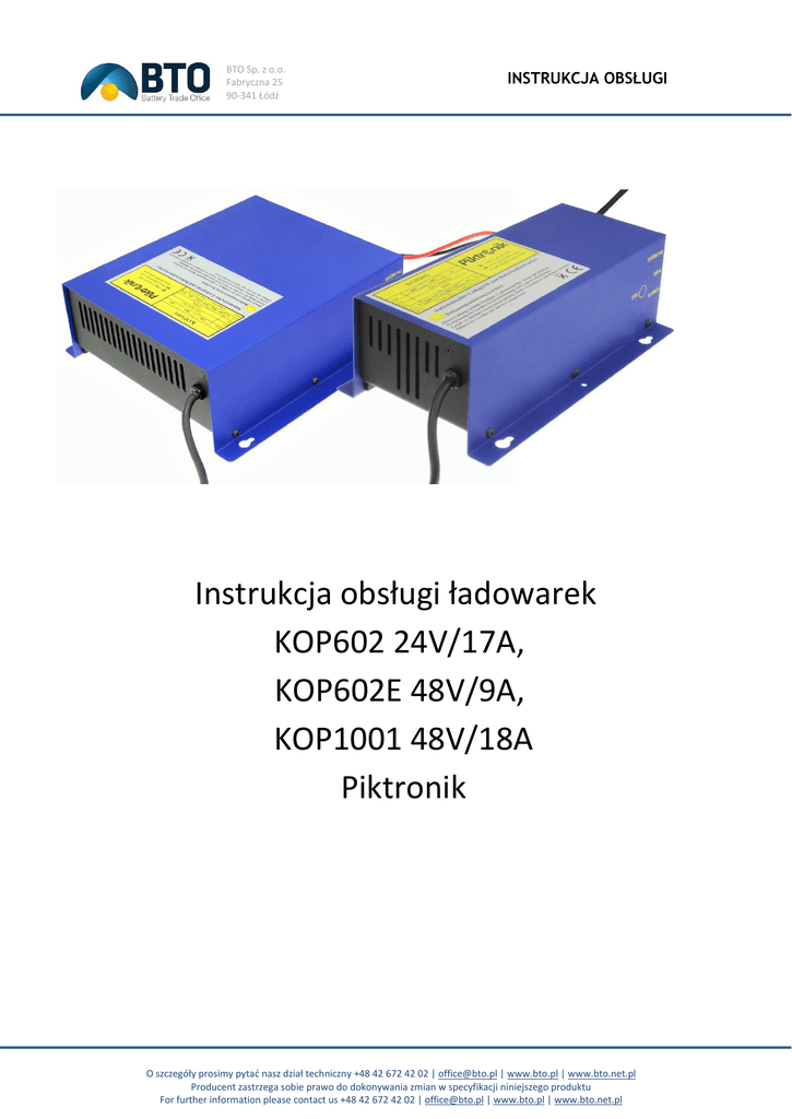 BTO Sp. z o.o. Fabryczna 25 90-341 Łódź INSTRUKCJA OBSŁUGI Instrukcja obsługi ładowarek KOP602 24V/17A, KOP602E 48V/9A, KOP1001 48V/18A Piktronik O szczegóły prosimy pytać nasz dział techniczny +48 42 672 42 02 | [email protected] | www.bto.pl | www.bto.net.pl Producent zastrzega sobie prawo do dokonywania zmian w specyfikacji niniejszego produktu For further information please contact us +48 42 672 42 02 | [email protected] | www.bto.pl | www.bto.net.pl BTO Sp. z o.o. Fabryczna 25 90-341 Łódź INSTRUKCJA OBSŁUGI Wstęp Sterowana mikroprocesorem, do pracy ciągłej, w pełni programowalna, multi-ładowarka do ładowania akumulatorów NiCD (niklowo-kadmowych), NiMH (niklowo-wodorkowych), Li-ION (litowo-jonowych) i kwasowo-ołowiowych (Pb). Ładowarki KOP602, 602E i KOP1001 są w pełni programowalne, odpowiednio do wymagań producenta akumulatorów. Parametry ładowania, mogą być ustawione w fabryce lub w warunkach eksploatacyjnych za pomocą unikalnego oprogramowania PC. Interfejs PC, podłącza się do ładowarki, do specjalnego gniazda zamontowanego w obudowie ładowarki. Dla użytkownika dostępne są parametry służące do monitorowania ładowania. Program podaje informacje z ostatnich 32 ładowań, czasy, napięcia i prądy ładowania a także temperaturę oraz informacje o błędach. Cechy produktu Pełna automatyka Ładowarka może pozostać na stałe dołączona do baterii. Dba o ładowanie akumulatora, jej kondycję a także monitoruje proces ładowania. Całkowicie programowalna: Parametry ładowania mogą być programowane, pod względem technologii wykonania: niklowokadmowej, niklowo-wodorkowej, litowo-jonowej lub kwasowo-ołowiowej. Zaprogramować można do 5 faz, każdą fazę oddzielnie. Parametry, które mogą być ustawiane to: maksymalny prąd i napięcie oraz maksymalny czas ładowania dla poszczególnych faz. Każda faza ładowania (z wyjątkiem pierwszej), może być ustawiana indywidualnie w zależności od uzyskanej pojemności akumulatora (Ah) w czasie lub po określonej liczbie zakończonych faz ładowania. Natomiast w pełni automatyczna korekcja faz ładowania jest możliwa przy standardowej konfiguracji parametrów i może być wykonywana po każdym zakończonym ładowaniu lub po zdefiniowanej ilości ładowań . Natomiast w programowalnym cyklu automatycznego doładowywania, możemy zmieniać czas pracy ładowarki w zależności od parametru najniższego, napięcia rozładowania akumulatora. Funkcja ta zapobiega nadmiernemu rozładowaniu ogniw w okresie przechowywania akumulatora. Monitor baterii i licznik Ah Ładowarka jest również monitorem baterii. Gromadzi dane o tym, na ile bateria jest naładowana. Określa parametry takie jak: całkowita liczba rozpoczętych ładowań ilość podłączeń do akumulatora, gdy napięcie ładowania zostało uruchomione głębokie rozładowanie może być zapamiętane do 16 razy w zakresach napięć pomiędzy 18V a 24V (dla ładowarki 24V) lub pomiędzy 36 i 48 (dla ładowarki 48V), łączny prąd pobierany w czasie ładowania O szczegóły prosimy pytać nasz dział techniczny +48 42 672 42 02 | [email protected] | www.bto.pl | www.bto.net.pl Producent zastrzega sobie prawo do dokonywania zmian w specyfikacji niniejszego produktu For further information please contact us +48 42 672 42 02 | [email protected] | www.bto.pl | www.bto.net.pl BTO Sp. z o.o. Fabryczna 25 90-341 Łódź INSTRUKCJA OBSŁUGI prąd pobierany dla każdej fazy ładowania oddzielnie ilość prądu zużytego do naładowania akumulatora w trakcie ostatnich 32 ładowań rzeczywistą pojemność akumulatora lub baterii (przy prawidłowym naładowaniu) czas ostatniego ładowania (każda faza ładowania osobno) oraz czas wszystkich ładowań razem. Dane te, oraz parametry ładowarki, dostępne są przez interfejs podłączony do komputera PC i wyświetlane na monitorze. Wysoka precyzja Każda ładowarka jest fabrycznie skalibrowana, bez konieczności wykonywania dodatkowych kalibracji przez użytkownika. Brak potencjometrów i innych ruchomych części, wpływa na wygodę obsługi, zwłaszcza podczas eksploatacji w pojeździe. Kompensacja temperatury Ładowarka reguluje napięcie ładowania w zależności od temperatury baterii, zapewniając tym dokładniejsze ładowanie w każdym klimacie. Do tej funkcji potrzebny jest czujnik temperatury (wyposażenie opcjonalne). Koszt czujnika temperatury jest niewielki. Kontrolę temperatury i regulację napięcia akumulatora, można włączyć dla każdego ładowania/fazy oddzielnie. Wartości te, ustawiać można dla głównego procesu ładowania jak i ładowania podtrzymującego. Wskaźniki LED stanu baterii Trzy diody LED (błąd ładowania, ładowanie i 100% naładowania) wskazują poszczególne fazy pracy ładowarki. Wskazania diod LED, są programowalne dla użytkownika. Standardowe wskazania diod LED: Po podłączeniu akumulatora, czerwona dioda LED miga kilka razy, a następnie zostaje wyłączona Gdy rozpoczyna się proces ładowania zapala się żółta dioda LED (wentylator zaczyna działać) Żółta dioda świeci: główna faza ładowania przy maksymalnym prądzie ładowania Żółta dioda miga wolno (1 sek.): ok 80 % naładowania Żółta dioda miga szybciej (0,3 sek.): około 30 min. do zakończenia ładowania Zielona dioda świeci: akumulator naładowany w 100% O szczegóły prosimy pytać nasz dział techniczny +48 42 672 42 02 | [email protected] | www.bto.pl | www.bto.net.pl Producent zastrzega sobie prawo do dokonywania zmian w specyfikacji niniejszego produktu For further information please contact us +48 42 672 42 02 | [email protected] | www.bto.pl | www.bto.net.pl BTO Sp. z o.o. Fabryczna 25 90-341 Łódź INSTRUKCJA OBSŁUGI Inne zalety Niewielkie rozmiary, niska waga, zwarta obudowa i bezpieczna praca to na pewno ważne zalety urządzenia. Parametry techniczne ładowarek Typ ładowarki Nominalne napięcie akumulatora Programowalne napięcie wyjściowe Programowalny prąd wyj