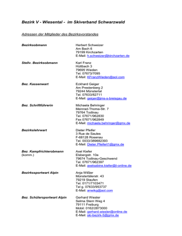Bezirk V - Wiesental - im Skiverband Schwarzwald Adressen der Mitglieder des Bezirksvorstandes Bezirksobmann Herbert Schweizer Am Bach 6 79199 Kirchzarten E-Mail: [email protected] Stellv. Bezirksobmann Karl Franz Hüttbach 3 79695 Wieden Tel. 07673/7095 E-Mail: [email protected] Bez. Kassenwart Eckhard Geiger Am Prestenberg 2 79244 Münstertal Tel. 07633/82711 E-Mail: [email protected] Bez. Schriftführerin Michaela Behringer Meinrad-Thoma-Str. 7 79764 Todtnau Tel. 07671/962830 Fax 07671/962849 E-Mail: [email protected] Bezirkslehrwart Dieter Pfeifer 3 Rue de Saules F-68128 Rosenau Tel. 0033/389682393 E-Mail: [email protected] Bez. Kampfrichterobmann (komm.) Axel Kiefer Elsbergstr. 10a 79674 Todtnau-Geschwend Tal. 07671/962397 E-Mail: [email protected] Bezirkssportwart Alpin Anja Wißler Münstertälerstr. 43 79219 Staufen Tel. 0171/7103471 Tel g. 07633/953737 E-Mail: [email protected] Bez. Schülersportwart Alpin Gerhard Wiesler Selma Stern Weg 4 79111 Freiburg Mobil: 0162/2873000 E-Mail: [email protected] E-Mail: [email protected] Stellv. Bez. Schülersportwart Alpin Jürgen Stähle Im Grün 1 79694 Utzenfeld Tel. 07673/8684 E-Mail: [email protected] Bezirkssportwart Nordisch Markus Pfefferle Bergstr. 22 79674 Todtnau Tel. 07671/962166 E-Mail: [email protected] Stellv. Bezirkssportwartin Nordisch Beatrix Beckert Untere Gasse 27 79244 Münstertal Tel. 07636/788013 E-Mail: [email protected] Bezirikssportwart Biathlon Karin Schöttler Wilhelm-Grein-Weg 4 79618 Rheinfelden Tel. 07623/747978 E-Mail: [email protected] Stellv. Bezirkssportwart Biathlon Johannes Wunderle Talstraße 30-1 79674 Todtnau Tel. 07671/8153 E-Mail: [email protected] Bez. Referent für Schulwesen Armin Wolf Fahl 4 79674 Todtnau Tel: 07676/939640 E-Mail: [email protected] Stand: 06.10.2015
