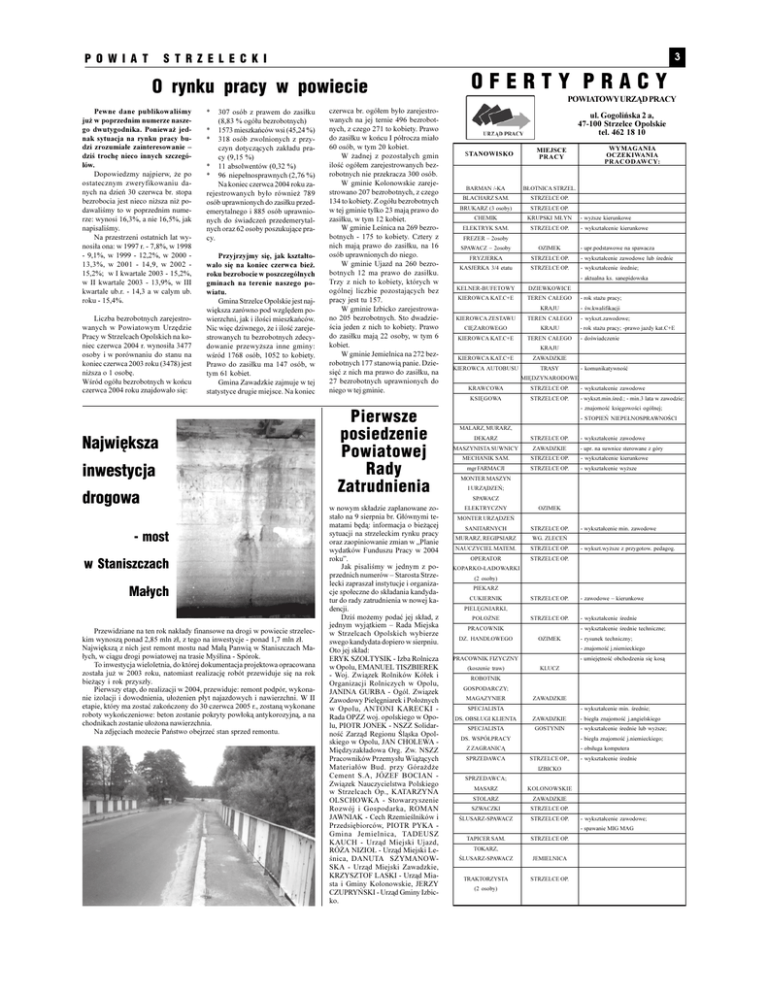 P O W I A T 3 S T R Z E L E C K I OFERTY PRACY O rynku pracy w powiecie Pewne dane publikowalimy ju¿ w poprzednim numerze naszego dwutygodnika. Poniewa¿ jednak sytuacja na rynku pracy budzi zrozumia³e zainteresowanie * (8,83 % ogó³u bezrobotnych) * 1573 mieszkañców wsi (45,24 %) * 318 osób zwolnionych z przyczyn dotycz¹cych zak³adu pra- dzi trochê nieco innych szczegó³ów. Dopowiedzmy najpierw, ¿e po ostatecznym zweryfikowaniu danych na dzieñ 30 czerwca br. stopa bezrobocia jest nieco ni¿sza ni¿ podawalimy to w poprzednim numerze: wynosi 16,3%, a nie 16,5%, jak napisalimy. Na przestrzeni ostatnich lat wynosi³a ona: w 1997 r. - 7,8%, w 1998 cy (9,15 %) * * 15,2%; w I kwartale 2003 - 15,2%, w II kwartale 2003 - 13,9%, w III kwartale ub.r. - 14,3 a w calym ub. roku - 15,4%. 11 absolwentów (0,32 %) 96 niepe³nosprawnych (2,76 %) Na koniec czerwca 2004 roku za- rejestrowanych by³o równie¿ 789 osób uprawnionych do zasi³ku przedemerytalnego i 885 osób uprawnionych do wiadczeñ przedemerytalnych oraz 62 osoby poszukuj¹ce pracy. - 9,1%, w 1999 - 12,2%, w 2000 13,3%, w 2001 - 14,9, w 2002 - 307 osób z prawem do zasi³ku Przyjrzyjmy siê, jak kszta³towa³o siê na koniec czerwca bie¿. roku bezrobocie w poszczególnych gminach na terenie naszego powiatu. Gmina Strzelce Opolskie jest naj- Liczba bezrobotnych zarejestrowanych w Powiatowym Urzêdzie Pracy w Strzelcach Opolskich na koniec czerwca 2004 r. wynosi³a 3477 osoby i w porównaniu do stanu na koniec czerwca 2003 roku (3478) jest ni¿sza o 1 osobê. Wród ogó³u bezrobotnych w koñcu czerwca 2004 roku znajdowa³o siê: wiêksza zarówno pod wzglêdem powierzchni, jak i iloci mieszkañców. Nic wiêc dziwnego, ¿e i iloæ zarejestrowanych tu bezrobotnych zdecydowanie przewy¿sza inne gminy: wród 1768 osób, 1052 to kobiety. Prawo do zasi³ku ma 147 osób, w tym 61 kobiet. Gmina Zawadzkie zajmuje w tej statystyce drugie miejsce. Na koniec Najwiêksza inwestycja drogowa POWIATOWY URZ¥D PRACY czerwca br. ogó³em by³o zarejestro- 60 osób, w tym 20 kobiet. Ma³ych W ¿adnej z pozosta³ych gmin W gminie Kolonowskie zarejestrowano 207 bezrobotnych, z czego 134 to kobiety. Z ogó³u bezrobotnych w tej gminie tylko 23 maj¹ prawo do zasi³ku, w tym 12 kobiet. Najwiêksz¹ z nich jest remont mostu nad Ma³¹ Panwi¹ w Staniszczach Ma³ych, w ci¹gu drogi powiatowej na trasie My³ina - Spórok. To inwestycja wieloletnia, do której dokumentacja projektowa opracowana zosta³a ju¿ w 2003 roku, natomiast realizacjê robót przewiduje siê na rok bie¿¹cy i rok przysz³y. Pierwszy etap, do realizacji w 2004, przewiduje: remont podpór, wykona- nie izolacji i dowodnienia, u³o¿enien p³yt najazdowych i nawierzchni. W II etapie, który ma zostaæ zakoñczony do 30 czerwca 2005 r., zostan¹ wykonane roboty wykoñczeniowe: beton zostanie pokryty pow³ok¹ antykorozyjn¹, a na chodnikach zostanie u³o¿ona nawierzchnia. Na zdjêciach mo¿ecie Pañstwo obejrzeæ stan sprzed remontu. MIEJSCE PRACY WYMAGANIA OCZEKIWANIA P R A C O D AW C Y: BARMAN /-KA B£OTNICA STRZEL. BLACHARZ SAM. STRZELCE OP. BRUKARZ (3 osoby) STRZELCE OP. CHEMIK KRUPSKI M£YN W gminie Lenica na 269 bezro- ELEKTRYK SAM. STRZELCE OP. botnych - 175 to kobiety. Cztery z FREZER 2osoby nich maj¹ prawo do zasi³ku, na 16 SPAWACZ 2osoby OZIMEK FRYZJERKA STRZELCE OP. - wykszta³cenie zawodowe lub rednie KASJERKA 3/4 etatu STRZELCE OP. - wykszta³cenie rednie; KELNER-BUFETOWY DZIEWKOWICE KIEROWCA KAT.C+E TEREN CA£EGO - rok sta¿u pracy; KRAJU - w.kwalifikacji osób uprawnionych do niego. W gminie Ujazd na 260 bezrobotnych 12 ma prawo do zasi³ku. Trzy z nich to kobiety, których w ogólnej liczbie pozostaj¹cych bez pracy jest tu 157. no 205 bezrobotnych. Sto dwadzie- KIEROWCA ZESTAWU TEREN CA£EGO cia jeden z nich to kobiety. Prawo CIʯAROWEGO KRAJU do zasi³ku maj¹ 22 osoby, w tym 6 KIEROWCA KAT.C+E TEREN CA£EGO kobiet. W gminie Jemielnica na 272 bezrobotnych 177 stanowi¹ panie. Dziesiêæ z nich ma prawo do zasi³ku, na 27 bezrobotnych uprawnionych do niego w tej gminie. Pierwsze posiedzenie Powiatowej Rady Zatrudnienia w nowym sk³adzie zaplanowane zo- matami bêd¹: informacja o bie¿¹cej sytuacji na strzeleckim rynku pracy oraz zaopiniowanie zmian w Planie roku. Jak pisalimy w jednym z po- przednich numerów Starosta Strze- lecki zaprasza³ instytucje i organizacje spo³eczne do sk³adania kandyda- tur do rady zatrudnienia w nowej ka- jednym wyj¹tkiem Rada Miejska swego kandydata dopiero w sierpniu. - upr.podstawowe na spawacza - wykszt.zawodowe; - rok sta¿u pracy; -prawo jazdy kat.C+E - dowiadczenie KRAJU KIEROWCA KAT.C+E KIEROWCA AUTOBUSU ZAWADZKIE TRASY - komunikatywnoæ MIÊDZYNARODOWE KRAWCOWA STRZELCE OP. - wykszta³cenie zawodowe KSIÊGOWA STRZELCE OP. - wykszt.min.red.; - min.3 lata w zawodzie; - znajomoæ ksiêgowoci ogólnej; - STOPIEÑ NIEPE£NOSPRAWNOCI MALARZ, MURARZ, DEKARZ STRZELCE OP. MASZYNISTA SUWNICY ZAWADZKIE - wykszta³cenie zawodowe - upr. na suwnice sterowane z góry MECHANIK SAM. STRZELCE OP. - wykszta³cenie kierunkowe mgr FARMACJI STRZELCE OP. - wykszta³cenie wy¿sze MONTER MASZYN I URZ¥DZEÑ; SPAWACZ ELEKTRYCZNY OZIMEK MONTER URZ¥DZEÑ SANITARNYCH STRZELCE OP. MURARZ, REGIPSIARZ WG. ZLECEÑ NAUCZYCIEL MATEM. STRZELCE OP. OPERATOR STRZELCE OP. - wykszta³cenie min. zawodowe - wykszt.wy¿sze z przygotow. pedagog. KOPARKO-£ADOWARKI (2 osoby) PIEKARZ CUKIERNIK STRZELCE OP. - zawodowe kierunkowe PO£O¯NE STRZELCE OP. - wykszta³cenie rednie PRACOWNIK DZ. HANDLOWEGO - wykszta³cenie rednie techniczne; OZIMEK ERYK SZO£TYSIK - Izba Rolnicza w Opolu, EMANUEL TISZBIEREK - Woj. Zwi¹zek Rolników Kó³ek i Organizacji Rolniczych w Opolu, JANINA GURBA - Ogól. Zwi¹zek Zawodowy Pielêgniarek i Po³o¿nych w Opolu, A N TONI KARECKI - Rada OPZZ woj. opolskiego w Opo- lu, PIOTR JONEK - NSZZ Solidarnoæ Zarz¹d Regionu l¹ska Opol- skiego w Opolu, JAN CHOLEWA - Miêdzyzak³adowa Org. Zw. NSZZ Pracowników Przemys³u Wi¹¿¹cych PRACOWNIK 