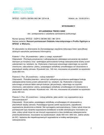 SPZOZ - OiZP/3 /38/380-382/ 34 / 2014/ A Wieluń, dn. 19.09.2014 r. WYKONAWCY WYJAŚNIENIA TREŚCI SIWZ dot.: postępowania o udzielenie zamówienia publicznego. Numer sprawy: SPZOZ - OiZP/3 /38/380-382 / 34 / 2014 Nazwa zadania: Remont pomieszczeń Oddziału Internistycznego o Profilu Ogólnym w SPZOZ w Wieluniu. W odpowiedzi na skierowane do Zamawiającego zapytania dotyczące treści specyfikacji istotnych warunków zamówienia informujemy: Pytanie 1: Poz. 26 przedmiaru - jakie i z czego, wysokość? Odpowiedź: Pochwyty przyścienne ( odbojoporęcze) ułatwiające poruszanie się osobom starszym po korytarzu oraz spełniające jednocześnie funkcję zabezpieczenia ściany przed uderzeniami np. wózkami, itp. Wykonane z tworzywa sztucznego odpornego na czynniki chemiczne, zabrudzenia i plamy, posiadające certyfikaty umożliwiające ich stosowanie w placówkach służby zdrowia. Wysokość min. 140 mm, mocowana od posadzki na wysokości około 850 mm. Pytanie 2. Poz. 25 przedmiaru - rodzaj materiału? Odpowiedź: Pomyłka pisarska – winno być odbojnica przyścienna spełniająca funkcję zabezpieczenia ściany przed uderzeniami np. wózkami, itp. Wykonane z tworzywa sztucznego w kolorze takim samym kolorze, jak pochwyty, odpornego na czynniki chemiczne, zabrudzenia i plamy, posiadające certyfikaty umożliwiające ich stosowanie w placówkach służby zdrowia. Wysokość min. 140 mm, mocowana od posadzki na wysokości około 450 mm. Pytanie 3. Poz. 24 przedmiaru - rodzaj szklenia, jakie zamki i czy wyposażone są w samozamykacze? Odpowiedź: Drzwi pełne, posiadające certyfikaty umożliwiające ich stosowanie w placówkach służby zdrowia. Posiadające typowe zamki wpuszczane, zapadkowe, wyposażone obustronnie w klamki. Nie wymagamy samozamykaczy. Cztery sztuki drzwi do pomieszczeń typu łazienka wyposażone dodatkowo w kratki wentylacyjne mocowane na dole, cztery sztuki drzwi do sal chorych wyposażone w dwa dodatkowe zabezpieczenia przeciwuderzeniowe, mocowane na wysokościach: około 450 mm i 850 mm. Jedna sztuka do WC / łazienka dla niepełnosprawnych wyposażona w kratkę wentylacyjną i zabezpieczenia. 1 Pytanie 4. Poz. 36,37,38 czy te elementy wyposażenia mają mieć szczególne cechy, tzn. dla służby zdrowia? Odpowiedź: Standardowe elementy wyposażenia stosowane w placówkach służby zdrowia. Pytanie 5. Poz. 41 przedmiaru - obmiar dotyczy sztuk, czy m2 ? Odpowiedź: Obmiar dotyczy m2. Pomyłka pisarska – winno być 1,50 m2. Pytanie 6. Poz. 49 przedmiaru - proszę o uszczegółowienie, parametry lub wzór o jaką tablicę chodzi? Odpowiedź: Pomyłka pisarska winno być skrzynka zaworowo-informacyjna. Skrzynka ma umożliwiać zamykanie / otwieranie przepływu gazów medycznych, stałą kontrolę ciśnienia gazów medycznych oraz zapewniać podłączenie zasilania awaryjnego dla obsługiwanego obszaru w przypadku awarii centralnego zasilania w gazy medyczne. Skrzynka ma być wyposażona w elementy dla trzech gazów medycznych: tlen, Vac i Air. Pytanie 7. Poz. 50 przedmiaru - proszę o uszczegółowienie, parametry lub wzór o jakie panele chodzi? Odpowiedź: Naścienne panele (tablice) poboru gazów medycznych wykonane w wersji dwurzędowej, zawierające sześć punktów poboru gazów medycznych 2 x tlen, 2 x Vac, 2 x Air, dla wtyku typu szwedzkiego – AGA. Wykonane z blachy stalowej malowanej proszkowo lub ze stali nierdzewnej. Pytanie 8. Poz. 58 przedmiaru - co oznacza dostawa inwestorska, czyli kto za to płaci?. Jednocześnie proszę o typ rodzaj, parametry. Odpowiedź: Dostawa inwestorska oznacza, iż zamawiający posiada już dany element wyposażenia i należy policzyć tylko jego demontaż i montaż w innym miejscu. Są to dwie naścienne tablice gazów medycznych zawierające po dwa punkty poboru gazów medycznych 1 x tlen, 1 x Vac. Pytanie 9. Poz. 82, 83 przedmiaru - czy te elementy maja szczególne wymagania? Odpowiedź: W poz. 82 należy policzyć jedną baterię umywalkową dla osób niepełnosprawnych mocowaną na umywalce dla niepełnosprawnych, otwieraną za pomocą specjalnej dźwigni. Pozostałe baterie to standardowe elementy wyposażenia stosowane w placówkach służby zdrowia. W poz. 83 należy policzyć jedną baterię natryskową dla osób niepełnosprawnych, otwieraną za pomocą specjalnej dźwigni. Pozostałe baterie to standardowe elementy wyposażenia stosowane w placówkach służby. Ponadto w poz. 86 należy policzyć jedną specjalną umywalkę dostosowaną dla osób niepełnosprawnych, natomiast w poz. 87 jedną miskę ustępową dostosowaną dla osób niepełnosprawnych. Pytanie 10. Poz. 86 - czy istnieje wymóg odsuwania umywalki od ściany? Odpowiedź: Zamawiający nie wymaga odsuwania umywalek od ściany. 2 Pytanie 11. Poz. 91, 92, - czy te elementy maja być standardowe, czy też posiadają szczególne wymagania? Odpowiedź: Standardowe elementy wyposażenia stosowane w placówkach służby zdrowia. Pytanie 12. Poz. 95 - bateria z rączką prysznicową, czy z natryskiem na uchwycie ? Odpowiedź: Bateria z wężem i rączką prysznicową montowaną dodatkowo na uchwycie, pozwalającym na jej przesuwanie na różnej wysokości. Pytanie 13. Poz. 96 - proszę podać wymiary wymaganych brodzików, rodzaj materiału. Odpowiedź: Brodziki emaliowane o wymiarach 80 x 80 cm. Należy policzyć dodatkowo 8 szt. narożnej kabiny natryskowej, omyłkowo nie ujęte w przedmiarze. Wszystko to standardowe elementy wyposażenia mogące być stosowane w placówkach służby zdrowia. Zamawiający informuje, że pytania oraz odpowiedzi na nie stają się integralną częścią specyfikacji istotnych warunków zamówienia i będą wiążące przy składaniu ofert. 3