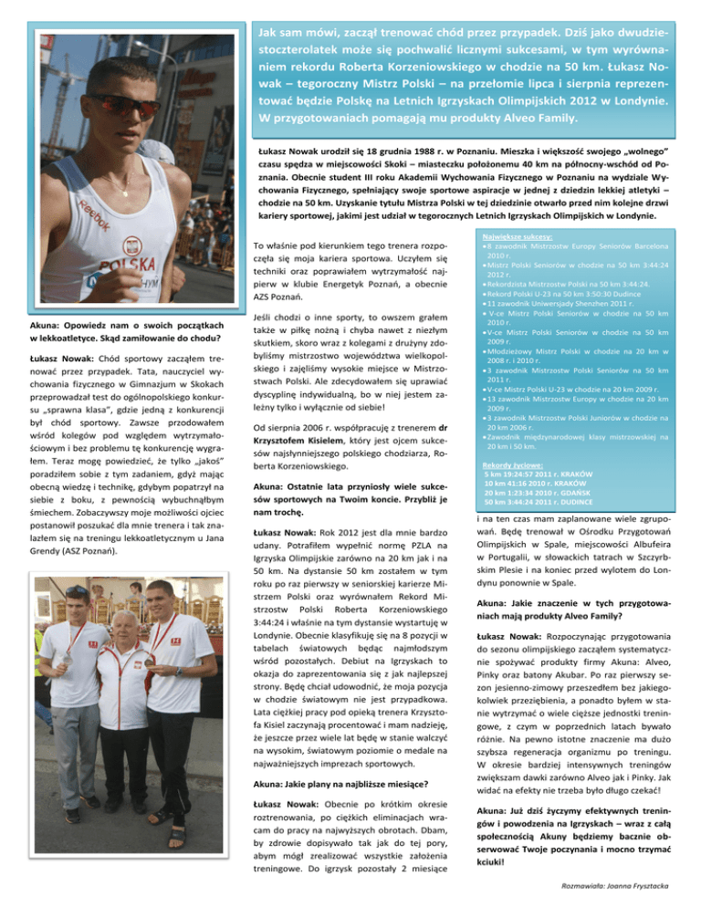 Jak sam mówi, zaczął trenować chód przez przypadek. Dziś jako dwudziestoczterolatek może się pochwalić licznymi sukcesami, w tym wyrównaniem rekordu Roberta Korzeniowskiego w chodzie na 50 km. Łukasz Nowak – tegoroczny Mistrz Polski – na przełomie lipca i sierpnia reprezentować będzie Polskę na Letnich Igrzyskach Olimpijskich 2012 w Londynie. W przygotowaniach pomagają mu produkty Alveo Family. Łukasz Nowak urodził się 18 grudnia 1988 r. w Poznaniu. Mieszka i większość swojego „wolnego” czasu spędza w miejscowości Skoki – miasteczku położonemu 40 km na północny-wschód od Poznania. Obecnie student III roku Akademii Wychowania Fizycznego w Poznaniu na wydziale Wychowania Fizycznego, spełniający swoje sportowe aspiracje w jednej z dziedzin lekkiej atletyki – chodzie na 50 km. Uzyskanie tytułu Mistrza Polski w tej dziedzinie otwarło przed nim kolejne drzwi kariery sportowej, jakimi jest udział w tegorocznych Letnich Igrzyskach Olimpijskich w Londynie. To właśnie pod kierunkiem tego trenera rozpoczęła się moja kariera sportowa. Uczyłem się techniki oraz poprawiałem wytrzymałość najpierw w klubie Energetyk Poznań, a obecnie AZS Poznań. Akuna: Opowiedz nam o swoich początkach w lekkoatletyce. Skąd zamiłowanie do chodu? Łukasz Nowak: Chód sportowy zacząłem trenować przez przypadek. Tata, nauczyciel wychowania fizycznego w Gimnazjum w Skokach przeprowadzał test do ogólnopolskiego konkursu „sprawna klasa”, gdzie jedną z konkurencji był chód sportowy. Zawsze przodowałem wśród kolegów pod względem wytrzymałościowym i bez problemu tę konkurencję wygrałem. Teraz mogę powiedzieć, że tylko „jakoś” poradziłem sobie z tym zadaniem, gdyż mając obecną wiedzę i technikę, gdybym popatrzył na siebie z boku, z pewnością wybuchnąłbym śmiechem. Zobaczywszy moje możliwości ojciec postanowił poszukać dla mnie trenera i tak znalazłem się na treningu lekkoatletycznym u Jana Grendy (ASZ Poznań). Jeśli chodzi o inne sporty, to owszem grałem także w piłkę nożną i chyba nawet z niezłym skutkiem, skoro wraz z kolegami z drużyny zdobyliśmy mistrzostwo województwa wielkopolskiego i zajęliśmy wysokie miejsce w Mistrzostwach Polski. Ale zdecydowałem się uprawiać dyscyplinę indywidualną, bo w niej jestem zależny tylko i wyłącznie od siebie! Od sierpnia 2006 r. współpracuję z trenerem dr Krzysztofem Kisielem, który jest ojcem sukcesów najsłynniejszego polskiego chodziarza, Roberta Korzeniowskiego. Akuna: Ostatnie lata przyniosły wiele sukcesów sportowych na Twoim koncie. Przybliż je nam trochę. Łukasz Nowak: Rok 2012 jest dla mnie bardzo udany. Potrafiłem wypełnić normę PZLA na Igrzyska Olimpijskie zarówno na 20 km jak i na 50 km. Na dystansie 50 km zostałem w tym roku po raz pierwszy w seniorskiej karierze Mistrzem Polski oraz wyrównałem Rekord Mistrzostw Polski Roberta Korzeniowskiego 3:44:24 i właśnie na tym dystansie wystartuję w Londynie. Obecnie klasyfikuję się na 8 pozycji w tabelach światowych będąc najmłodszym wśród pozostałych. Debiut na Igrzyskach to okazja do zaprezentowania się z jak najlepszej strony. Będę chciał udowodnić, że moja pozycja w chodzie światowym nie jest przypadkowa. Lata ciężkiej pracy pod opieką trenera Krzysztofa Kisiel zaczynają procentować i mam nadzieję, że jeszcze przez wiele lat będę w stanie walczyć na wysokim, światowym poziomie o medale na najważniejszych imprezach sportowych. Akuna: Jakie plany na najbliższe miesiące? Łukasz Nowak: Obecnie po krótkim okresie roztrenowania, po ciężkich eliminacjach wracam do pracy na najwyższych obrotach. Dbam, by zdrowie dopisywało tak jak do tej pory, abym mógł zrealizować wszystkie założenia treningowe. Do igrzysk pozostały 2 miesiące Największe sukcesy: 8 zawodnik Mistrzostw Europy Seniorów Barcelona 2010 r. Mistrz Polski Seniorów w chodzie na 50 km 3:44:24 2012 r. Rekordzista Mistrzostw Polski na 50 km 3:44:24. Rekord Polski U-23 na 50 km 3:50:30 Dudince 11 zawodnik Uniwersjady Shenzhen 2011 r. V-ce Mistrz Polski Seniorów w chodzie na 50 km 2010 r. V-ce Mistrz Polski Seniorów w chodzie na 50 km 2009 r. Młodzieżowy Mistrz Polski w chodzie na 20 km w 2008 r. i 2010 r. 3 zawodnik Mistrzostw Polski Seniorów na 50 km 2011 r. V-ce Mistrz Polski U-23 w chodzie na 20 km 2009 r. 13 zawodnik Mistrzostw Europy w chodzie na 20 km 2009 r. 3 zawodnik Mistrzostw Polski Juniorów w chodzie na 20 km 2006 r. Zawodnik międzynarodowej klasy mistrzowskiej na 20 km i 50 km. Rekordy życiowe: 5 km 19:24:57 2011 r. KRAKÓW 10 km 41:16 2010 r. KRAKÓW 20 km 1:23:34 2010 r. GDAŃSK 50 km 3:44:24 2011 r. DUDINCE i na ten czas mam zaplanowane wiele zgrupowań. Będę trenował w Ośrodku Przygotowań Olimpijskich w Spale, miejscowości Albufeira w Portugalii, w słowackich tatrach w Szczyrbskim Plesie i na koniec przed wylotem do Londynu ponownie w Spale. Akuna: Jakie znaczenie w tych przygotowaniach mają produkty Alveo Family? Łukasz Nowak: Rozpoczynając przygotowania do sezonu olimpijskiego zacząłem systematycznie spożywać produkty firmy Akuna: Alveo, Pinky oraz batony Akubar. Po raz pierwszy sezon jesienno-zimowy przeszedłem bez jakiegokolwiek przeziębienia, a ponadto byłem w stanie wytrzymać o wiele cięższe jednostki treningowe, z czym w poprzednich latach bywało różnie. Na pewno istotne znaczenie ma dużo szybsza regeneracja organizmu po treningu. W okresie bardziej intensywnych treningów zwiększam dawki zarówno Alveo jak i Pinky. Jak widać na efekty nie trzeba było długo czekać! Akuna: Już dziś życzymy efektywnych treningów i powodzenia na Igrzyskach – wraz z całą społecznością Akuny będziemy bacznie obserwować Twoje poczynania i mocno trzymać kciuki! Rozmawiała: Joanna Frysztacka