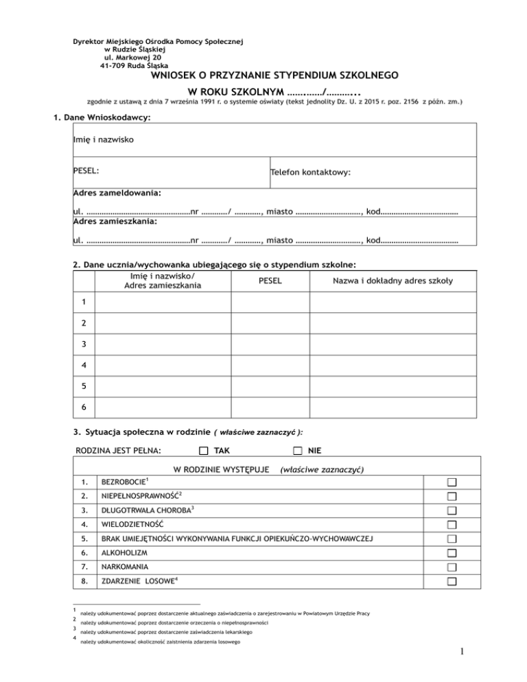 Dyrektor Miejskiego Ośrodka Pomocy Społecznej w Rudzie Śląskiej ul. Markowej 20 41-709 Ruda Śląska WNIOSEK O PRZYZNANIE STYPENDIUM SZKOLNEGO W ROKU SZKOLNYM …….……/………... zgodnie z ustawą z dnia 7 września 1991 r. o systemie oświaty (tekst jednolity Dz. U. z 2015 r. poz. 2156 z późn. zm.) 1. Dane Wnioskodawcy: Imię i nazwisko PESEL: Telefon kontaktowy: Adres zameldowania: ul. …………………………………………nr …………/ …………, miasto …………………………, kod……………………………… Adres zamieszkania: ul. …………………………………………nr …………/ …………, miasto …………………………, kod……………………………… 2. Dane ucznia/wychowanka ubiegającego się o stypendium szkolne: Imię i nazwisko/ PESEL Nazwa i dokładny adres szkoły Adres zamieszkania 1 2 3 4 5 6 3. Sytuacja społeczna w rodzinie ( właściwe zaznaczyć ): RODZINA JEST PEŁNA: TAK W RODZINIE WYSTĘPUJE 1 2 3 4 NIE (właściwe zaznaczyć) 1 1. BEZROBOCIE 2. NIEPEŁNOSPRAWNOŚĆ2 3. DŁUGOTRWAŁA CHOROBA3 4. WIELODZIETNOŚĆ 5. BRAK UMIEJĘTNOŚCI WYKONYWANIA FUNKCJI OPIEKUŃCZO-WYCHOWAWCZEJ 6. ALKOHOLIZM 7. NARKOMANIA 8. ZDARZENIE LOSOWE4 należy udokumentować poprzez dostarczenie aktualnego zaświadczenia o zarejestrowaniu w Powiatowym Urzędzie Pracy należy udokumentować poprzez dostarczenie orzeczenia o niepełnosprawności należy udokumentować poprzez dostarczenie zaświadczenia lekarskiego należy udokumentować okoliczność zaistnienia zdarzenia losowego 1 4. Oświadczam, że moja rodzina5 składa się z niżej wymienionych osób, pozostających we wspólnym gospodarstwie domowym: L.p. Imię i nazwisko PESEL Miejsce pracy - nauki Stopień pokrewieństwa 1. 2. 3. 4. 5. 6. 7. 8. 9. 10. Oświadczenie o sytuacji zawodowej i rodzinnej: …............................................................................................................................ ..................................................... …............................................................................................................................ ..................................................... …................................................................................................................................................................................. …............................................................................................................................ ..................................................... …............................................................................................................................ ..................................................... …............................................................................................................................................................................ ..... …........................................................................................................................... ...................................................... …............................................................................................................................ ..................................................... …................................................................................................................................................ ................................. …................................................................................................................................................................................. …............................................................................................................................ ..................................................... …............................................................................................................................ ..................................................... …................................................................................................................................................................................. …............................................................................................................................ ..................................................... …............................................................................................................................ ..................................................... …................................................. (podpis Wnioskodawcy) 5 rodzina - osoby spokrewnione lub niespokrewnione pozostające w faktycznym związku, wspólnie zamieszkujące i gospodarujące 2 5. Deklaracja o wysokości dochodów 6: a. oświadczam, ze dochody moje i członków mojego gospodarstwa domowego za miesiąc ……………………………………………………………………………………………… wynosiły: RODZAJ DOCHODU Z TYTUŁU: JEST/BRAK IMIĘ I NAZWISKO CZŁONKA RODZINY: IMIĘ I NAZWISKO CZŁONKA RODZINY: 6 -zatrudnienia ( na umowę o pracę, zlecenie, umowa o dzieło, inne) …............................................................................................................. -świadczenia z Powiatowego Urzędu Pracy …............................................................................................................. -świadczenia z Zus-u ….......................................................................................................... ... -dodatek mieszkaniowy …............................................................................................................. -zasiłek okresowy …............................................................................................................. -zasiłek stały …...........................................................................................