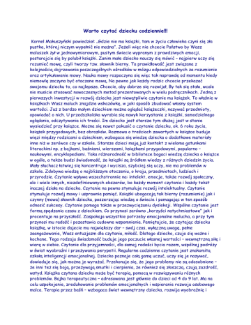 Warto czytać dziecku codziennie!!! Kornel Makuszyński powiedział: „Gdzie nie ma książki, tam w życiu człowieka czyni się zła pustka, której niczym wypełnić nie można”. Jeżeli więc nie chcecie Państwo by Wasz maluszek żył w jednowymiarowym, pustym świecie wypranym z prawdziwych emocji, postarajcie się by polubił książki. Zanim małe dziecko nauczy się mówić – najpierw uczy się rozumieć mowę, czyli tworzy tzw. słownik bierny. Ta prawidłowość jest związana z kolejnością dojrzewania poszczególnych ośrodków w mózgu odpowiedzialnych za rozumienie oraz artykułowanie mowy. Nauka mowy rozpoczyna się więc tak naprawdę od momentu kiedy niemowlę zaczyna być otaczane mową. Na pewno jak każdy rodzic chcecie przekazać swojemu dziecku to, co najlepsze. Chcecie, aby dobrze się rozwijał, By tak się stało, wcale nie musicie stosować nowoczesnych metod prezentowanych w wielu podręcznikach. Jedną z pierwszych inwestycji w rozwój dziecka jest niewątpliwie czytanie mu książek. To właśnie w książkach Wasz maluch znajdzie wskazówkę, w jaki sposób zbudować własny system wartości. Już z bardzo małym dzieckiem można oglądać książeczki, nazywać przedmioty, opowiadać o nich. U przedszkolaka wyrabia się nawyk korzystania z książki, samodzielnego oglądania, odczytywania ich treści. Im dziecko jest starsze tym dłużej jest w stanie wysiedzieć przy książce. Można się nawet pokusić o czytanie dziecku, ok. 6 roku życia, książek przygodowych, bez obrazków. Rozmowa o treściach zawartych w książce buduje więzi między rodzicami a dzieckiem, wzbogaca się wiedzę dziecka o dodatkowe materiały inne niż w zerówce czy w szkole. Starsze dzieci mają już kontakt z wieloma gatunkami literackimi np. z bajkami, baśniami, wierszami, książkami przygodowymi, popularno – naukowymi, encyklopediami. Taka różnorodność w bibliotece bogaci wiedzę dziecka o książce w ogóle, a także budzi świadomość, że książki są źródłem wiedzy z różnych dziedzin życia. Mały słuchacz łatwiej się koncentruje i wycisza, szybciej się uczy, nie ma problemów w szkole. Zdobywa wiedzę o najbliższym otoczeniu, o kraju, przedmiotach, ludziach i przyrodzie. Czytanie wpływa wszechstronnie na: intelekt, emocje, także rozwój społeczny, ale i wiele innych, niezdefiniowanych obszarów, bo każdy moment czytania i każdy tekst inaczej działa na dziecko. Czytanie na pewno stymuluje rozwój intelektualny. Czytanie stymuluje rozwój mowy i usprawnia pamięć. Książki ubogacają tak bierny (rozumienie) jak i czynny (mowa) słownik dziecka, poszerzając wiedzę o świecie i pomagając w ten sposób odnosić sukcesy. Czytanie pomaga także w przezwyciężaniu dysleksji. Wspólne czytanie jest formą spędzania czasu z dzieckiem. Co przynosi zarówno „korzyści natychmiastowe” jak i procentuje na przyszłość. Zaspokaja wszystkie potrzeby emocjonalne malucha, a przy tym przynosi mu radość i pozostawia cudowne wspomnienia. Pamiętajcie, że czytając dziecku książkę, w istocie dajecie mu największy dar – swój czas, wyłączną uwagę, pełne zaangażowanie, Wasz entuzjazm dla czytania, miłość. Dlatego dziecko, czuje się ważne i kochane. Tego rodzaju świadomość buduje jego poczucie własnej wartości – wewnętrzną siłę i wiarę w siebie. Czytanie dla przyjemności, dla samej radości bycia razem, wspólnej podróży w świat wyobraźni i przeżywania perypetii. Regularne codzienne czytanie jest znakomitą szkołą inteligencji emocjonalnej. Dziecko poznaje całą gamę uczuć, uczy się je nazywać, dowiaduje się, jak można je wyrażać. Przekonuje się, że jego problemy nie są odosobnione – że inni też się boją, przeżywają smutki i cierpienia, że również się złoszczą, czują zazdrość, wstyd. Książka czytana dziecku może być terapią, pomocą w rozwiązywaniu różnych problemów. Bajka terapeutyczna – adresowana jest głównie do dzieci od 4 do 9 lat. Ma na celu uspokojenie, zredukowanie problemów emocjonalnych i wspieranie rozwoju osobowego malca. Terapia przez baśń – wzbogaca świat wewnętrzny dziecka, rozwija wyobraźnię i fantazję, wyzwala emocje i wrażliwość, uczy współczucia, empatii oraz wyrażania uczuć. Baśnie mają zawsze szczęśliwe zakończenia, więc przynoszą radość, budzą nadzieję i optymizm. Dlatego czytając dzieciom na głos, dajemy im też strategię radzenia sobie z problemami. Współcześni zabiegani rodzice wolą dać dziecku smartfon, żeby się czymś zajęło, niż poświęcić trochę czasu na przeczytanie mu bajki. A to błąd, bo książki powinny być dla najmłodszych tak samo naturalne, jak bieganie czy zabawa – przekonują psycholog Agnieszka Carrasco-Żylicz i pisarka oraz dziennikarka Paulina Wilk - autorka bajki "Przygody misia Kazimierza", bajki dla dzieci i "niezupełnie dorosłych". W filmie czy grze komputerowej dziecko ma wszystko podane na tacy – nie musi wysilać się, by zrozumieć przekaz. Pozbawione prawdziwych emocji, powierzchownie odbierane dzieła audiowizualne nie są w stanie tak aktywnie wpływać na rozwój psychofizyczny małego człowieka, jak potrafi to zrobić odpowiednio dobrana literatura. Rozwój tak cenionych we współczesnym świecie cech, jak kreatywność, twórczość czy empatia, to tylko niektóre zalety wynikające z czytania książek. Czytanie bajek pozwala dziecku poznać zasady prawidłowej konstrukcji zdań, zaznajamia je z regułami ortografii, przyspiesza proces rozpoznawania liter oraz sprawia, że Wasz maluch lepiej będzie radził sobie w szkole. Dodatkowo, wieczorna lektura pozwala dziecku wyciszyć się i uspokoić. Reasumując pamiętajcie, że codzienne czytanie dziecku: wspomaga emocjonalny rozwój dziecka uczy wartości moralnych, pomaga w wychowaniu rozwija język, pamięć i wyobraźnię uczy myślenia, poprawia koncentrację wzmacnia poczucie własnej wartości dziecka uł