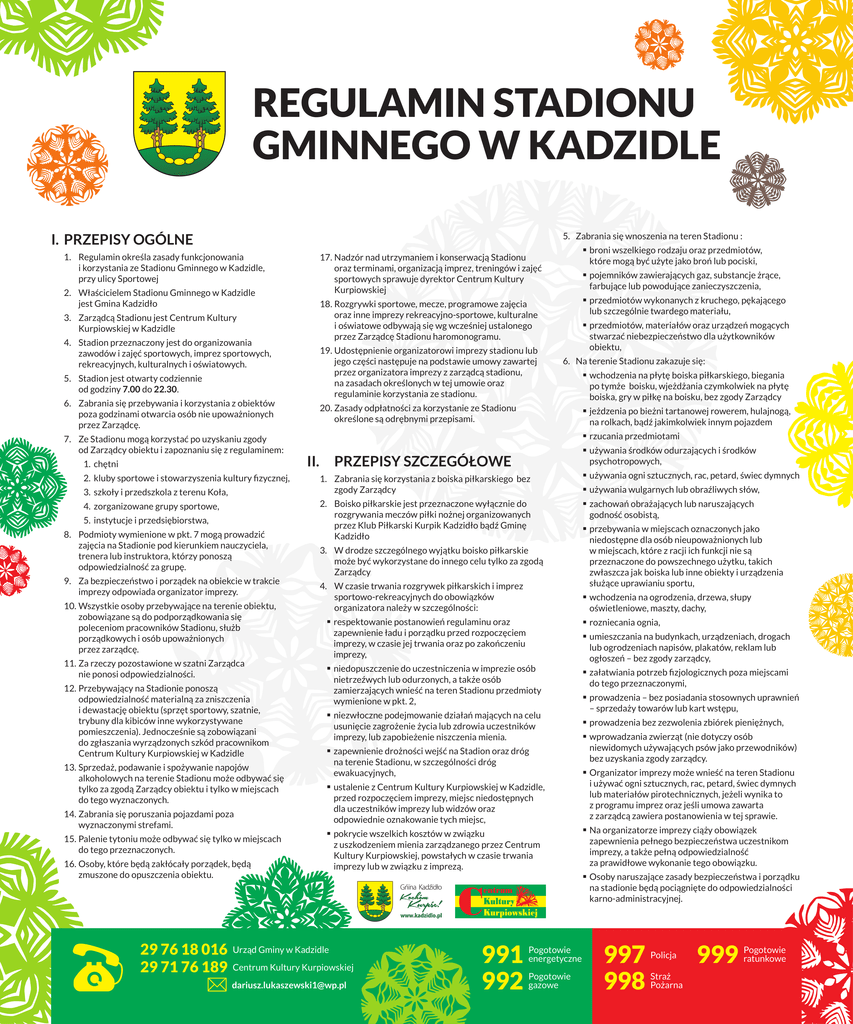 REGULAMIN STADIONU GMINNEGO W KADZIDLE 5. Zabrania się wnoszenia na teren Stadionu : I. PRZEPISY OGÓLNE 1. Regulamin określa zasady funkcjonowania i korzystania ze Stadionu Gminnego w Kadzidle, przy ulicy Sportowej 17. Nadzór nad utrzymaniem i konserwacją Stadionu oraz terminami, organizacją imprez, treningów i zajęć sportowych sprawuje dyrektor Centrum Kultury Kurpiowskiej 2. Właścicielem Stadionu Gminnego w Kadzidle jest Gmina Kadzidło 4. Stadion przeznaczony jest do organizowania zawodów i zajęć sportowych, imprez sportowych, rekreacyjnych, kulturalnych i oświatowych. 19. Udostępnienie organizatorowi imprezy stadionu lub jego części następuje na podstawie umowy zawartej przez organizatora imprezy z zarządcą stadionu, na zasadach określonych w tej umowie oraz regulaminie korzystania ze stadionu. 5. Stadion jest otwarty codziennie od godziny 7.00 do 22.30. 6. Zabrania się przebywania i korzystania z obiektów poza godzinami otwarcia osób nie upoważnionych przez Zarządcę. 1. chętni 2. kluby sportowe i stowarzyszenia kultury fizycznej, 3. szkoły i przedszkola z terenu Koła, 4. zorganizowane grupy sportowe, 5. instytucje i przedsiębiorstwa, 8. Podmioty wymienione w pkt. 7 mogą prowadzić zajęcia na Stadionie pod kierunkiem nauczyciela, trenera lub instruktora, którzy ponoszą odpowiedzialność za grupę. 9. Za bezpieczeństwo i porządek na obiekcie w trakcie imprezy odpowiada organizator imprezy. 10. Wszystkie osoby przebywające na terenie obiektu, zobowiązane są do podporządkowania się poleceniom pracowników Stadionu, służb porządkowych i osób upoważnionych przez zarządcę. 11. Za rzeczy pozostawione w szatni Zarządca nie ponosi odpowiedzialności. 12. Przebywający na Stadionie ponoszą odpowiedzialność materialną za zniszczenia i dewastację obiektu (sprzęt sportowy, szatnie, trybuny dla kibiców inne wykorzystywane pomieszczenia). Jednocześnie są zobowiązani do zgłaszania wyrządzonych szkód pracownikom Centrum Kultury Kurpiowskiej w Kadzidle 13. Sprzedaż, podawanie i spożywanie napojów alkoholowych na terenie Stadionu może odbywać się tylko za zgodą Zarządcy obiektu i tylko w miejscach do tego wyznaczonych. 14. Zabrania się poruszania pojazdami poza wyznaczonymi strefami. 15. Palenie tytoniu może odbywać się tylko w miejscach do tego przeznaczonych. które mogą być użyte jako broń lub pociski, pojemników zawierających gaz, substancje żrące, farbujące lub powodujące zanieczyszczenia, przedmiotów wykonanych z kruchego, pękającego 18. Rozgrywki sportowe, mecze, programowe zajęcia oraz inne imprezy rekreacyjno-sportowe, kulturalne i oświatowe odbywają się wg wcześniej ustalonego przez Zarządcę Stadionu haromonogramu. 3. Zarządcą Stadionu jest Centrum Kultury Kurpiowskiej w Kadzidle 7. Ze Stadionu mogą korzystać po uzyskaniu zgody od Zarządcy obiektu i zapoznaniu się z regulaminem: broni wszelkiego rodzaju oraz przedmiotów, lub szczególnie twardego materiału, przedmiotów, materiałów oraz urządzeń mogących stwarzać niebezpieczeństwo dla użytkowników obiektu, 6. Na terenie Stadionu zakazuje się: 20. Zasady odpłatności za korzystanie ze Stadionu określone są odrębnymi przepisami. II. na rolkach, bądź jakimkolwiek innym pojazdem rzucania przedmiotami używania środków odurzających i środków psychotropowych, 1. Zabrania się korzystania z boiska piłkarskiego bez zgody Zarządcy 2. Boisko piłkarskie jest przeznaczone wyłącznie do rozgrywania meczów piłki nożnej organizowanych przez Klub Piłkarski Kurpik Kadzidło bądź Gminę Kadzidło 3. W drodze szczególnego wyjątku boisko piłkarskie może być wykorzystane do innego celu tylko za zgodą Zarządcy 4. W czasie trwania rozgrywek piłkarskich i imprez sportowo-rekreacyjnych do obowiązków organizatora należy w szczególności: niedopuszczenie do uczestniczenia w imprezie osób nietrzeźwych lub odurzonych, a także osób zamierzających wnieść na teren Stadionu przedmioty wymienione w pkt. 2, niezwłoczne podejmowanie działań mających na celu usunięcie zagrożenie życia lub zdrowia uczestników imprezy, lub zapobieżenie niszczenia mienia. zapewnienie drożności wejść na Stadion oraz dróg na terenie Stadionu, w szczególności dróg ewakuacyjnych, przed rozpoczęciem imprezy, miejsc niedostępnych dla uczestników imprezy lub widzów oraz odpowiednie oznakowanie tych miejsc, lub ogrodzeniach napisów, plakatów, reklam lub ogłoszeń – bez zgody zarządcy, załatwiania potrzeb fizjologicznych poza miejscami do tego przeznaczonymi, prowadzenia – bez posiadania stosownych uprawnień – sprzedaży towarów lub kart wstępu, prowadzenia bez zezwolenia zbiórek pieniężnych, wprowadzania zwierząt (nie dotyczy osób niewidomych używających psów jako przewodników) bez uzyskania zgody zarządcy. i używać ogni sztucznych, rac, petard, świec dymnych lub materiałów pirotechnicznych, jeżeli wynika to z programu imprez oraz jeśli umowa zawarta z zarządcą zawiera postanowienia w tej sprawie. Na organizatorze imprezy ciąży obowiązek pokrycie wszelkich kosztów w związku z uszkodzeniem mienia zarządzanego przez Centrum Kultury Kurpiowskiej, powstałych w czasie trwania imprezy lub w związku z imprezą. [email protected] niedostępne dla osób nieupoważnionych lub w miejscach, które z racji ich funkcji nie są przeznaczone do powszechnego użytku, takich zwłaszcza jak boiska lub inne obiekty i urządzenia służące uprawianiu sportu, Organizator imprezy może wnieść na teren Stadionu ustalenie z Centrum Kultury Kurpiowskiej w Kadzidle, Centrum Kultury Kurpiowskiej przebywania w miejscach oznaczonych jako rozniecania ognia, umieszczania na budynkach, urządzeniach, drogach zapewnienie ładu i porządku przed rozpoczęciem imprezy, w czasie jej trwania oraz po zakończeniu imprezy, zapewnienia pełnego bezpieczeństwa uczestnikom imprezy, a także pełną odpowiedzialność za prawidłowe