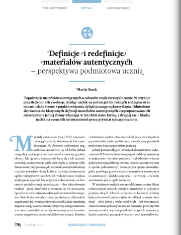 wielojęzyczność metoda nauczanie dzieci Definicje i redefinicje materiałów autentycznych – perspektywa podmiotowa ucznia Maciej Smuk Popularność materiałów autentycznych w ostatnim czasie niezwykle rośnie. W artykule prześledzono ich ewolucję, kładąc nacisk na potencjał ich różnych rodzajów oraz mocne i słabe strony z punktu widzenia dydaktycznego wykorzystania. Odniesiono się również do klasycznych definicji materiałów autentycznych i zaproponowano ich roszerzenie: z jednej strony włączając w ten zbiór nowe formy, z drugiej zaś – kładąc nacisk na ocenę ich autentyczności przez pryzmat sytuacji uczniów. ateriały autentyczne (dalej: MA), nazywane też oryginalnymi, źródłowymi lub zapożyczonymi (fr. document authentique; ang. authentic document), są od kilku dekad integralną częścią procesu nauczania/uczenia się języków obcych. Ich ogromna popularność łączy się z ich atutami: pozwalają zaprezentować wiele cech języka w jednym tylko dokumencie, przygotowują do socjokulturowej konfrontacji z przedstawicielami danej kultury, rozwijają kompetencje ogólne (niejęzykowe) uczniów, ich wykorzystanie zwiększa atrakcyjność zajęć itd. Nie są jednak wolne od wad, a w literaturze specjalistycznej przewijają się – choć zdecydowanie rzadziej – głosy nieufności w stosunku do ich potencjału. Specyficzne uwarunkowania danego kontekstu kulturowego, zbyt duża liczba nowych struktur językowych, słaba jakość nagrań audio itd. to między innymi czynniki, które utrudniają skupienie uwagi na zawartości merytorycznej danego materiału, a to może prowadzić do utraty motywacji przez uczniów, a nawet zanegowania sensowności ich wykorzystania. Rzetelna [ 76 ] i wielostronna analiza celów oraz technik pracy pozwala jednak przeciwdziałać takim problemom, a niezliczone poradniki praktyczne służą nauczycielom pomocą. Jednak pomimo długich i owocnych doświadczeń w wykorzystaniu MA kwestią kontrowersyjną jest nadal – przynajmniej w mojej ocenie – ich zakres pojęciowy. Trudno bowiem w istocie podać precyzyjną definicję terminu materiał autentyczny oraz w sposób jednoznaczny i koncepcyjnie spójny stwierdzić, gdzie przebiega granica między materiałem uznawanym za autentyczny i dydaktyczny oraz – co więcej – czy takie rozróżnienie jest w ogóle konieczne. W niniejszym artykule zostanie dokonany swoisty bilans wykorzystania różnych rodzajów materiałów w dydaktyce języków obcych. Obecne w literaturze fachowej definicje będą zaś stanowić punkt wyjścia do refleksji na temat nieco innej – choć jednej z wielu możliwych – ich interpretacji. Akcent zostanie położony na analizie dokonanej przez pryzmat sytuacji uczniów: wyzwań przed nimi stojących, motywacji, dążeń, trudności, percepcji wybranych cech materiałów itd. dydaktyka i metodyka nauczanie dzieci metoda Klasyczne ujęcie terminu materiał autentyczny w glottodydaktyce Znaczenie terminu MA wydaje się nie budzić – przynajmniej na pierwszy rzut oka – nawet najmniejszych kontrowersji; każdy, kto ma do czynienia z nauczaniem języków obcych wie bowiem (choćby intuicyjnie), jakie materiały należą do zbioru MA, a które nie mieszczą się w nim. Przegląd źródeł specjalistycznych, tj. słowników, podręczników i artykułów glottodydaktycznych oraz poradników skierowanych do nauczycieli języków obcych, pozwala doprecyzować ich cechy. 1. Obejmują one różne formy: ustne, pisane, elektroniczne, ikonograficzne, przedmioty itd. 2. Są związane z różnymi sferami życia: codzienną obyczajowością, kulturą, życiem zawodowym itd. 3. Powstają w tzw. naturalnych sytuacjach komunikacyjnych – termin naturalny jest przeciwstawiany słowu dydaktyczny. 4. Ich powstawaniu przyświeca tzw. realny cel komunikacyjny – podobnie jak w poprzednim przypadku, realny traktuje się jako antonim wyrazu dydaktyczny. 5. Są tworzone przez rodzimych użytkowników języka. 6. Są skierowane w pierwszej kolejności do rodzimych użytkowników języka. 7. Nie są oryginalnie przeznaczone do wykorzystania w nauce języków obcych. 8. Ich pierwotnym celem nie jest przekazanie wiedzy językowej w znaczeniu dosłownym. 9. Ze względu na poruszane tematy nazywa się je też materiałami społecznymi. 10.W zależności od tego, czy zostają poddane modyfikacjom, czy nie określa się je mianem dydaktyzowane i niedydaktyzowane lub surowe (Cuq 2003; Cuq i Gruca 2005; Galisson i Coste 1976; Girault 1999; Pfeiffer 2001 i in.). Ewolucja koncepcyjna materiałów autentycznych Pomimo że wprowadzenie MA łączy się z podejściem komunikacyjnym, to nie należy kwestionować ich miejsca w starszych koncepcjach kształcenia, na przykład w metodzie gramatyczno-tłumaczeniowej (teksty literackie) lub w metodzie audiowizualnej (elementy ikonograficzne). Nie ulega natomiast wątpliwości, że to początek lat 70. XX wieku przynosi największe zmiany w wykorzystywaniu materiałów. We Francji zbiega się to z dyskusją na temat nauczania języka francuskiego jako obcego na poziomie wyższym niż podstawowy (niveau 2) wielojęzyczność oraz intencją integrowania wiedzy językowej z pewną orientacją socjokulturową (Cuq i Gruca 2005:427). W czerwcu 1970 r. ukazuje się numer specjalny „Le Français dans le Monde” (Nataf 1970), w którym rekomenduje się regularne korzystanie na tym etapie nauczania z MA, a głównie ze współczesnych tekstów nieliterackich. Sukces tego typu tekstu jest zrozumiały, ponieważ wiąże się z jego potencjałem. Zgodnie z powszechnym przekonaniem teksty nieliterackie ukazują złożoność i bogactwo języka, szerokie spektrum jego odmian i stylów, okoliczności warunkujące dany model komunikacji (atrybuty różnych typów dyskursu i rejestrów wypowiedzi, metaforyczność, polisemiczność, emocjonalne nacechowanie wypowiedzi, obecność idiolektów, wariantywność geograficzna itd.). W materiałach celowo prz