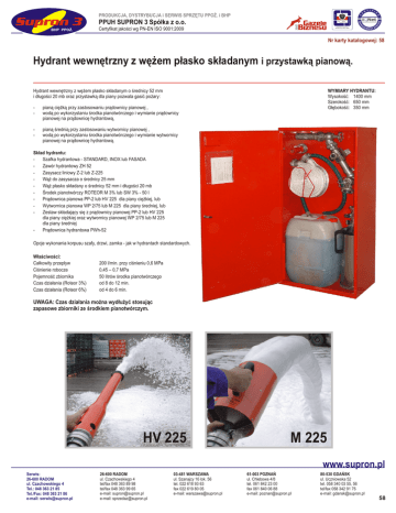 ZARZĄDZANIA SYSTEM PRODUKCJA, DYSTRYBUCJA i SERWIS SPRZĘTU PPOŻ. i BHP PPUH SUPRON 3 Spółka z o.o. Certyfikowany na zgodność z: Certyfikat jakości wg PN-EN ISO 9001:2009 PN-EN ISO 9001:2009 Nr karty katalogowej: 58 Hydrant wewnętrzny z wężem płasko składanym i przystawką pianową. WYMIARY HYDRANTU: Wysokość: 1400 mm Szerokość: 650 mm Głębokość: 350 mm Hydrant wewnętrzny z wężem płasko składanym o średnicy 52 mm i długości 20 mb oraz przystawką dla piany pozwala gasić pożary: - pianą ciężką przy zastosowaniu prądownicy pianowej , wodą po wykorzystaniu środka pianotwórczego i wymianie prądownicy pianowej na prądownicę hydrantową, - pianą średnią przy zastosowaniu wytwornicy pianowej , wodą po wykorzystaniu środka pianotwórczego i wymianie wytwornicy pianowej na prądownicę hydrantową. Skład hydrantu: - Szafka hydrantowa - STANDARD, INOX lub FASADA - Zawór hydrantowy ZH 52 - Zasysacz liniowy Z-2 lub Z-225 - Wąż do zasysacza o średnicy 25 mm - Wąż płasko składany o średnicy 52 mm i długości 20 mb - Środek pianotwórczy ROTEOR M 3% lub SW 3% - 50 l - Prądownica pianowa PP-2 lub HV 225 dla piany ciężkiej, lub - Wytwornica pianowa WP 2/75 lub M 225 dla piany średniej, lub - Zestaw składający się z prądownicy pianowej PP-2 lub HV 225 dla piany ciężkiej oraz wytwornicy pianowej WP 2/75 lub M 225 dla piany średniej - Prądownica hydrantowa PWh-52 Opcje wykonania korpusu szafy, drzwi, zamka - jak w hydrantach standardowych. Właściwości: Całkowity przepływ Ciśnienie robocze Pojemność zbiornika Czas działania (Roteor 3%) Czas działania (Roteor 6%) 200 l/min. przy ciśnieniu 0,6 MPa 0,45 – 0,7 MPa 50 litrów środka pianotwórczego od 8 do 12 min. od 4 do 6 min. UWAGA: Czas działania można wydłużyć stosując zapasowe zbiorniki ze środkiem pianotwórczym. HV 225 M 225 www.supron.pl Serwis: 26-600 RADOM ul. Czachowskiego 4 Tel.: 048 363 21 85 Tel./Fax: 048 363 21 86 e-mail: [email protected] 26-600 RADOM ul. Czachowskiego 4 tel/fax 048 363 89 98 tel/fax 048 363 99 65 e-mail: [email protected] e-mail: [email protected] 03-481 WARSZAWA ul. Szanajcy 16 lok. 56 tel. 022 618 93 63 fax 022 619 80 05 e-mail: [email protected] 61-003 POZNAŃ ul. Chlebowa 4/8 tel. 061 842 23 00 fax 061 840 06 88 e-mail: [email protected] 80-530 GDAŃSK ul. Uczniowska 52 tel. 058 340 03 55, 56 tel/fax 058 342 91 75 e-mail: [email protected] 58