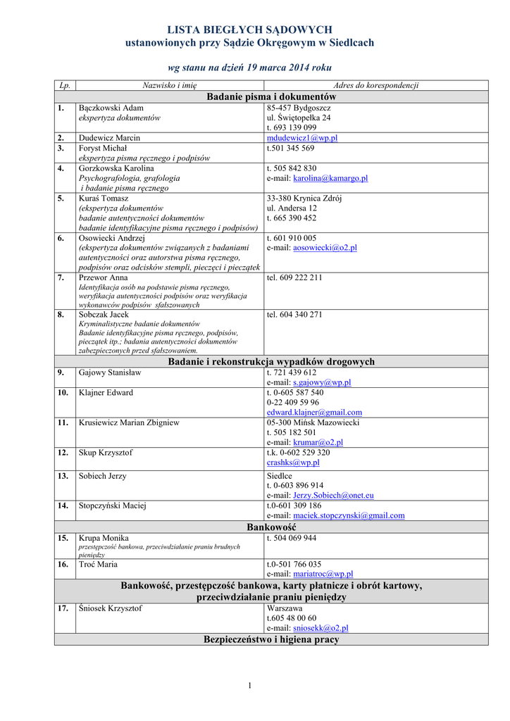 LISTA BIEGŁYCH SĄDOWYCH ustanowionych przy Sądzie Okręgowym w Siedlcach wg stanu na dzień 19 marca 2014 roku Nazwisko i imię Lp. Adres do korespondencji Badanie pisma i dokumentów 1. Bączkowski Adam ekspertyza dokumentów 2. 3. Dudewicz Marcin Foryst Michał ekspertyza pisma ręcznego i podpisów Gorzkowska Karolina Psychografologia, grafologia i badanie pisma ręcznego Kuraś Tomasz (ekspertyza dokumentów badanie autentyczności dokumentów badanie identyfikacyjne pisma ręcznego i podpisów) Osowiecki Andrzej (ekspertyza dokumentów związanych z badaniami autentyczności oraz autorstwa pisma ręcznego, podpisów oraz odcisków stempli, pieczęci i pieczątek Przewor Anna 4. 5. 6. 7. 85-457 Bydgoszcz ul. Świętopełka 24 t. 693 139 099 [email protected] t.501 345 569 t. 505 842 830 e-mail: [email protected] 33-380 Krynica Zdrój ul. Andersa 12 t. 665 390 452 t. 601 910 005 e-mail: [email protected] tel. 609 222 211 Identyfikacja osób na podstawie pisma ręcznego, weryfikacja autentyczności podpisów oraz weryfikacja wykonawców podpisów sfałszowanych 8. Sobczak Jacek tel. 604 340 271 Kryminalistyczne badanie dokumentów Badanie identyfikacyjne pisma ręcznego, podpisów, pieczątek itp.; badania autentyczności dokumentów zabezpieczonych przed sfałszowaniem. Badanie i rekonstrukcja wypadków drogowych 9. Gajowy Stanisław 10. Klajner Edward 11. Krusiewicz Marian Zbigniew 12. Skup Krzysztof 13. Sobiech Jerzy 14. Stopczyński Maciej t. 721 439 612 e-mail: [email protected] t. 0-605 587 540 0-22 409 59 96 [email protected] 05-300 Mińsk Mazowiecki t. 505 182 501 e-mail: [email protected] t.k. 0-602 529 320 [email protected] Siedlce t. 0-603 896 914 e-mail: [email protected] t.0-601 309 186 e-mail: [email protected] Bankowość 15. Krupa Monika t. 504 069 944 przestępczość bankowa, przeciwdziałanie praniu brudnych pieniędzy 16. Troć Maria t.0-501 766 035 e-mail: [email protected] Bankowość, przestępczość bankowa, karty płatnicze i obrót kartowy, przeciwdziałanie praniu pieniędzy 17. Śniosek Krzysztof Warszawa t.605 48 00 60 e-mail: [email protected] Bezpieczeństwo i higiena pracy 1 18. Chmielewski Jarosław 19. Młynarska Henryka 20. Dr inż. Stawiarski Przemysław budownictwo i materiały budowlane bezpieczeństwo i higiena pracy przy wykonywaniu robót budowlanych 21. Kozera Mariusz 22. Kozera Mariusz Łosie ul. Pliszki 11 05-250 Radzymin woj. mazowieckie t.0-501 484 586 e-mail: [email protected] 21-306 Czemierniki ul. Gęsia 30 t. 663 461 699 e-mail: [email protected] t. 0-603 324 300 [email protected] www.opiniesadowe.pl Badanie procesu inwestycyjnego w budownictwie drogowym 05-300 Mińsk Mazowiecki ul. Andriollego 10 t. 601 640 286 e-mail: [email protected] Budownictwo drogowe Projektowanie, sprawdzanie projektów architektonicznobudowlanych, sprawowanie nadzoru autorskiego w specjalności drogowej; kierowanie budową lub innymi robotami budowalnymi w specjalności drogowej; kierowanie wytwarzaniem konstrukcyjnych elementów budowalnych oraz nadzoru i kontroli technicznej wytwarzania tych elementów w specjalności drogowej; wykonywanie nadzoru inwestorskiego w specjalności drogowej; sprawowanie kontroli technicznej utrzymania obiektów budowlanych w specjalności drogowej 05-300 Mińsk Mazowiecki ul. Andriollego 10 t. 601 640 286 e-mail: [email protected] Budownictwo lądowe 23. Gadomski Jerzy 24. Firysiuk Krzysztof budownictwo ogólne, wycena wartości robót, obiektów i budowli, ocena stanu technicznego obiektów, budowli, budynków, budownictwo zabytkowe, kosztorysowanie robót budowlano-montażowych, kosztorysowanie, umowy w budownictwie i prawo budowlane 08-110 Siedlce ul. Wyszyńskiego 21A m.45 tel. 25 633-89-51 0-605-856-009 e-mail: [email protected] t. 602 735 689 fax. 81 75 00 314 Budownictwo ogólne 25. Brzozowski Andrzej 26. Duciak Maria Teresa 27. Firysiuk Krzysztof budownictwo ogólne, wycena wartości robót, obiektów i budowli, ocena stanu technicznego obiektów, budowli, budynków, budownictwo zabytkowe, kosztorysowanie robót budowlano-montażowych, kosztorysowanie, umowy w budownictwie i prawo budowlane 2 08-400 Garwolin ul. Asnyka 11A t.25 6821727 t. 602 297 454 08-119 Siedlce ul. B.Chrobrego 2 m 43 t.(0-25) 632 04 38 0-502 567 660 e-mail: [email protected] t. 602 735 689 fax. 81 75 00 314 28. Gadomski Jerzy 29. 30. Dr inż. Stawiarski Przemysław budownictwo i materiały budowlane bezpieczeństwo i higiena pracy przy wykonywaniu robót budowlanych Sztukiewicz Małgorzata 31. Dr. Grzyb Sebastian 08-110 Siedlce ul. Wyszyńskiego 21A m.45 tel. 25 633-89-51 0-605-856-009 e-mail: [email protected] t. 0-603 324 300 [email protected] www.opiniesadowe.pl 08-110 Siedlce ul. Katedralna 21A [email protected] Chemia Chemia polimerów, chemia leków, technologia postaci leku, farmakologia, farmakognozja, chemia analityczna, analityka chemiczna, analiza żywności, chemia organiczna, synteza chemiczna, identyfikacja związków chemicznych. t. 505 456 245 [email protected] Chirurgia ogólna 32. Kraska Waldemar 33. Romańczuk Mikołaj 34. Niemirski Jacek 35. Sajdowska Krystyna 36. Gilewski Ryszard 08-330 Kosów Lacki ul. Parkowa 10 t. 602 452 393 e-mail: [email protected] t. 0-603 896 949 Czas pracy kierowcy 08-300 Sokołów Podlaski ul. Spacerowa 20 t. 506 159 725 e-mail: [email protected] Daktyloskopia (kryminalistyczne badanie układu linii papilarnych) 08-110 Siedlce ul. Jasna 8 t.0-602 429 210 [email protected] Drobiarstwo 03-185 Warszawa ul. Erazma z Zakroczymia 19 m 22 t. 602 228 321 e-mail: [email protected] Drób grzebiący (kury mięsne i nieśne oraz indyki) Ekonomika przedsiębiorstw 37. Krupa Monika t. 504 069 944 organizacja i zarządzanie przedsiębiorstwem, kontrola i audyt procesów i dokumentacji 38. Zielnik Alicja Finanse i ekonomika przedsiębiorstw (organizacja i zarządzanie przedsiębiorstwem, badanie planów połączeń podmiotów) t. 602 344 005 e-mail: [email protected] Elektronika i diagnostyka pojazdów 39. Poletyło