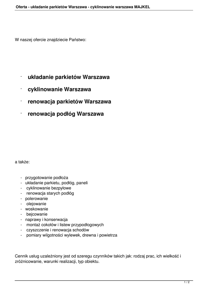 Oferta - układanie parkietów Warszawa - cyklinowanie warszawa MAJKEL W naszej ofercie znajdziecie Państwo: - układanie parkietów Warszawa - cyklinowanie Warszawa - renowacja parkietów Warszawa - renowacja podłóg Warszawa a także: - przygotowanie podłoża układanie parkietu, podłóg, paneli cyklinowanie bezpyłowe renowacja starych podłóg polerowanie olejowanie woskowanie bejcowanie naprawy i konserwacja montaż cokołów i listew przypodłogowych czyszczenie i renowacja schodów pomiary wilgotności wylewek, drewna i powietrza Cennik usług uzależniony jest od szeregu czynników takich jak: rodzaj prac, ich wielkość i zróżnicowanie, warunki realizacji, typ obiektu. 1/2 Oferta - układanie parkietów Warszawa - cyklinowanie warszawa MAJKEL Ceny ważniejszych usług (mogą one podlegać indywidualnym negocjacjom): - usługa kompleksowa: gruntowanie, układanie, cyklinowanie bezpyłowe i trzykrotne lakierowanie parkietu, mozaiki i podłóg egzotycznych - 60 zł/m2 - cyklinowanie, szpachlowanie, polerowanie, lakierowanie - 30-40 zł/m2 - cyklinowanie, olejowanie, bejcowanie - 30-40 zł/m2 - układanie parkietu, podłóg egzotycznych - 30-40 zł/m2 - renowacja lekko porysowanego parkietu - polerowanie i lakierowanie - 20-25 zł/m2 - montaż listew lub cokołów - 10-20 zł / metr bieżący - czyszczenie i renowacja schodów - samych stopni (trepów) - 60-100 zł za stopień (zależnie od szerokości) - stopni razem z podstopniami - 100-140 zł za stopień - barwienie podłóg (bejca, wosk koloryzujący) - 15 zł/m2 - konserwacja podłogi olejowanej - 10-15 zł/m2 Powyższe ceny nie zawierają cen materiałów (parkietu, szpachli, podkładu, lakieru, olejów). Cena razem z materiałami jest wyższa o 10-30 zł i zależy od rodzaju użytych materiałów, techniki wykonania oraz stanu podłogi. 2/2
