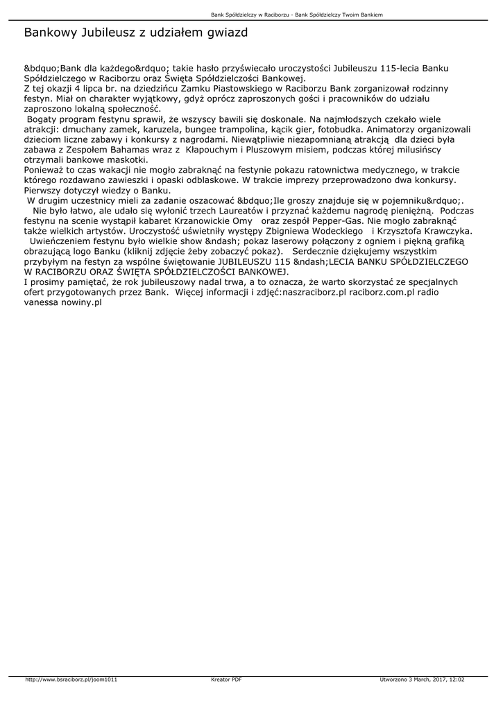 Bank Spółdzielczy w Raciborzu - Bank Spółdzielczy Twoim Bankiem Bankowy Jubileusz z udziałem gwiazd „Bank dla każdego” takie hasło przyświecało uroczystości Jubileuszu 115-lecia Banku Spółdzielczego w Raciborzu oraz Święta Spółdzielczości Bankowej. Z tej okazji 4 lipca br. na dziedzińcu Zamku Piastowskiego w Raciborzu Bank zorganizował rodzinny festyn. Miał on charakter wyjątkowy, gdyż oprócz zaproszonych gości i pracowników do udziału zaproszono lokalną społeczność. Bogaty program festynu sprawił, że wszyscy bawili się doskonale. Na najmłodszych czekało wiele atrakcji: dmuchany zamek, karuzela, bungee trampolina, kącik gier, fotobudka. Animatorzy organizowali dzieciom liczne zabawy i konkursy z nagrodami. Niewątpliwie niezapomnianą atrakcją dla dzieci była zabawa z Zespołem Bahamas wraz z Kłapouchym i Pluszowym misiem, podczas której milusińscy otrzymali bankowe maskotki. Ponieważ to czas wakacji nie mogło zabraknąć na festynie pokazu ratownictwa medycznego, w trakcie którego rozdawano zawieszki i opaski odblaskowe. W trakcie imprezy przeprowadzono dwa konkursy. Pierwszy dotyczył wiedzy o Banku. W drugim uczestnicy mieli za zadanie oszacować „Ile groszy znajduje się w pojemniku”. Nie było łatwo, ale udało się wyłonić trzech Laureatów i przyznać każdemu nagrodę pieniężną. Podczas festynu na scenie wystąpił kabaret Krzanowickie Omy oraz zespół Pepper-Gas. Nie mogło zabraknąć także wielkich artystów. Uroczystość uświetniły występy Zbigniewa Wodeckiego i Krzysztofa Krawczyka. Uwieńczeniem festynu było wielkie show – pokaz laserowy połączony z ogniem i piękną grafiką obrazującą logo Banku (kliknij zdjęcie żeby zobaczyć pokaz). Serdecznie dziękujemy wszystkim przybyłym na festyn za wspólne świętowanie JUBILEUSZU 115 –LECIA BANKU SPÓŁDZIELCZEGO W RACIBORZU ORAZ ŚWIĘTA SPÓŁDZIELCZOŚCI BANKOWEJ. I prosimy pamiętać, że rok jubileuszowy nadal trwa, a to oznacza, że warto skorzystać ze specjalnych ofert przygotowanych przez Bank. Więcej informacji i zdjęć:naszraciborz.pl raciborz.com.pl radio vanessa nowiny.pl http://www.bsraciborz.pl/joom1011 Kreator PDF Utworzono 3 March, 2017, 12:02