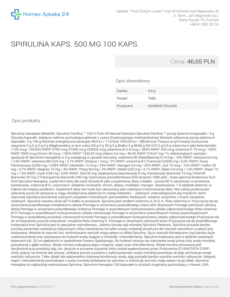Apteka " Pod Złotym Lwem" mgr M.Konstancja Majewska, dr n. farm. Jan Majewski sp.j. Stary Rynek 75, Poznań +48 61 852 30 24 SPIRULINA KAPS. 500 MG 100 KAPS. Cena: 46,65 PLN Opis słownikowy Dawka 0,5 g Postać TABL. Producent GINSENG POLAND Opis produktu Spirulina Hawajska-Składniki: Spirulina Pacifica ™ 100 % Pure All Natural Hawaiian Spirulina Pacifica ™ porcja dzienna 6 kapsułek / 3 g Otoczka kapsułki: żelatyna roślinna pochodząca głównie z sosny (Hydroxypropyl methylcellulose) Wartość odżywcza porcja dzienna 6 kapsułek/ 3 g 100 g Wartość energetyczna (energia) 49,3 kJ / 11,6 kcal 1643,33 kJ / 386,66 kcal Tłuszcz w tym kwasy tłuszczowe nasycone 0 g 0 g 0 g 0 g Węglowodany w tym cukry 0,9 g 0 g 30 g 0 g Białko 2 g 66,66 g Sól 0,012 g 0,4 g witamina A jako beta-karoten 1125 mcg/ 140,63% RWS* 6750 mcg 37500 mcg 225000 mcg witamina B12 9 mcg / 360% RWS* 300 mcg witamina K 75 mcg / 100% RWS* 2500 mcg Chrom 40 mcg / 100% RWS* 1333,33 mcg Żelazo 6,5 mg / 46,4% RWS* 216,67 mg *-% referencyjnych wartości spożycia W Spirulinie Hawajskiej w 3 g występują w sposób naturalny: witamina B2 (Ryboflawina) 0,14 mg / 10% RWS*, Niacyna 0,4 mg / 2,5% RWS*, witamina B6 0,03 mg / 2,1% RWS*, Biotyna 1 mcg / 2% RWS*, witamina B1 (Tiamina) 0,0035 mg / 0,3% RWS*, Kwas Pantotenowy 0,005 mg / 0,08% RWS*, Molibden 12 mcg / 24% RWS*, Mangan 0,4 mg / 20% RWS*, Jod 15 mcg / 10% RWS*, Fosfor 33 mg / 4,7% RWS*, Magnez 15 mg / 4% RWS*, Potas 60 mg / 3% RWS*, Miedź 0,02 mg / 2,1% RWS*, Selen 0,9 mcg / 1,6% RWS*, Wapń 10 mg / 1,3% RWS*, Cynk 0,09 mg / 0,9% RWS*, Sód 30 mg, Zeaksantyna (karotenoid) 9 mg, Karotenoidy (barwnik) 15 mg, Chlorofil (barwnik) 30 mg, C-Fikocyjanina (barwnik) 240 mg, Dysmutaza ponadtlenkowa SOD (enzym) 1080 jedn., Kwas gamma-linolenowy GLA 0,04 Spirulina Hawajska, suplement diety dla osób dorosłych jako uzupełnienie diety w białko - ponad 60 % zawartości w produkcie, karotenoidy, witaminę B12, witaminę K, składniki mineralne: chrom, żelazo, molibden, mangan. Dawkowanie: 1-6 tabletek dziennie, w trakcie lub między posiłkami. Suplement diety nie może być stosowany jako substytut zróżnicowanej diety. Nie należy przekraczać zalecanej porcji do spożycia w ciągu dniaSpirulina platensis to rodzaj niebiesko – zielonych, mikroskopijnych alg morskich, które stanowią naturalny koncentrat ważnych związków mineralnych, pierwiastków śladowych, witamin, enzymów i innych związków witalnych. Spirulina zawiera około 60 % białka w produkcie. Spirulina jest źródłem witaminy A, B12, K. Rola witaminy A: Przyczynia się do utrzymania prawidłowego metabolizmu żelaza Pomaga w utrzymaniu prawidłowego stanu błon śluzowych Pomaga zachować zdrową skórę Pomaga w utrzymaniu prawidłowego widzenia Pomaga w prawidłowym funkcjonowaniu układu odpornościowego Rola witaminy B12: Pomaga w prawidłowym funkcjonowaniu układu nerwowego Pomaga w utrzymaniu prawidłowych funkcji psychologicznych Pomaga w prawidłowej produkcji czerwonych krwinek Pomaga w prawidłowym funkcjonowaniu układu odpornościowego Przyczynia się do zmniejszenia uczucia zmęczenia i znużenia Rola witaminy K: Pomaga w utrzymaniu zdrowych kości Przyczynia się do prawidłowego krzepnięcia krwi Spirulina jest to specjalnie wyhodowany , jadalny szczep algi morskiej Spirulina Platensis. Spirulina posiada bardzo wysoką zawartość substancji odżywczych, który zawdzięcza nie tylko swojej unikalnej strukturze ale również warunkom w jakich jest hodowana. Właśnie te warunki tzw. kontrolowane warunki mają wpływ na skład Spiruliny. Są to warunki klimatyczne czyli bardzo duże nasłonecznienie oraz stosowana do hodowli woda, bogata w minerały i mikroelementy. Spirulina hodowana jest w płytkich otwartych basenach (ok. 20 cm głębokich) w sąsiedztwie Oceanu Spokojnego. Do hodowli stosuje się mieszankę wody pitnej oraz wody morskiej pozyskanej z głębi oceanu. Woda morska wzbogaca algę o magnez, wapń oraz mikroelementy. Woda morska stosowana jest dwukrotnie przy produkcji algi, tzn. jeszcze w procesie suszenia, który został opatentowany przez Producenta (CYANOTECH CORP., USA), jedyny na świecie taki proces. Unikalny proces suszenia z wykorzystaniem wody morskiej powoduje, że alga zachowuje swoje wartości odżywcze. Tylko dzięki tak odpowiednio dobranej kombinacji wody, alga posiada bardzo wysokie wartości odżywcze. Magnez, wapń i mikroelementy pochodzące z wody morskiej dodawane do spiruliny w trakcie jej wzrostu mają wpływ na jej skład. Spirulina Hawajska to najbardziej wartościowa Spirulina. Spirulina Hawajska 100 kapsułek to produkt oryginalny pochodzący z Hawaii, USA. Plik wygenerowano: 03-03-2017 Oprogramowanie sklepu: AptusShop Apteka " Pod Złotym Lwem" mgr M.Konstancja Majewska, dr n. farm. Jan Majewski sp.j. Stary Rynek 75, Poznań +48 61 852 30 24 Spirulina Hawajska 100 kapsułek 500 mg / 55 g Wyprodukowano w USA / Hawaii przez Cyanotech Corporation Dystrybutor Ginseng Poland Plik wygenerowano: 03-03-2017 Powered by TCPDF (www.tcpdf.org) Oprogramowanie sklepu: AptusShop